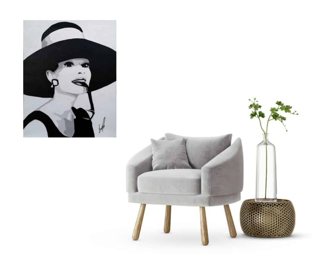 This is an acrylic painting of the actress Audrey Hepburn on canvas. It is based on only three colors; black, white and grey.