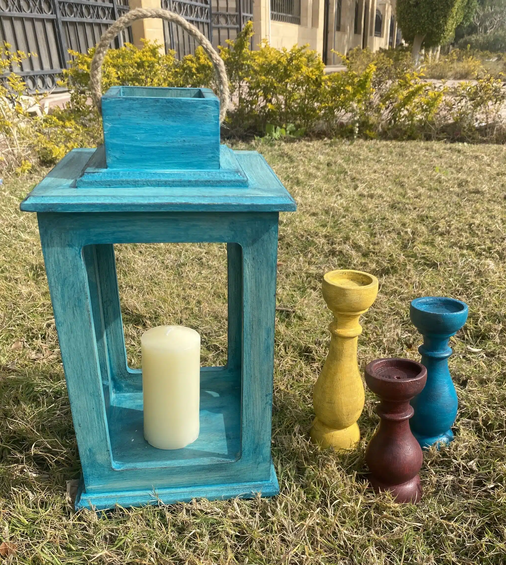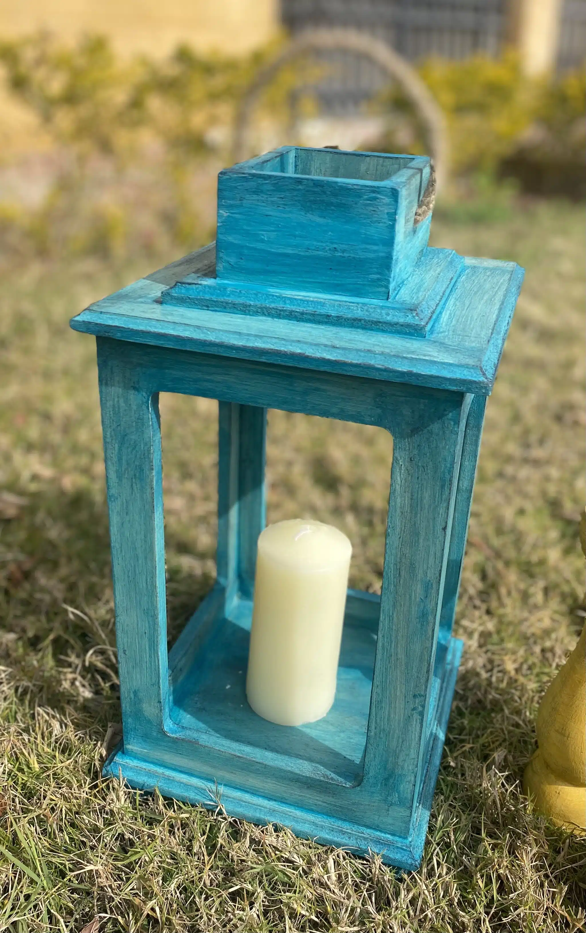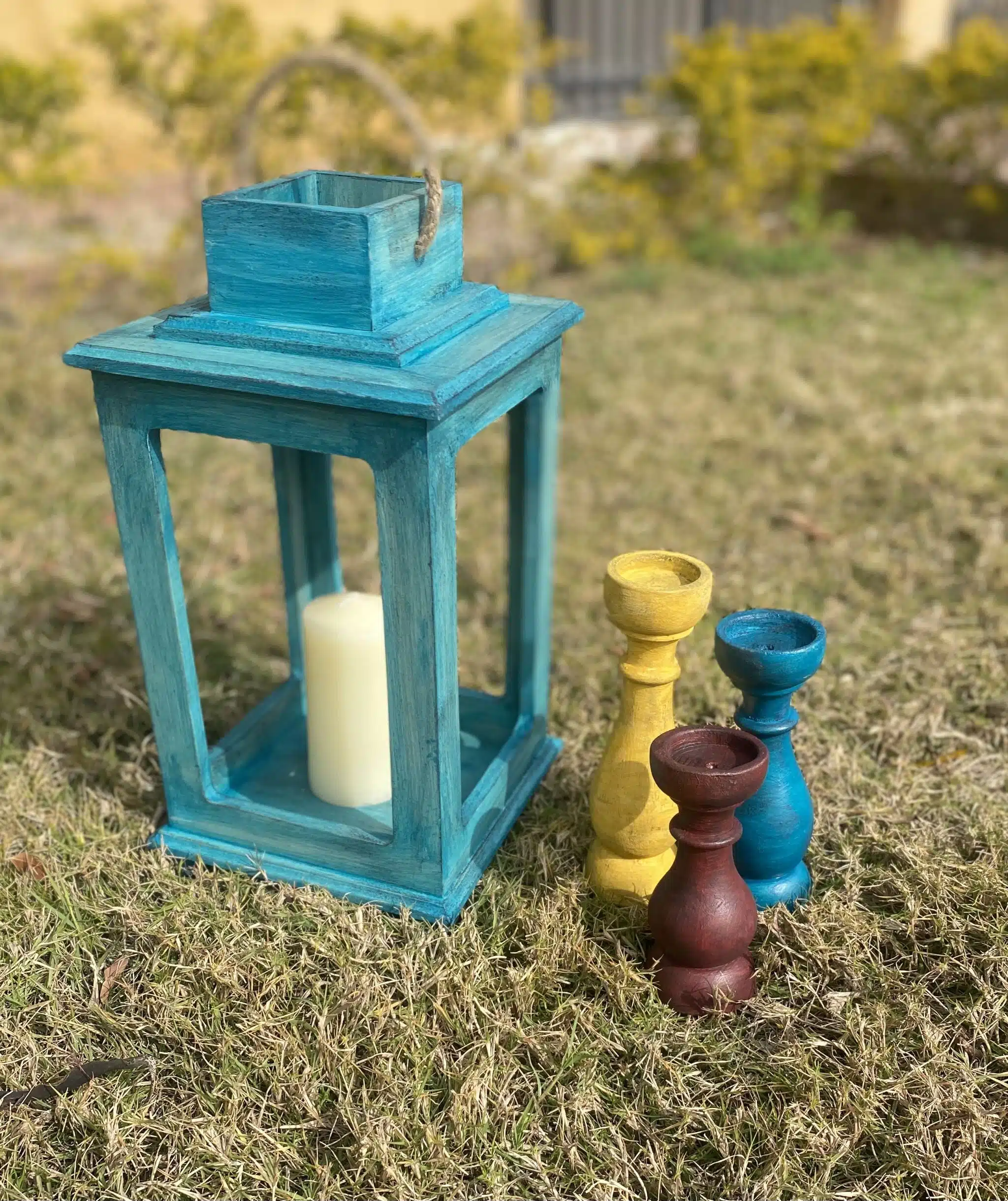 Wooden lantern in vintage aquamarine color