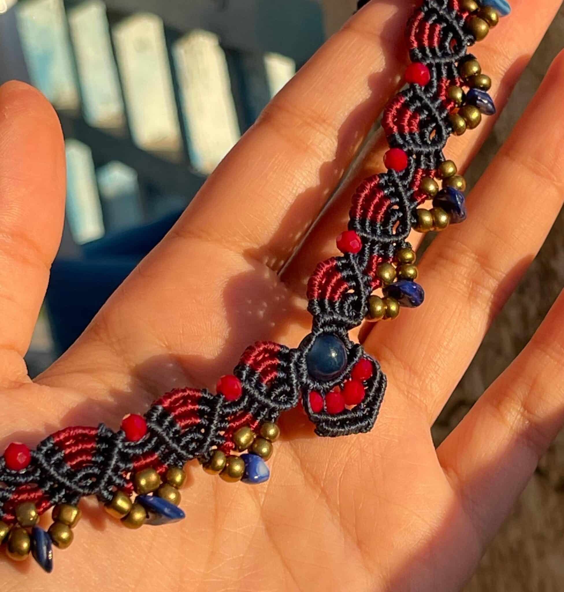 A handmade necklace created by Burgundy and navy cords mixed with brass and Azurite crystal stones.