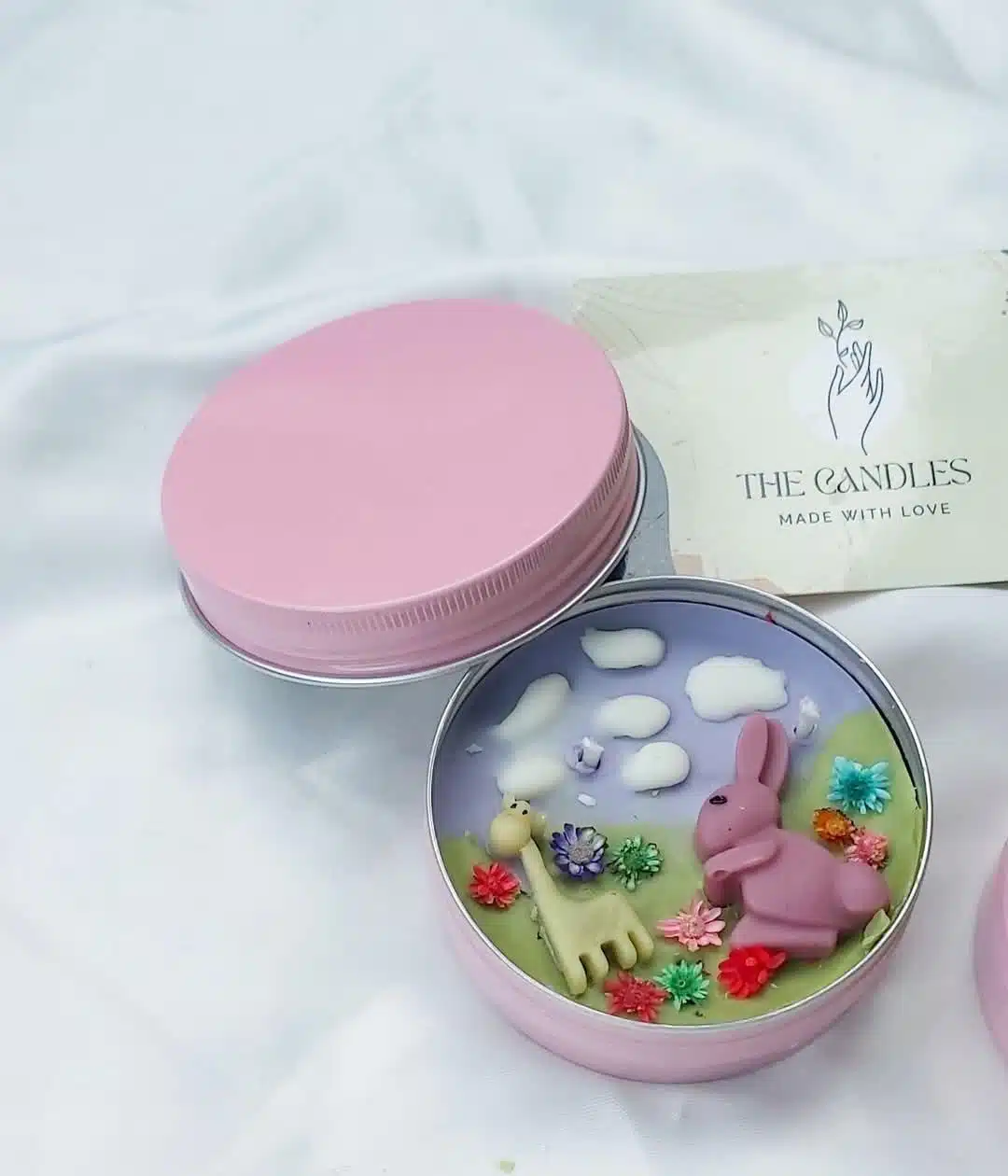 Baby shower candles with different animals and flowers you can choose the colour and scent and the colour for flowers and choice the colours for jar