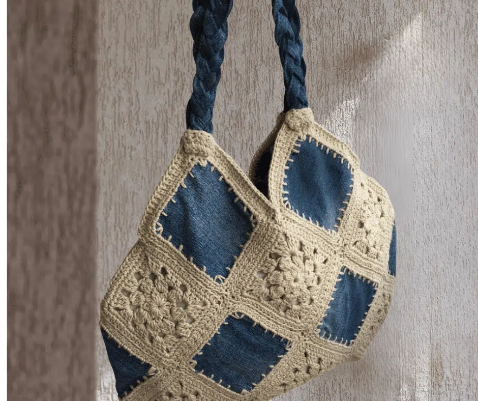 | Tote crochet bag mixed with jeans patches, inner lining with pockets and zipper. Dimensions: 45 x 40 cm |