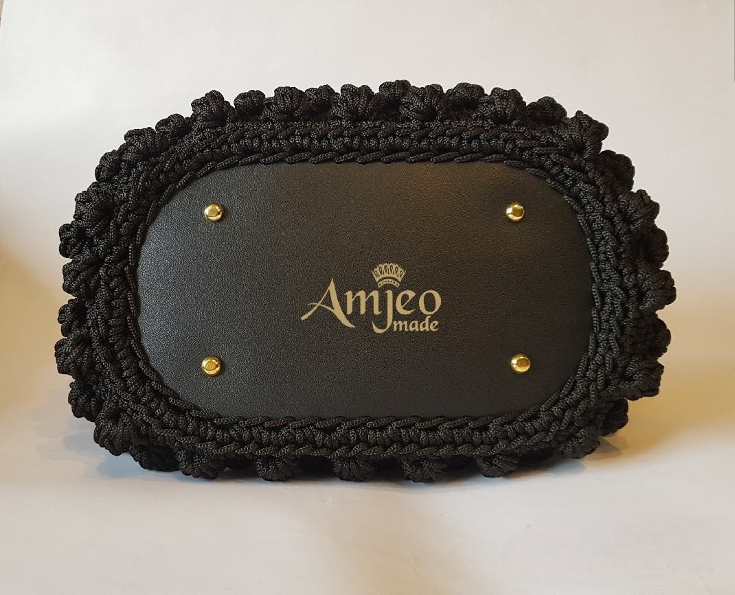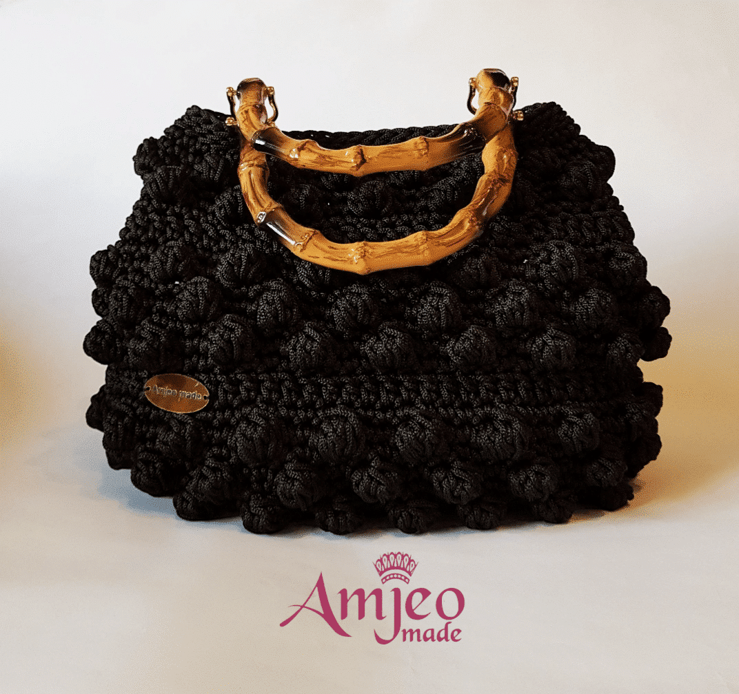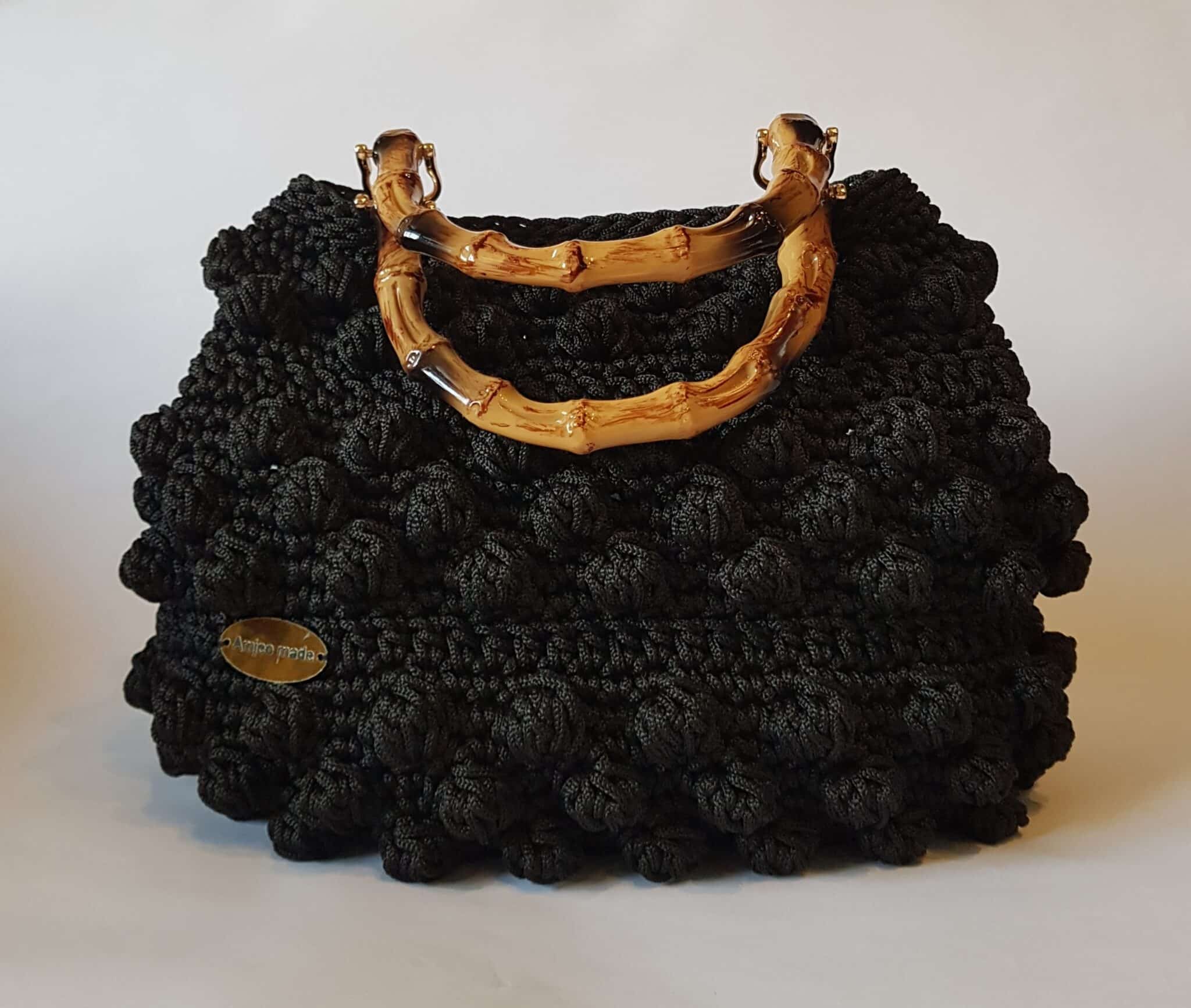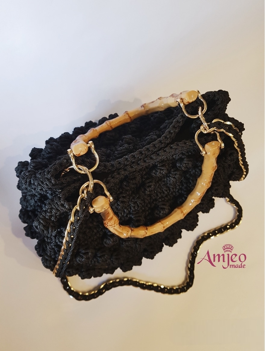 Handmade crochet bag made with soft macrame thread of high quality, leather base, acrylic bambo hands, small pocket inside, long gold chain and closed with a leather magnet.