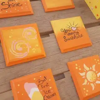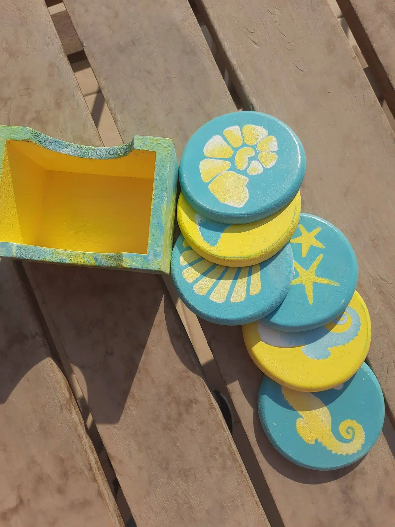 A set of 6 wooden hand-painted coasters + wooden box of “acrylic pouring”