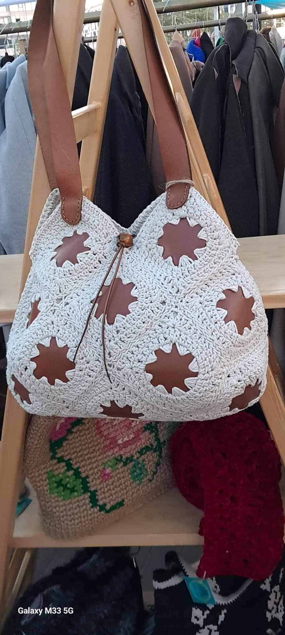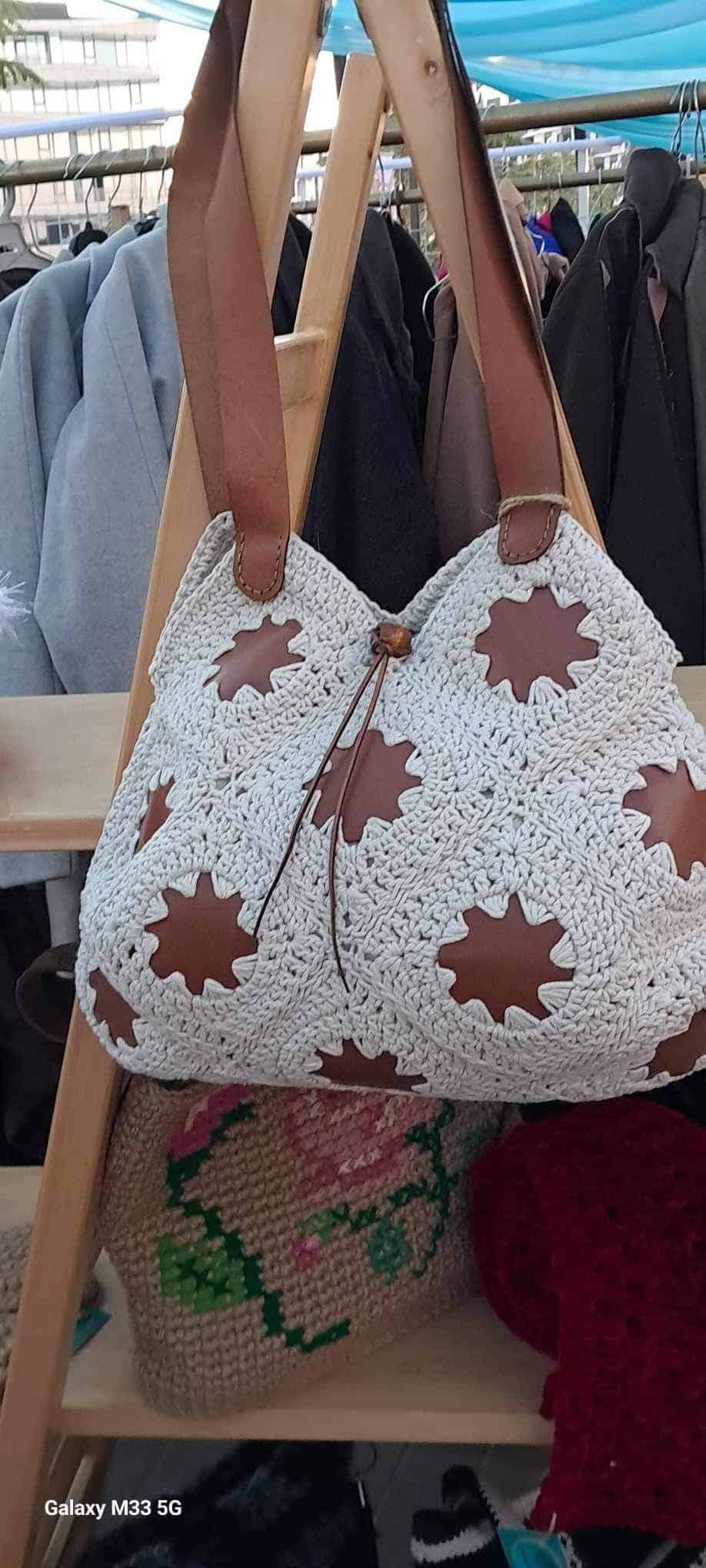 handmade crochet bag mixed with pure leather circles , pure leather handles
