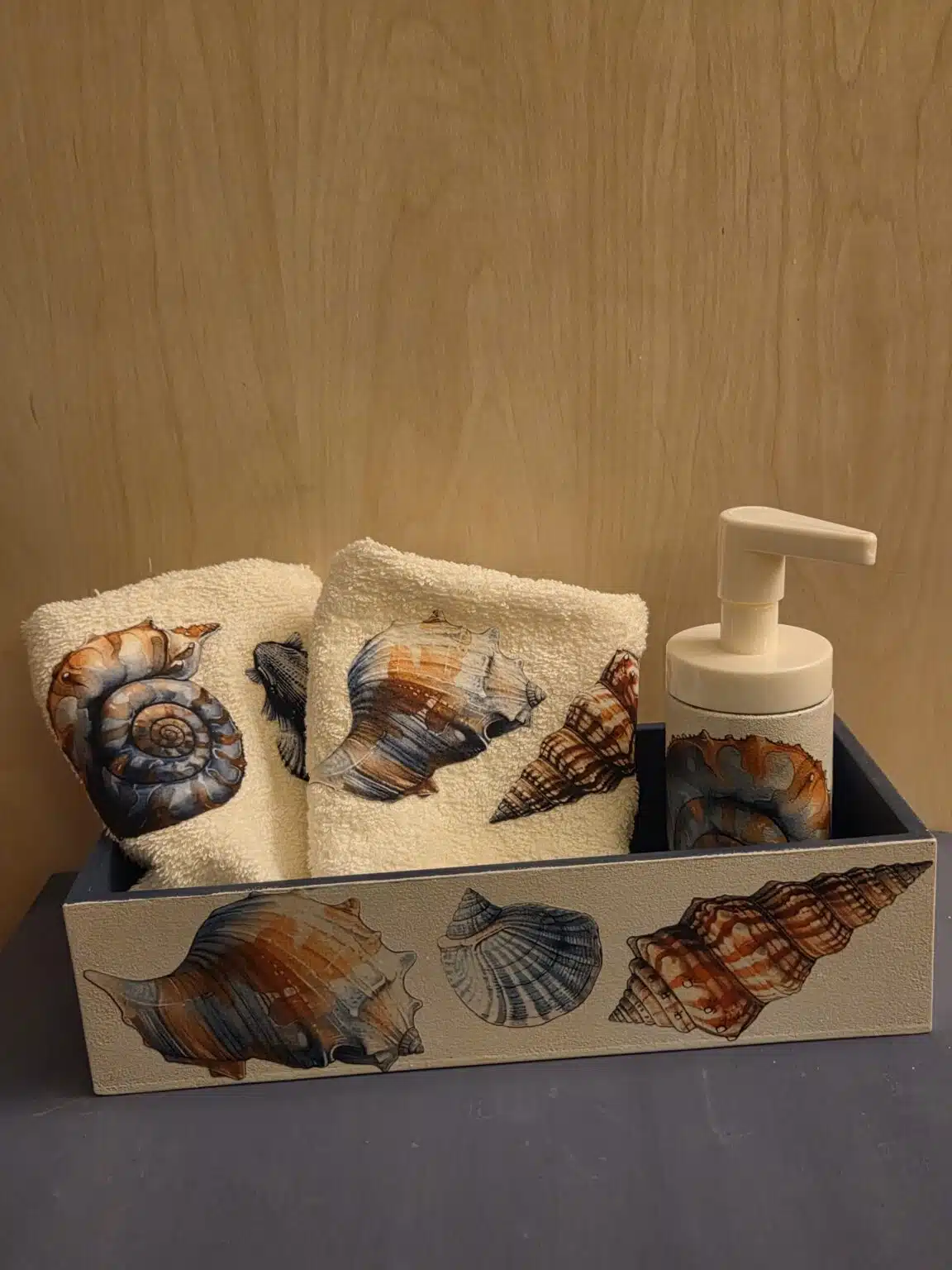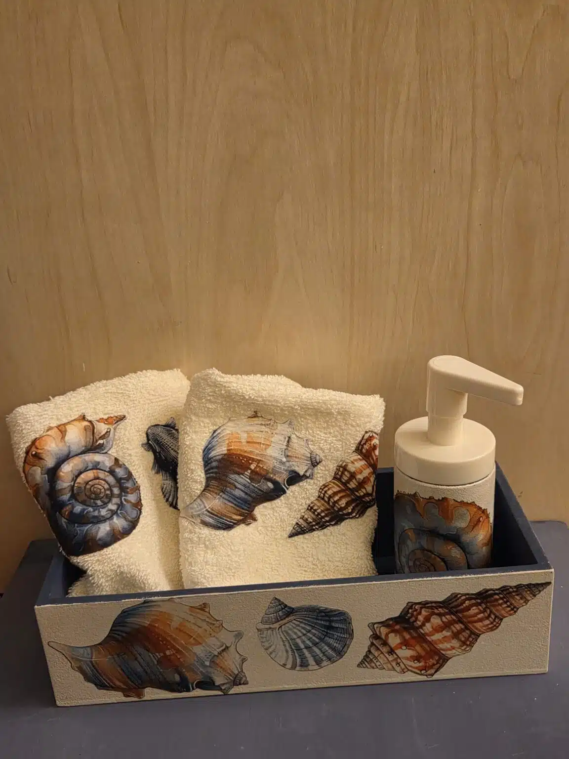 - Bathroom summer house set with a beige and blue shells pattern consists of a wooden box 28*12 cm , dispenser and 2guest towels 30*30 cm , don’t wash or scrub with harsh chemicals just wipe with a damp cloth