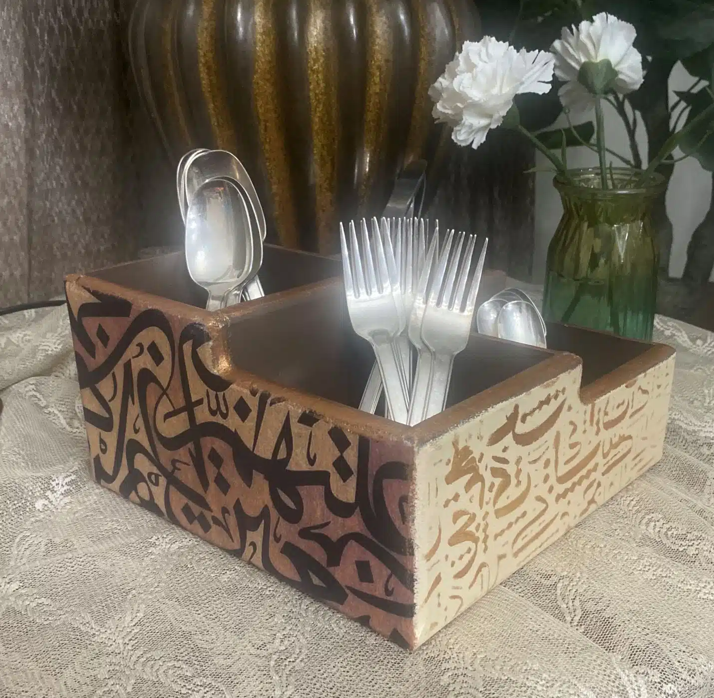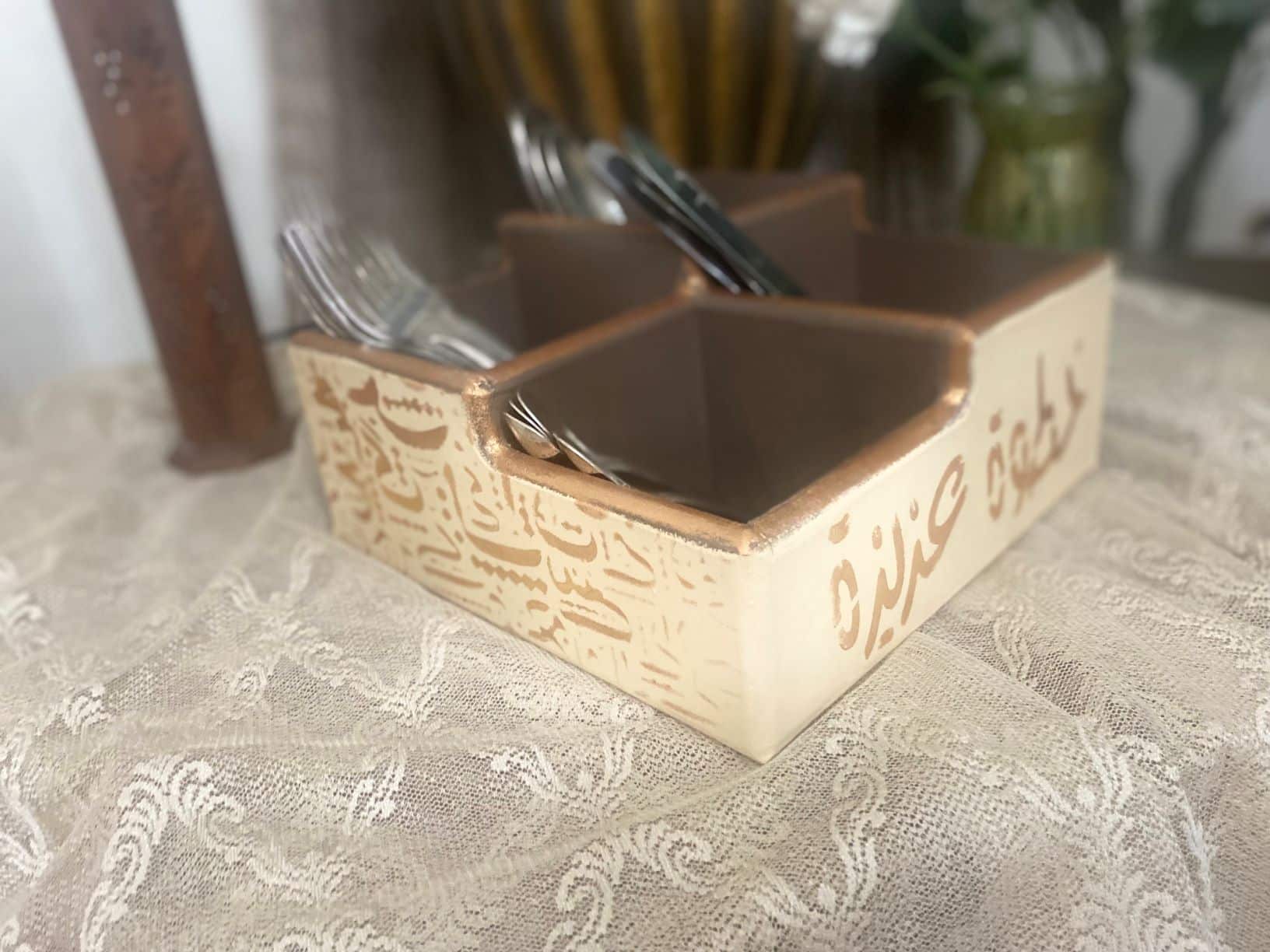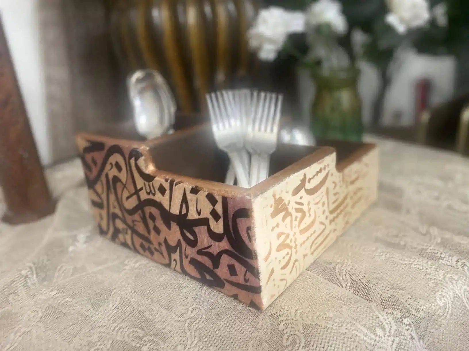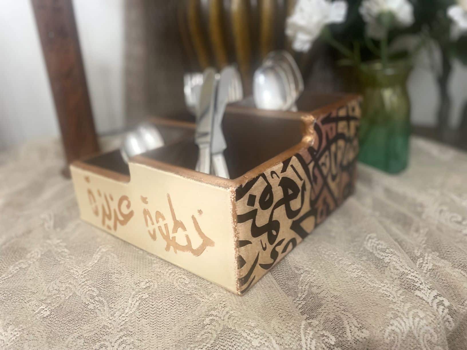 Decoupaged Cutlery Organizer calligraphy theme