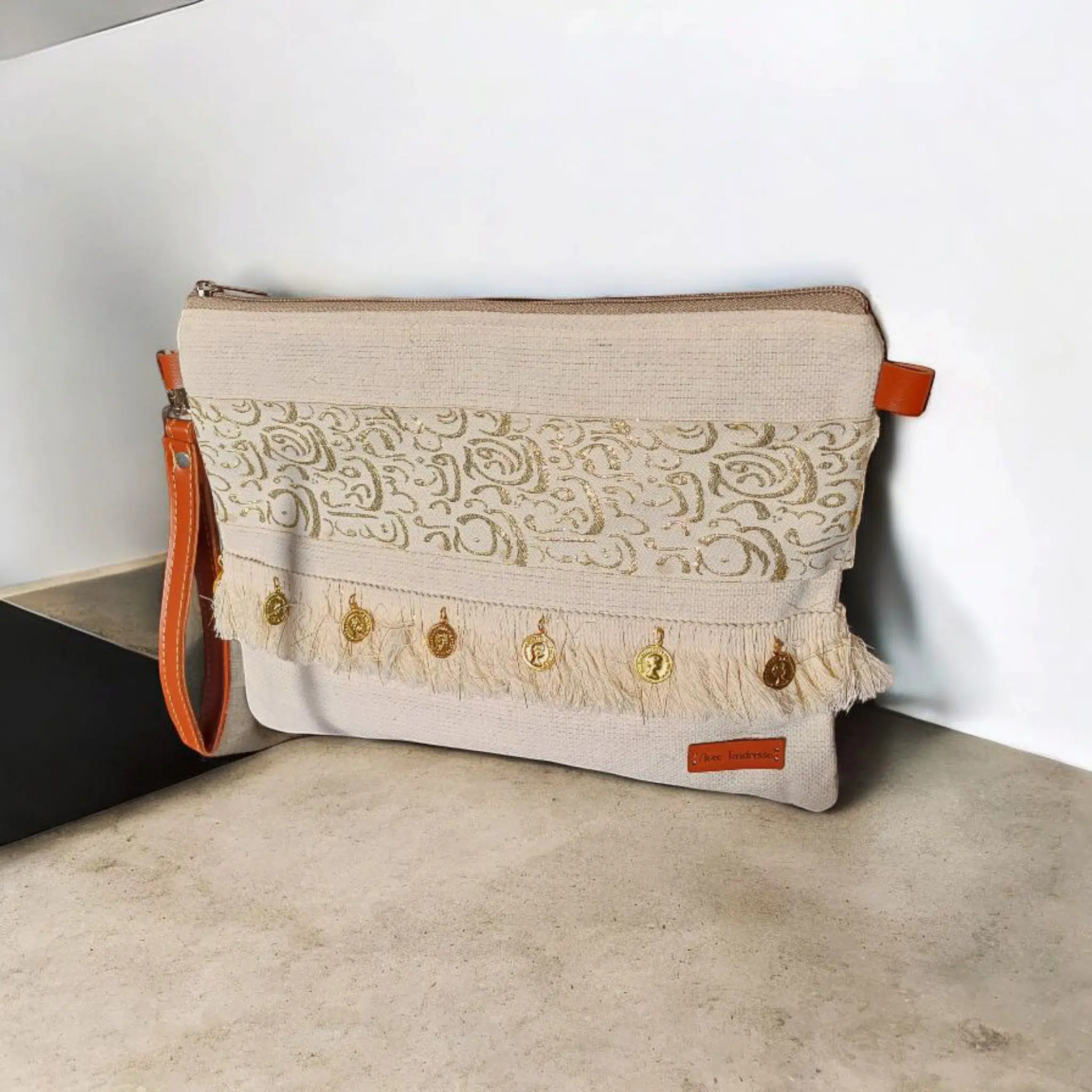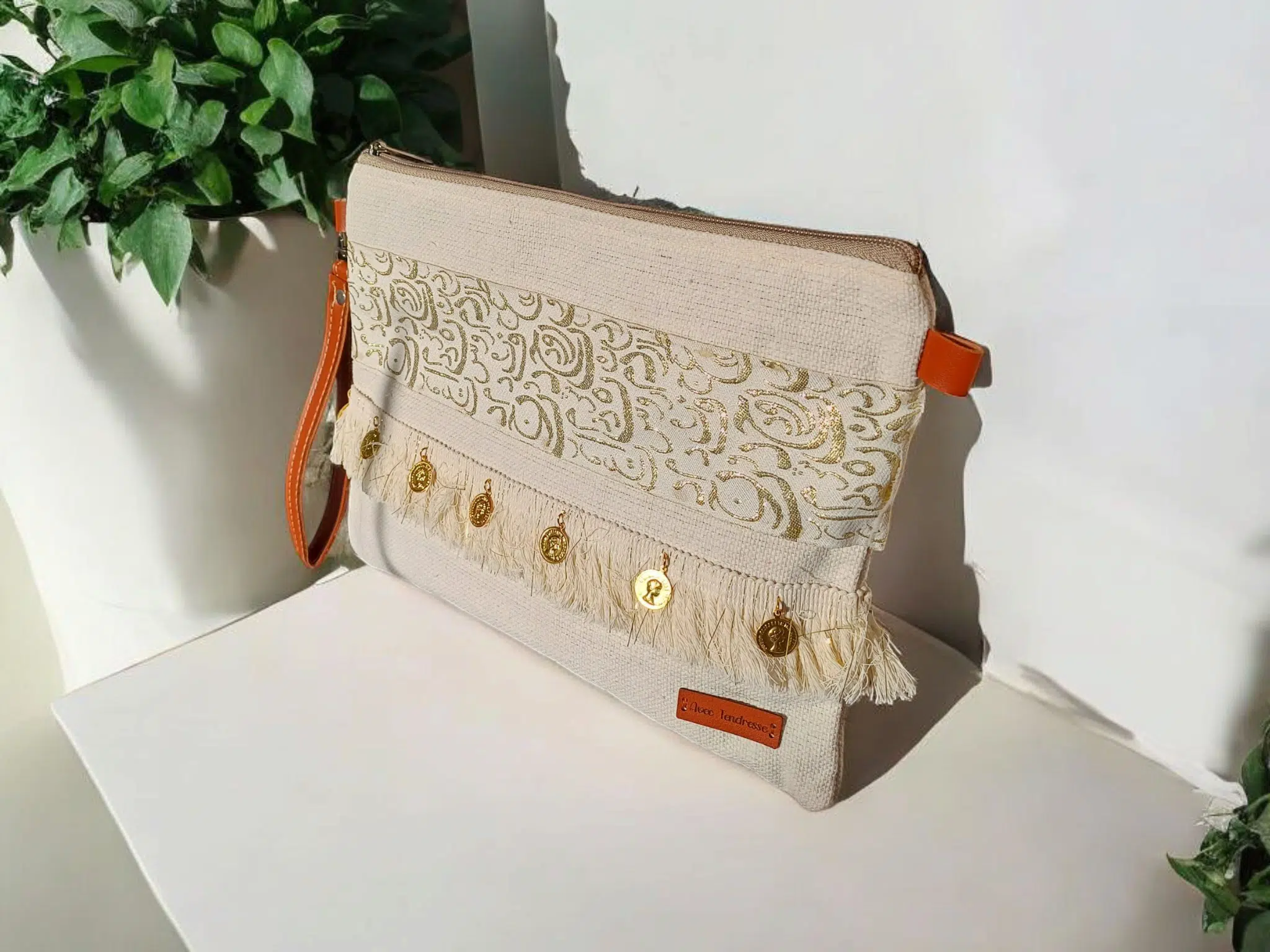 Beige clutch with arabic calligraphy , with lovely beige fringes and golden coins .A leather hand helps complete the elegent look