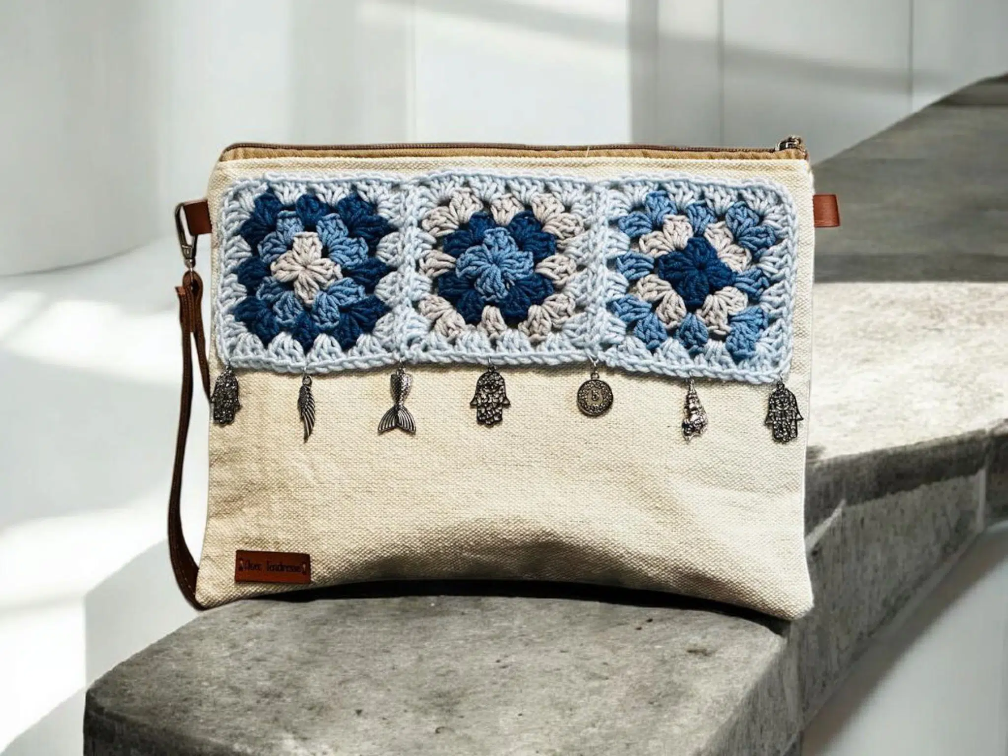 Beige clutch with granny squares and silver charms