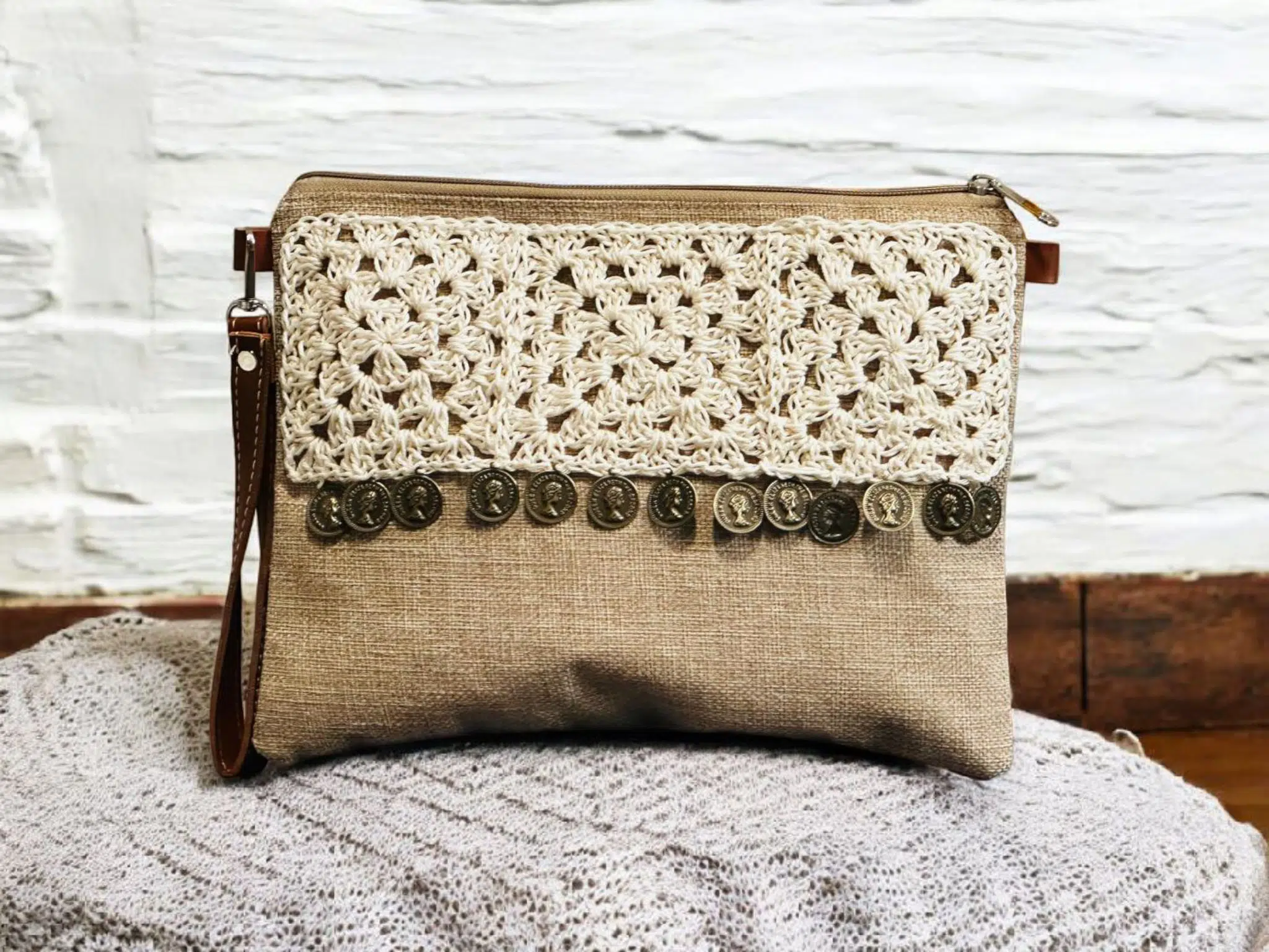 - Beige clutch with three lovely off white granny squares and oxide colored coins giving a vintage look.