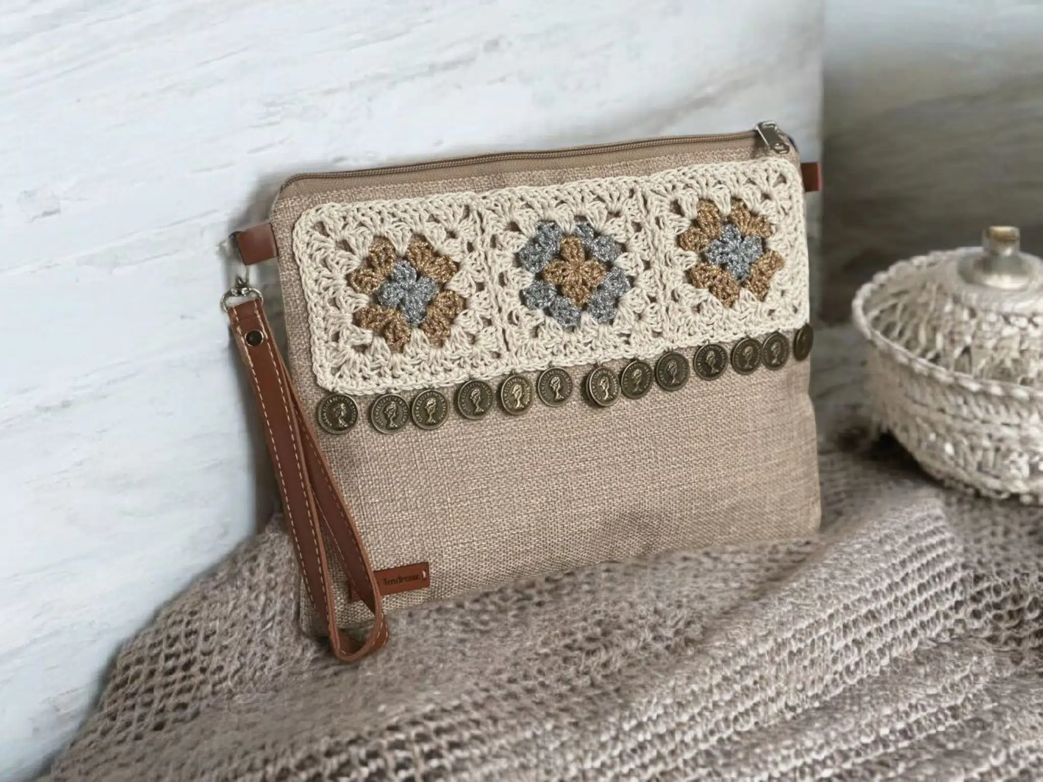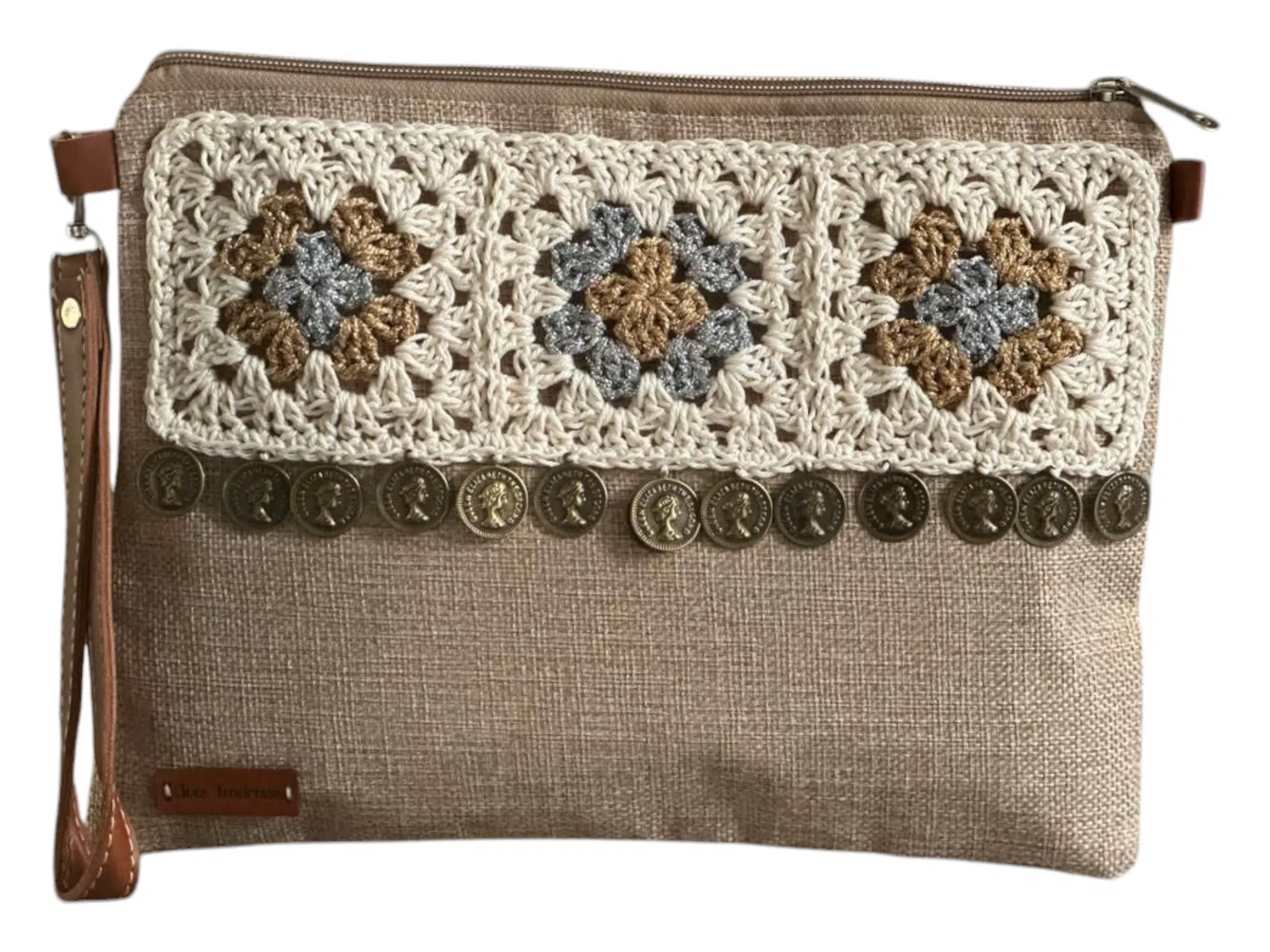 • Beige clutch with three lovely granny squares having a silver and gold center. Attached to the granny squares are coins with oxide color giving a vintage look .