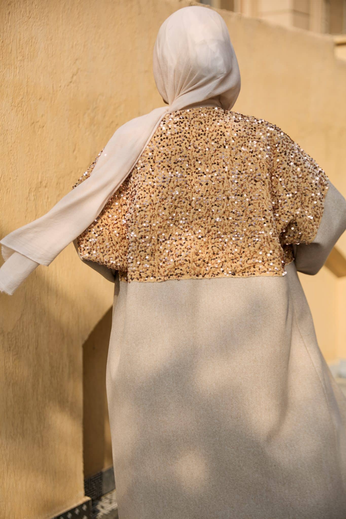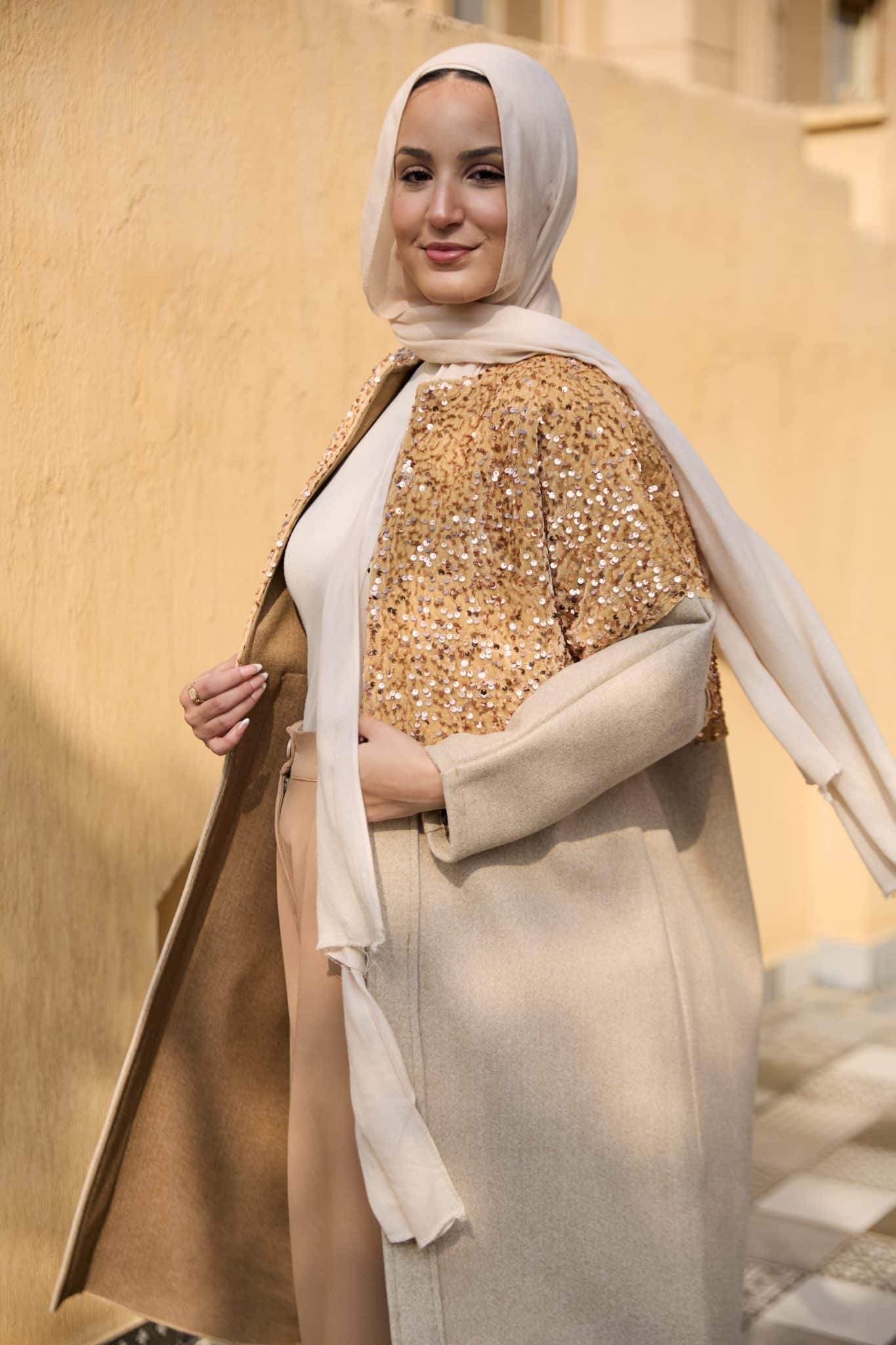 -Broadcloth beige coat with touch of gold byte material