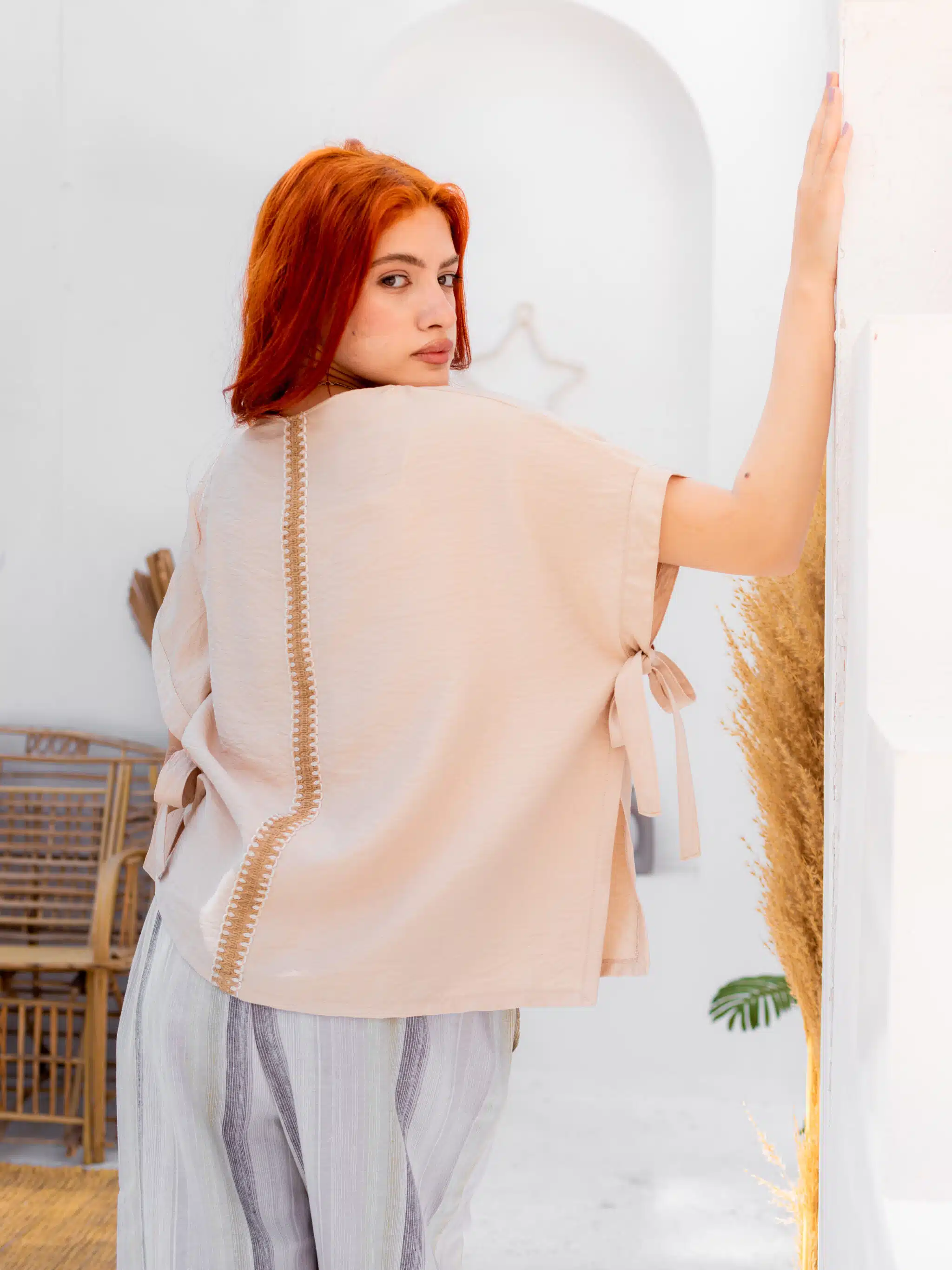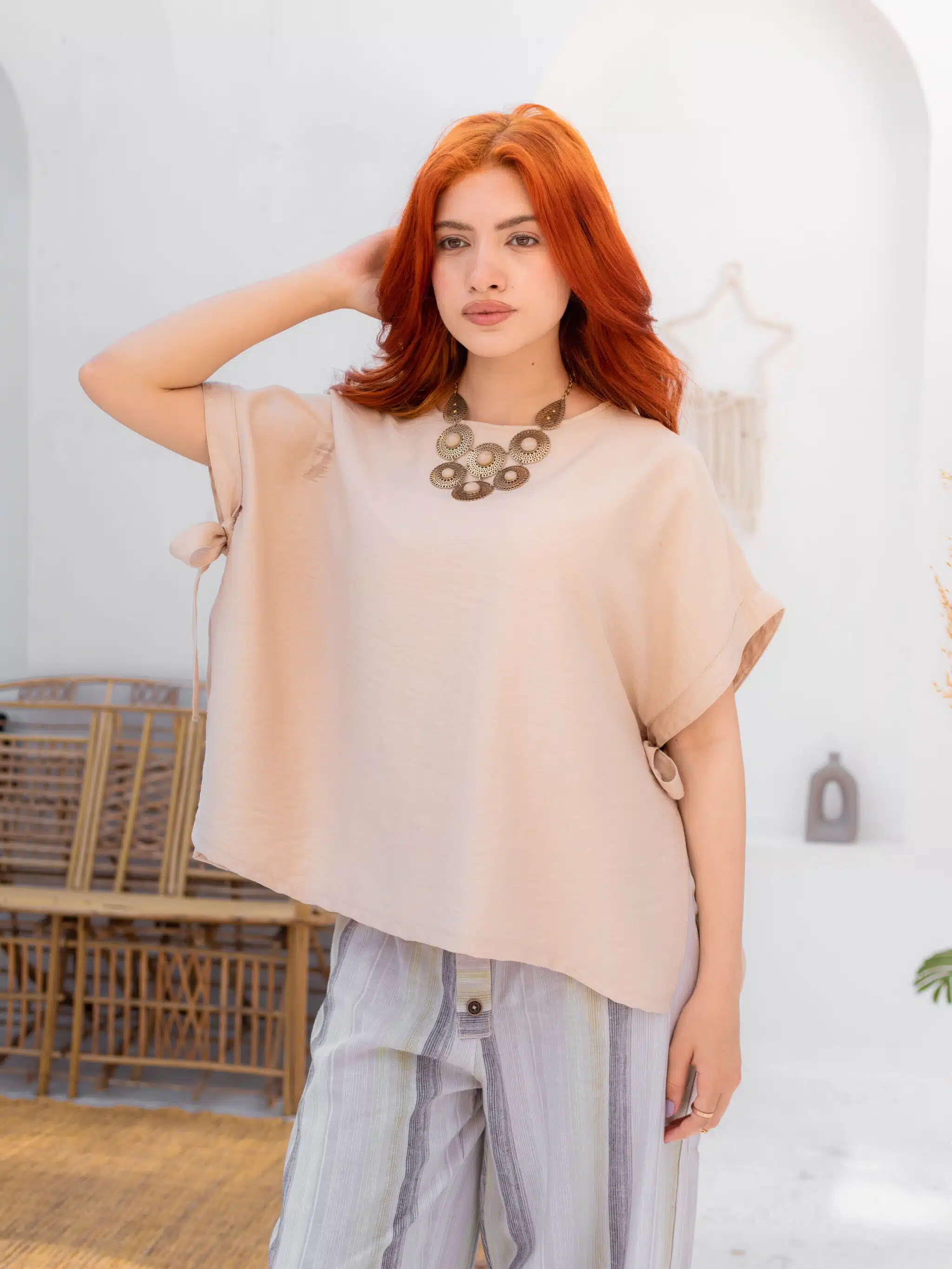 Be the first to review “Beige Spanish linen tow-sides tied blouse”