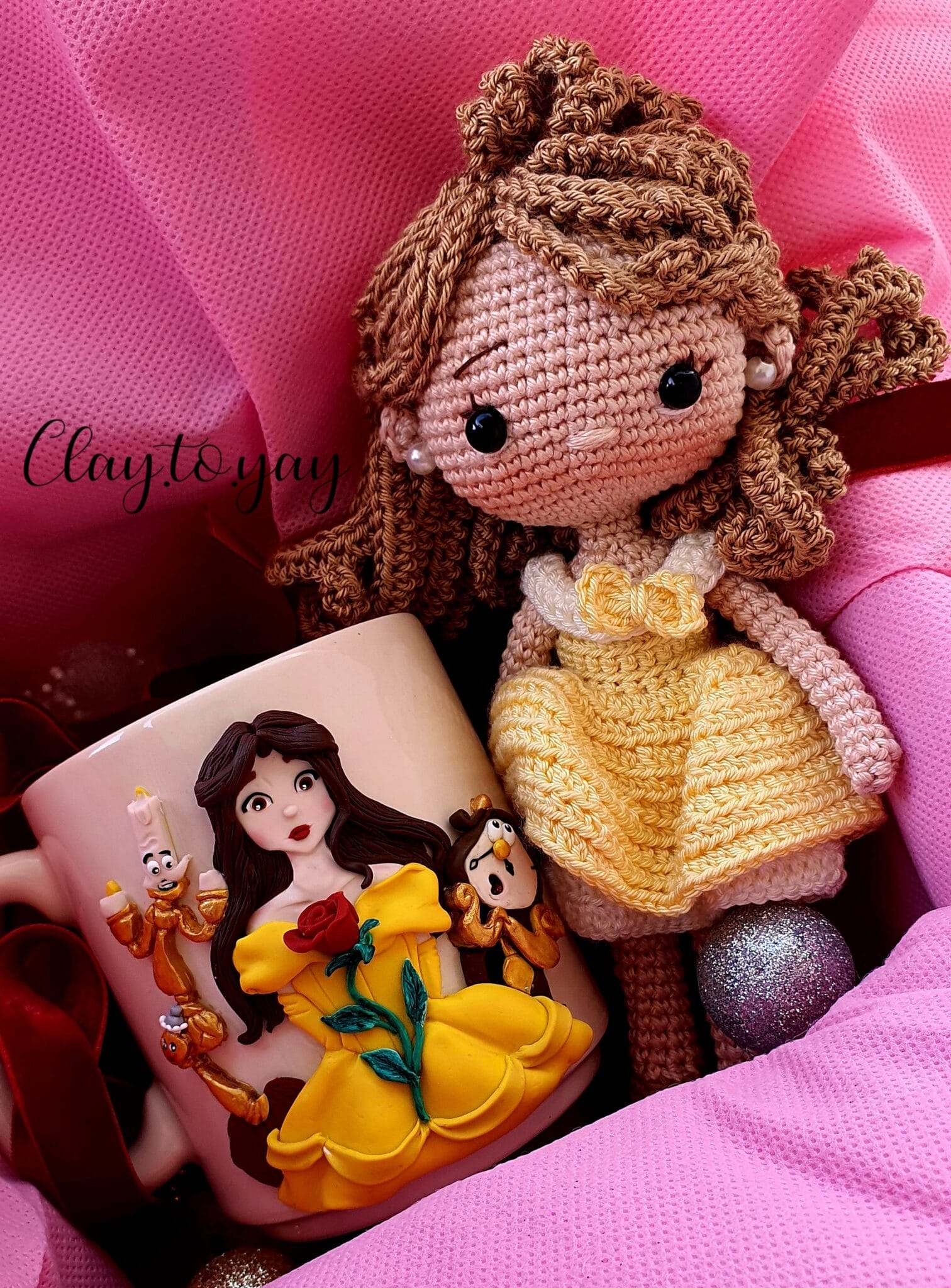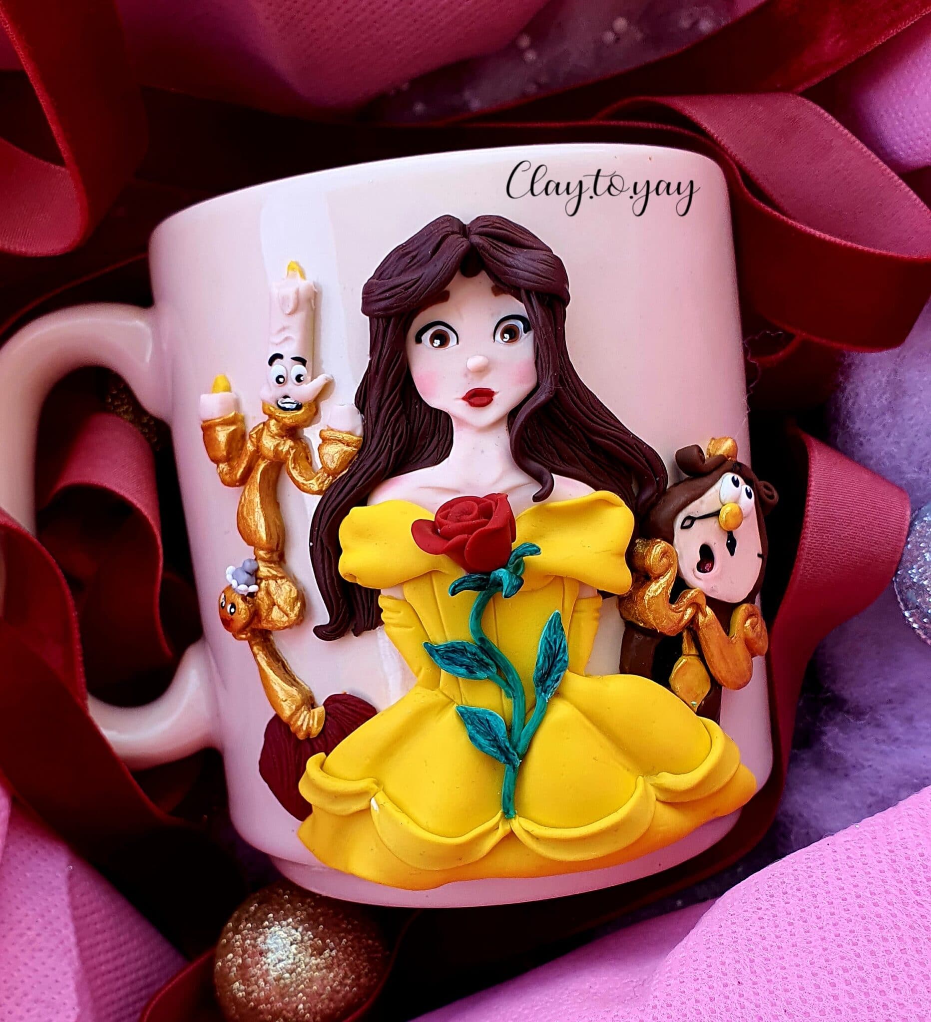 Porcelain mug with a design made of polymerclay