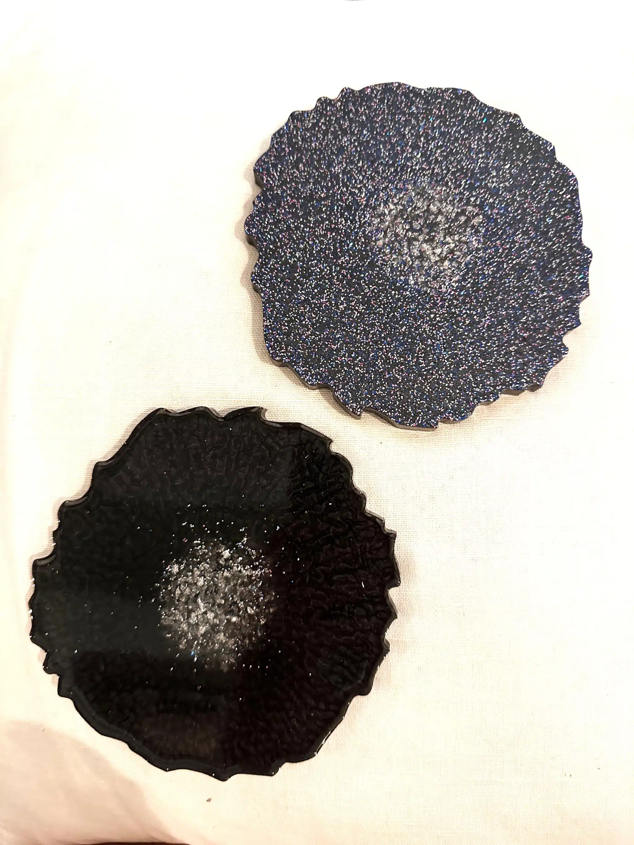 Round black resin mixed with colorful glitter, creating double faced coasters with silver leaves in the center. Its size is around 13 cm.