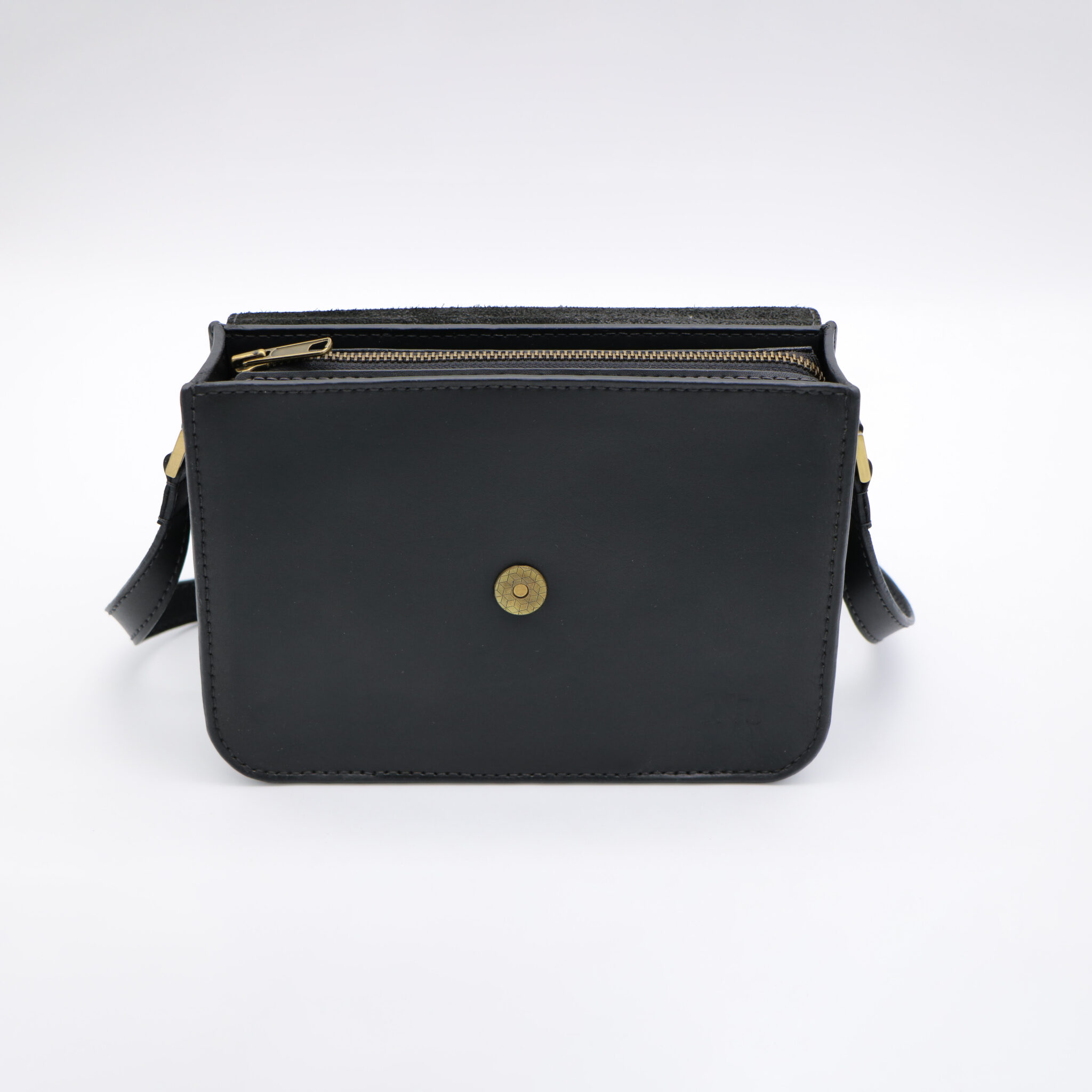 Black genuine leather bag with floral design.