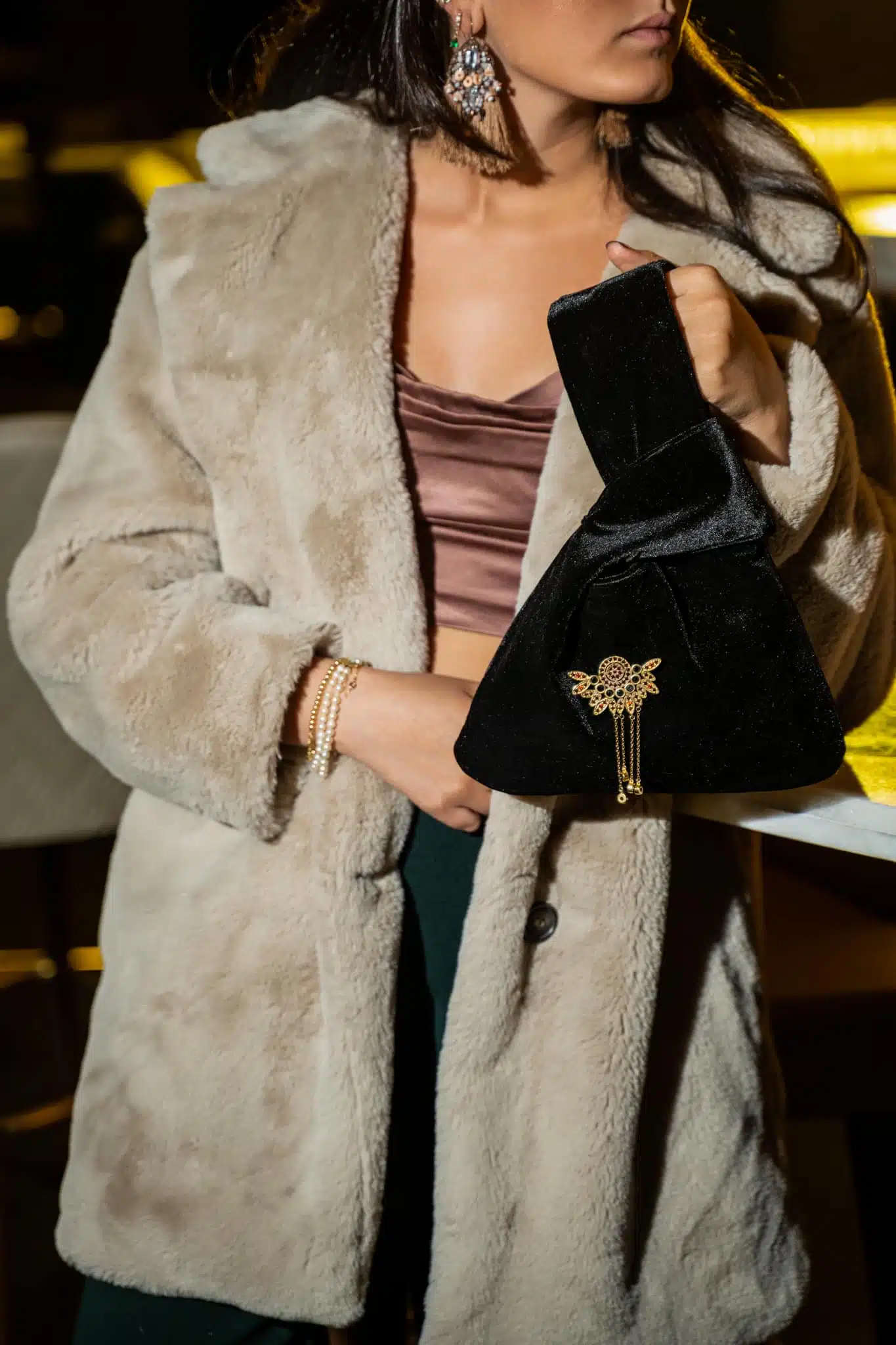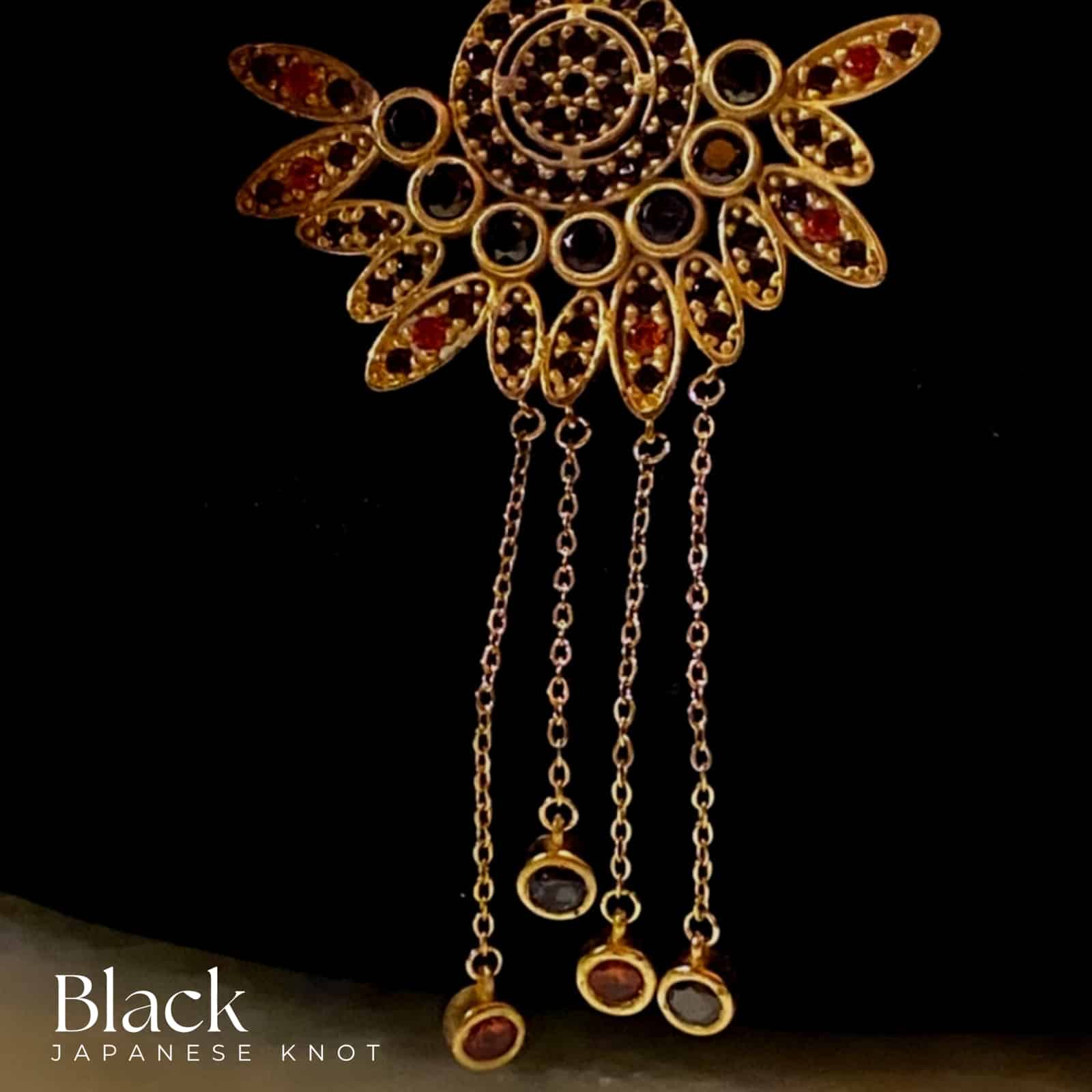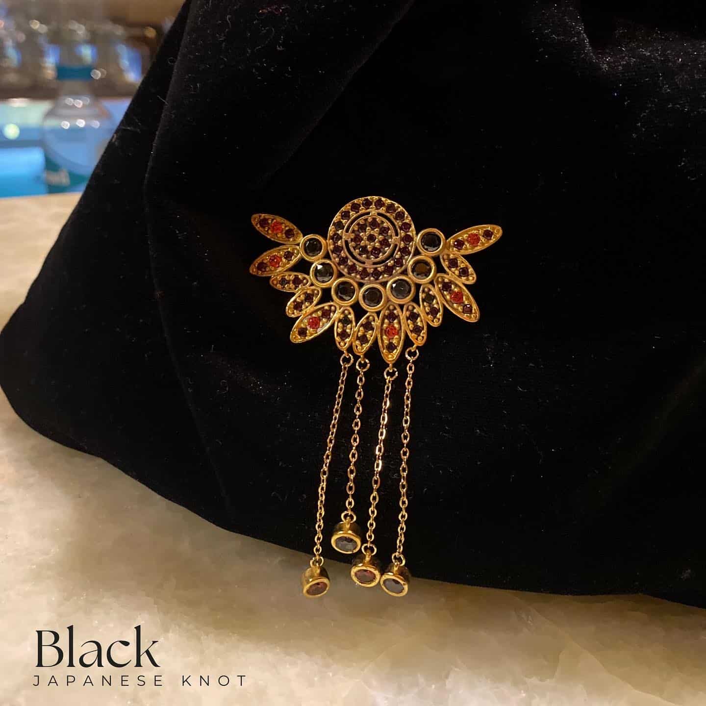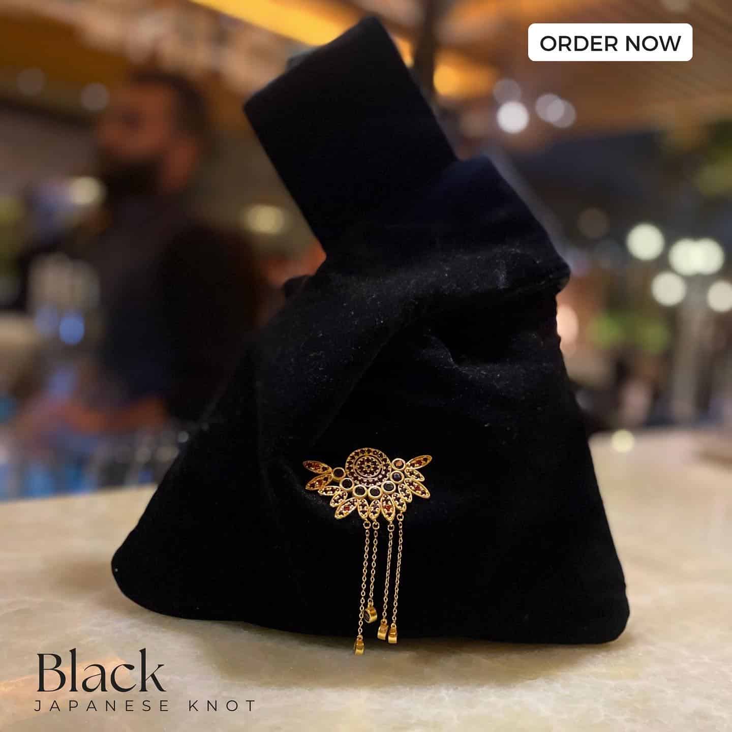 Black Japanese Knot Wristbag, in rich Velvet Material , tailored with inside satin lining, and our signature yellow gold-embedded piece with Black & Red stones, by CH by Christine Habib Azer,
