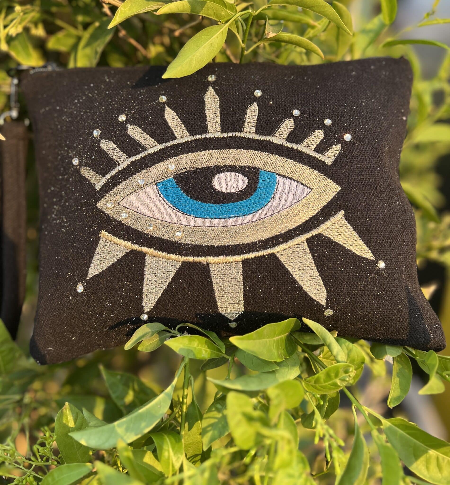 Dramatic black clutch with golden embroidered all-seeing eye. Bold mystical design combines gothic elegance with spiritual symbolism.​​​​​​​​​​​​​​​​