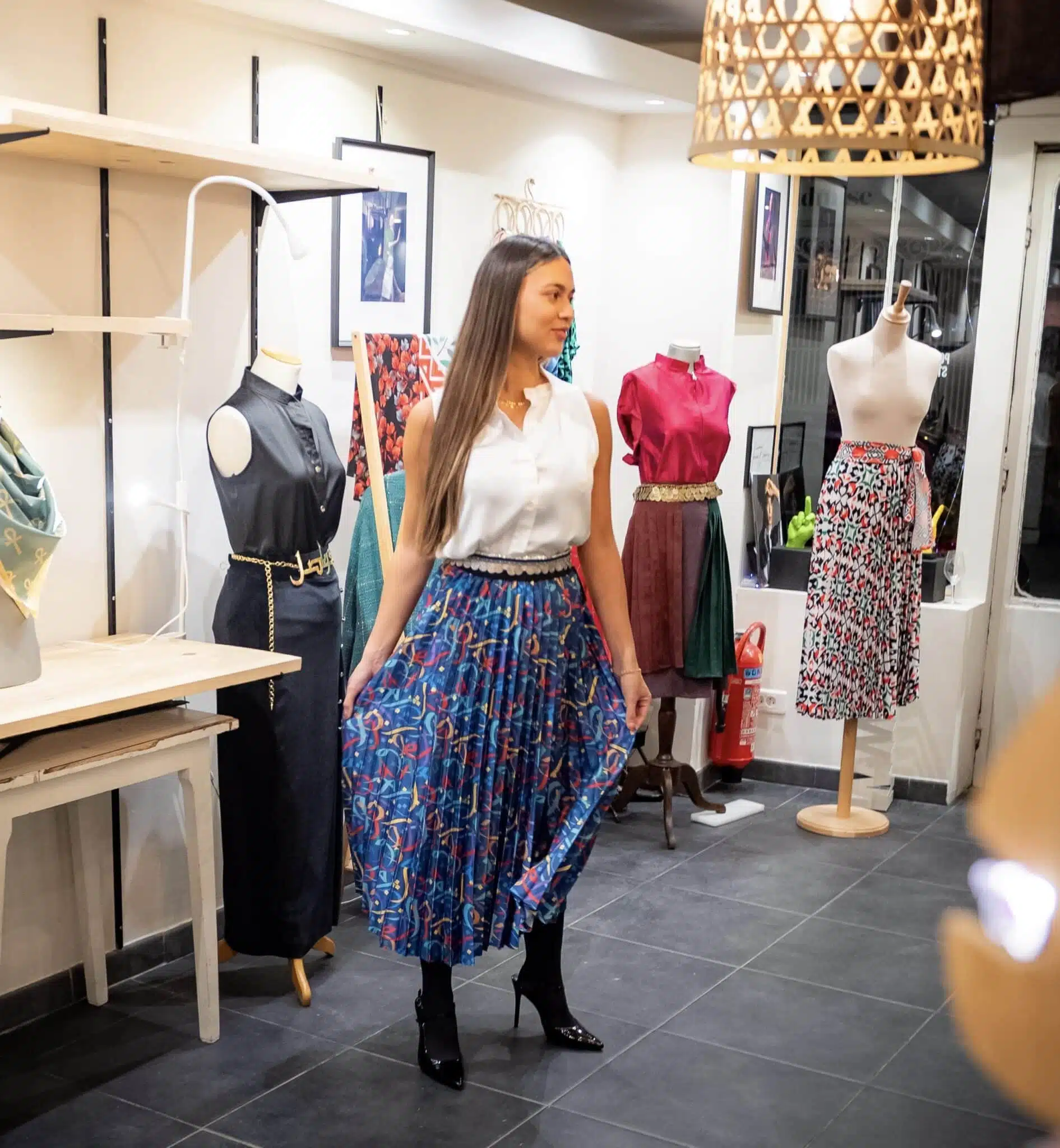 Those skirts are done in a long process first printing on our special satin, then cutting, then putting the fabric in a mould to make the pleats, then finally attaching the elastic band and finishing it.