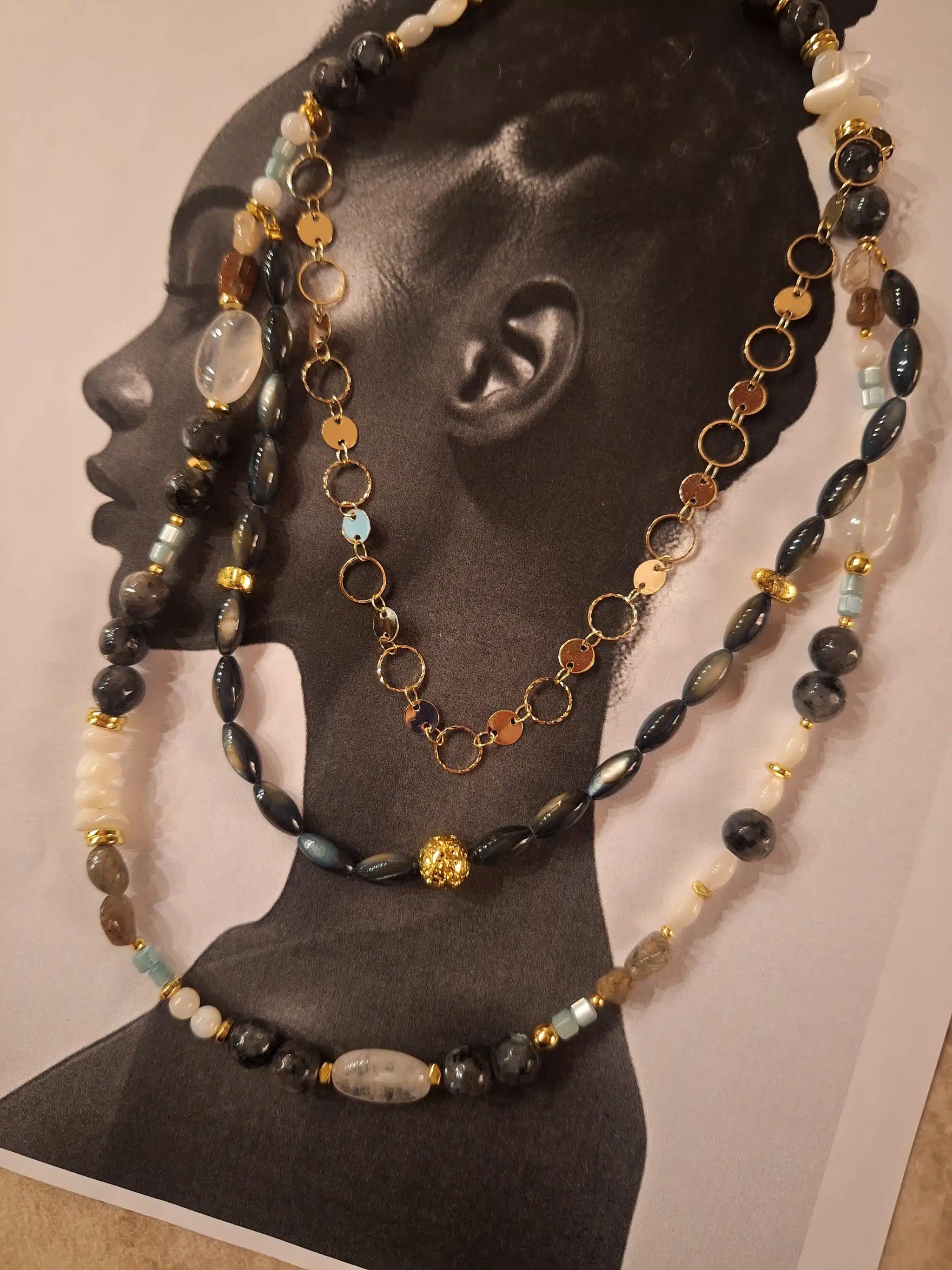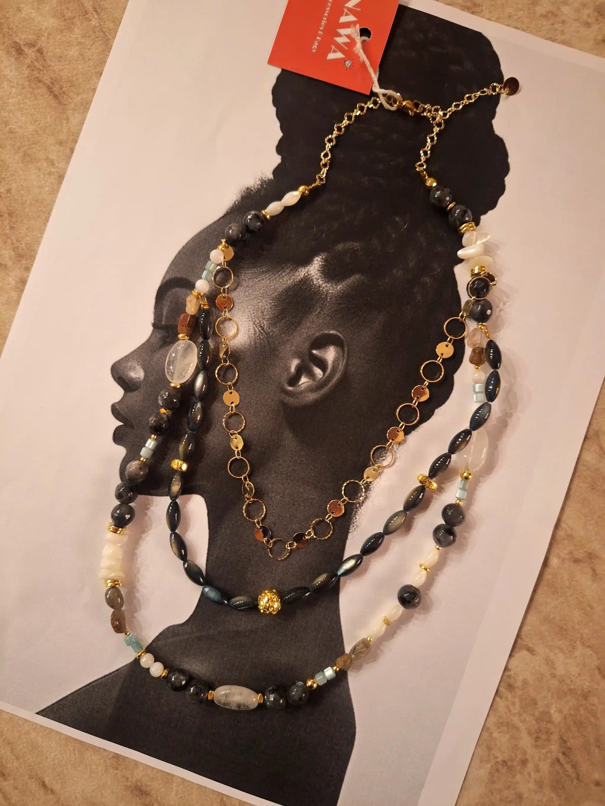 كوليه ٣ أدوار مصنوع من الأحجار الكريمة الصدف و العقيق و الهيماتيت المطلي و الدهب الصيني.