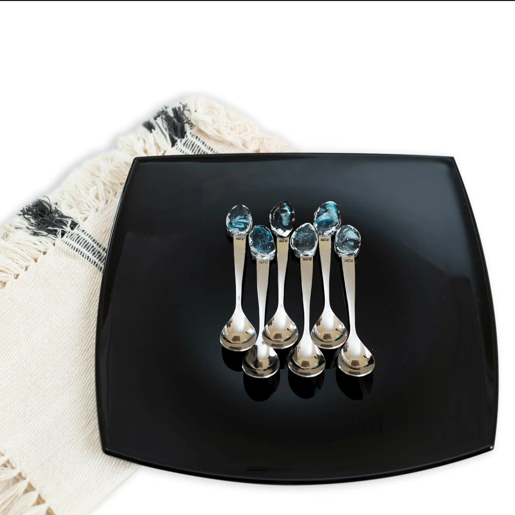 •Stainless-steel flatware, with a handmade crystal of epoxy resin & surrounded with silver leaves