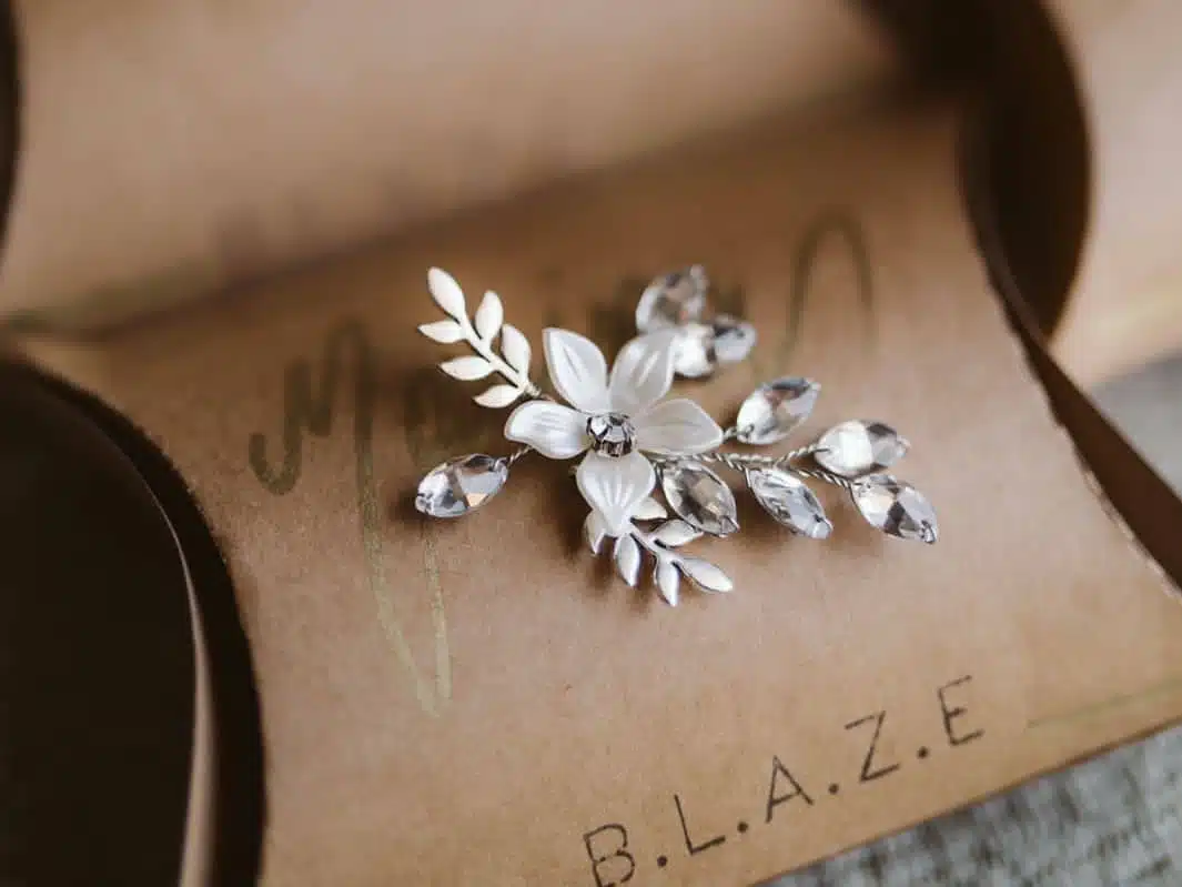 Materials: glass crystals, White plastic flower, metal leaves