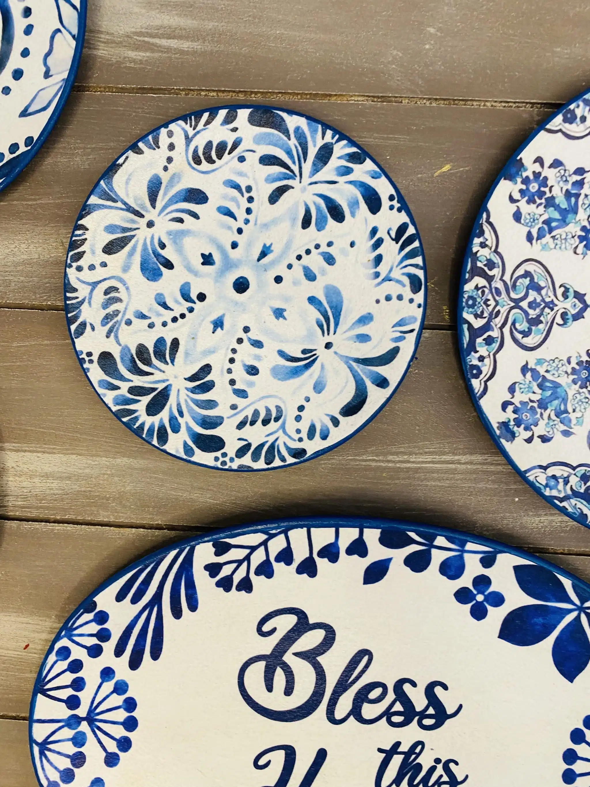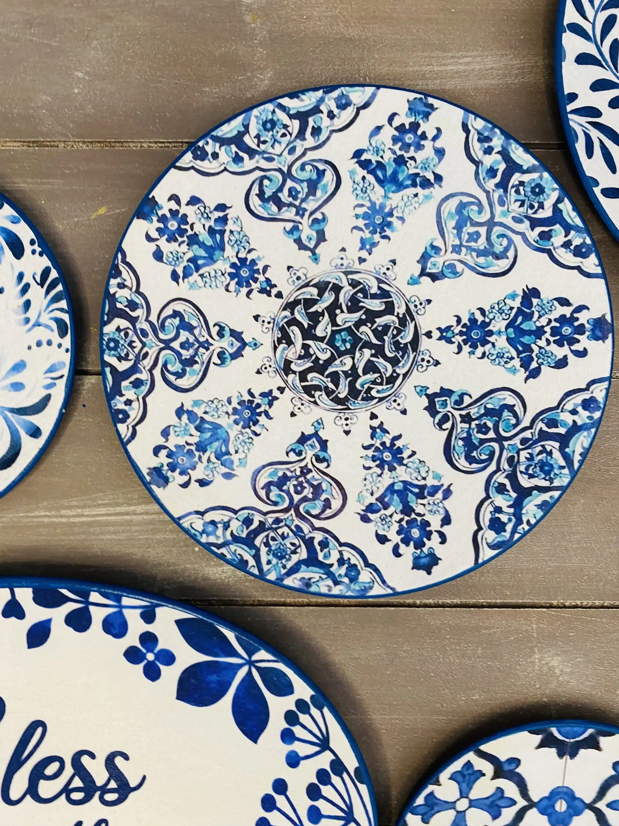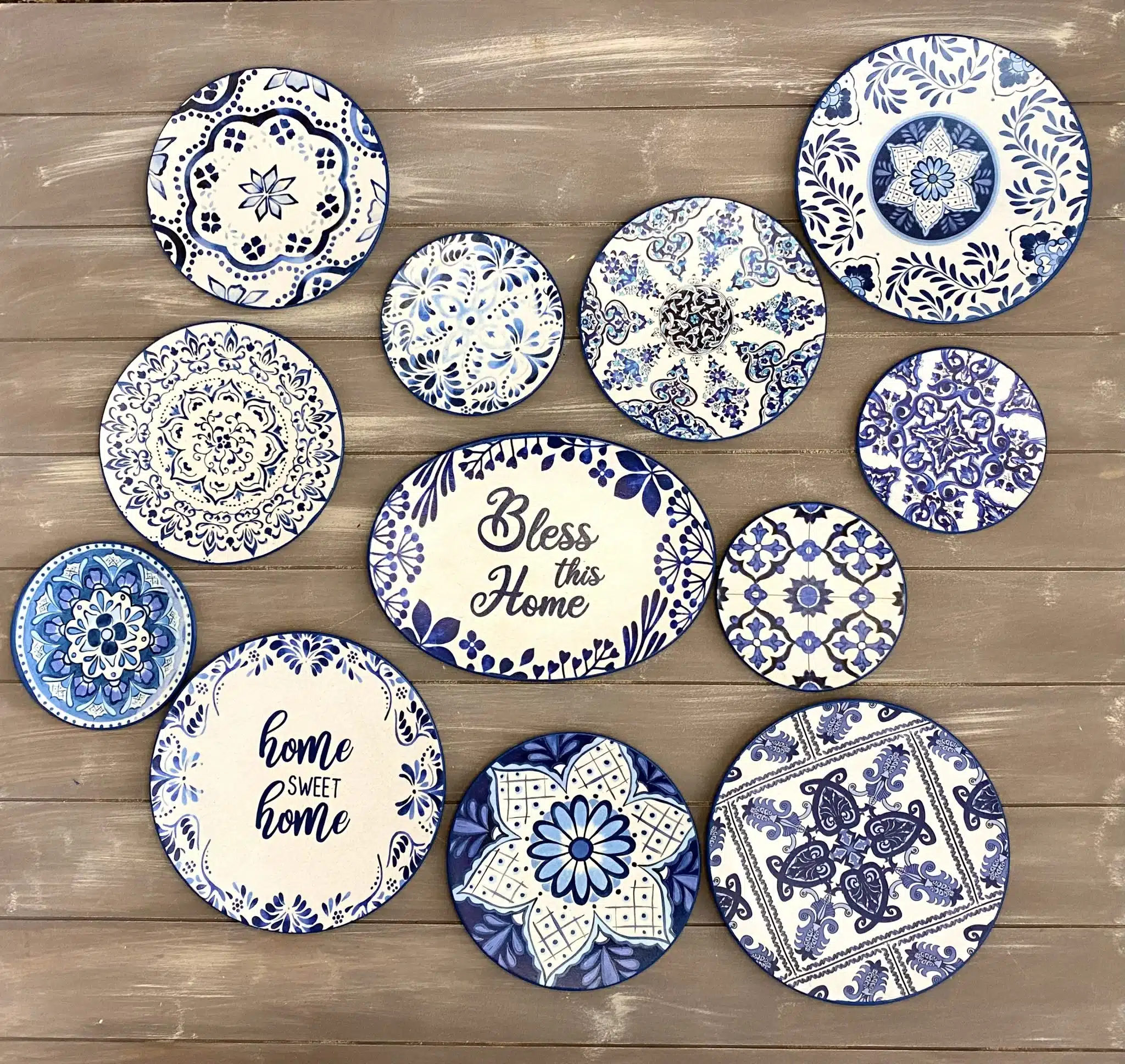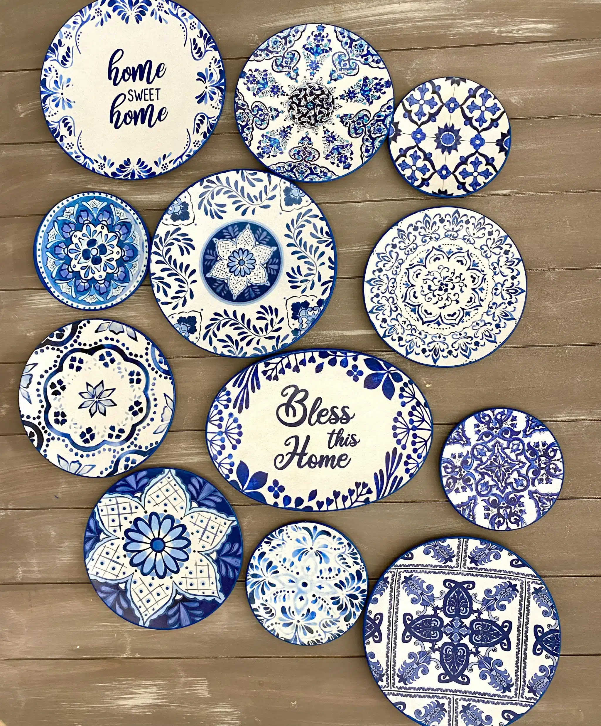 Decoupaged wall plates collection in Home theme and blue blanc design