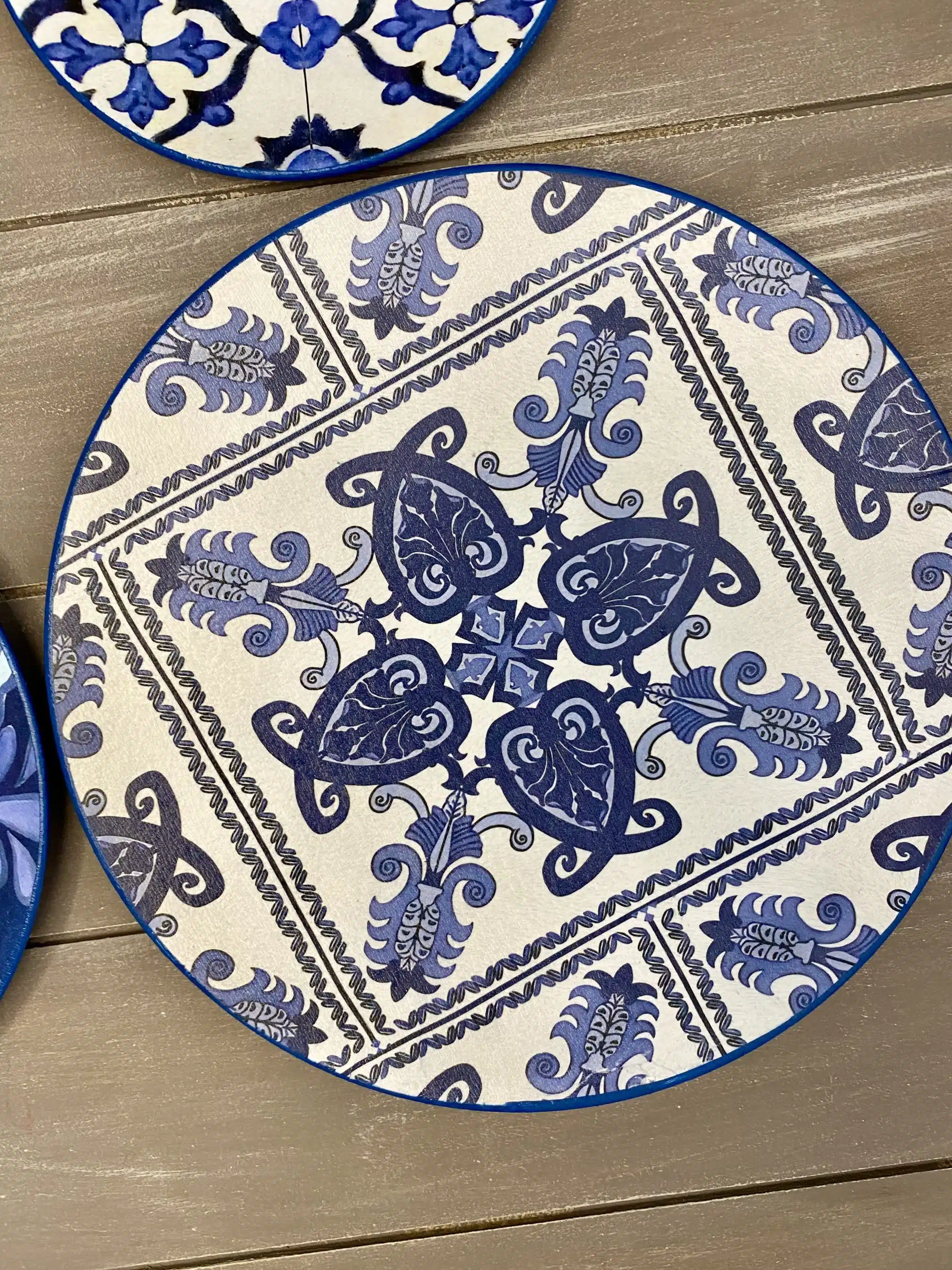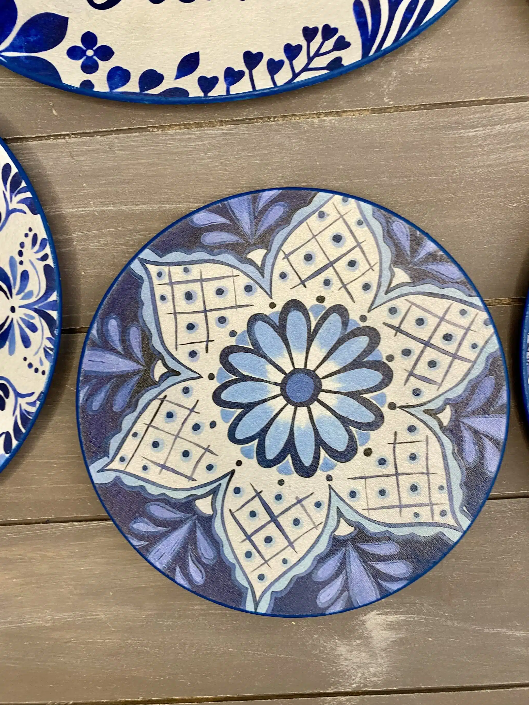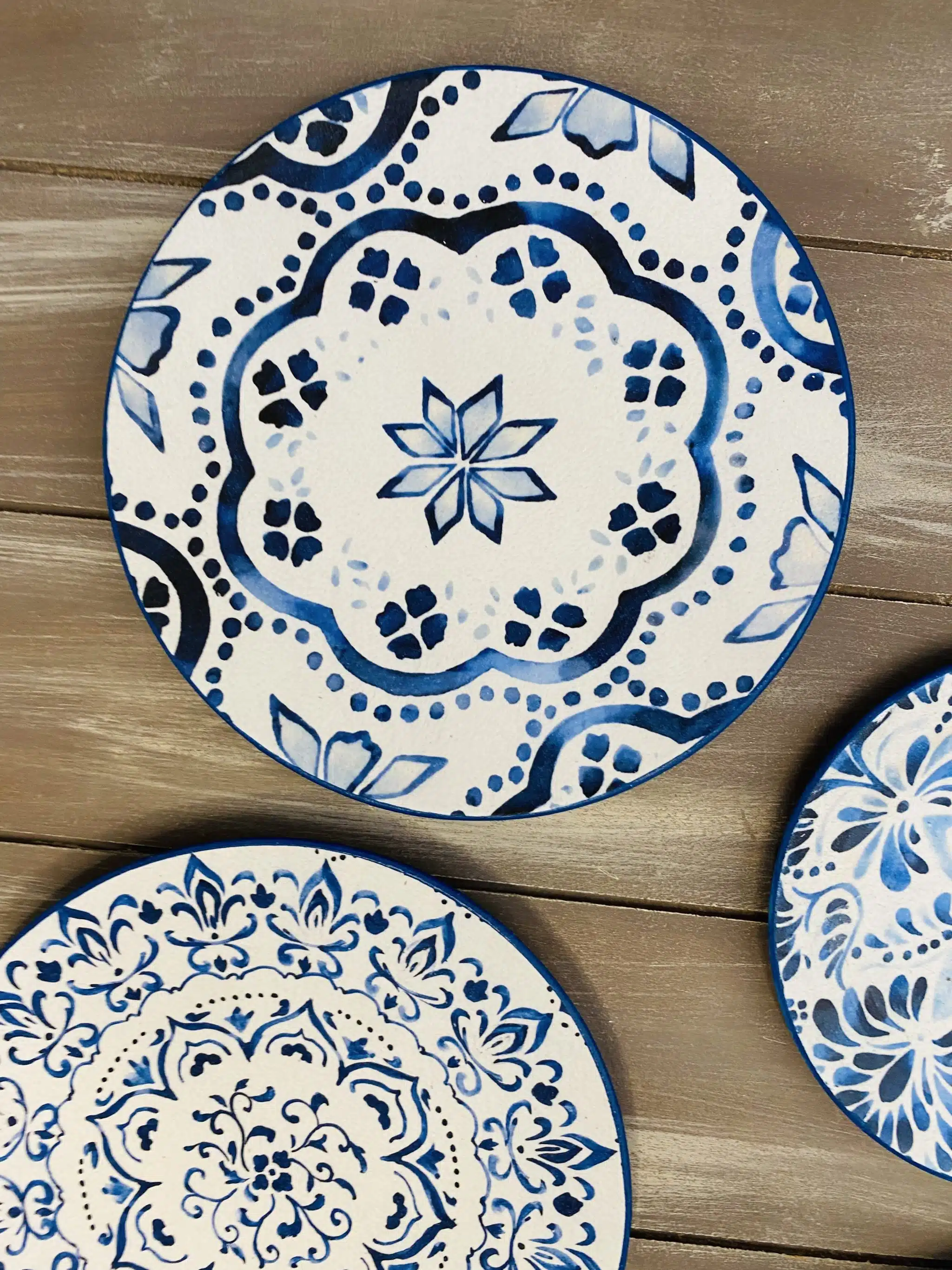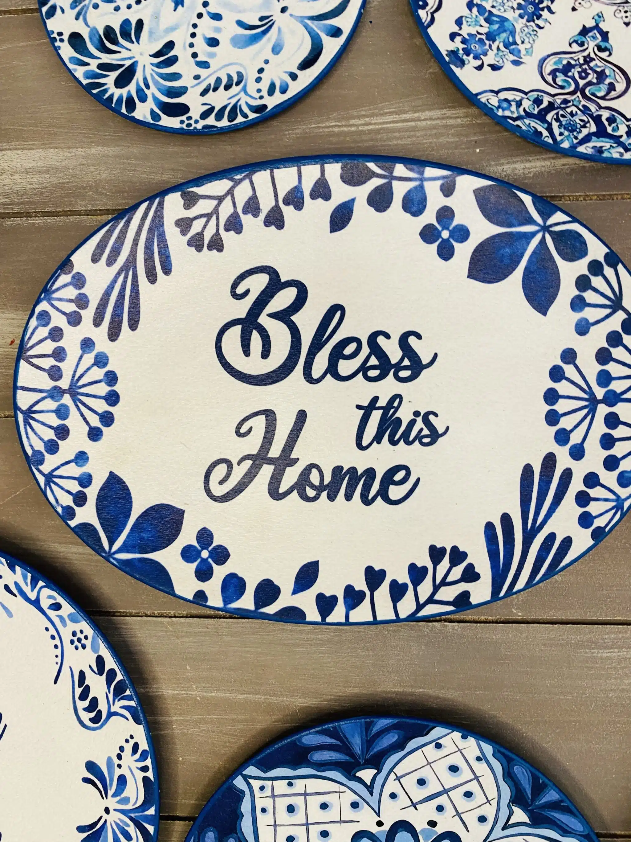 Decoupaged wall plates collection in Home theme and blue blanc design