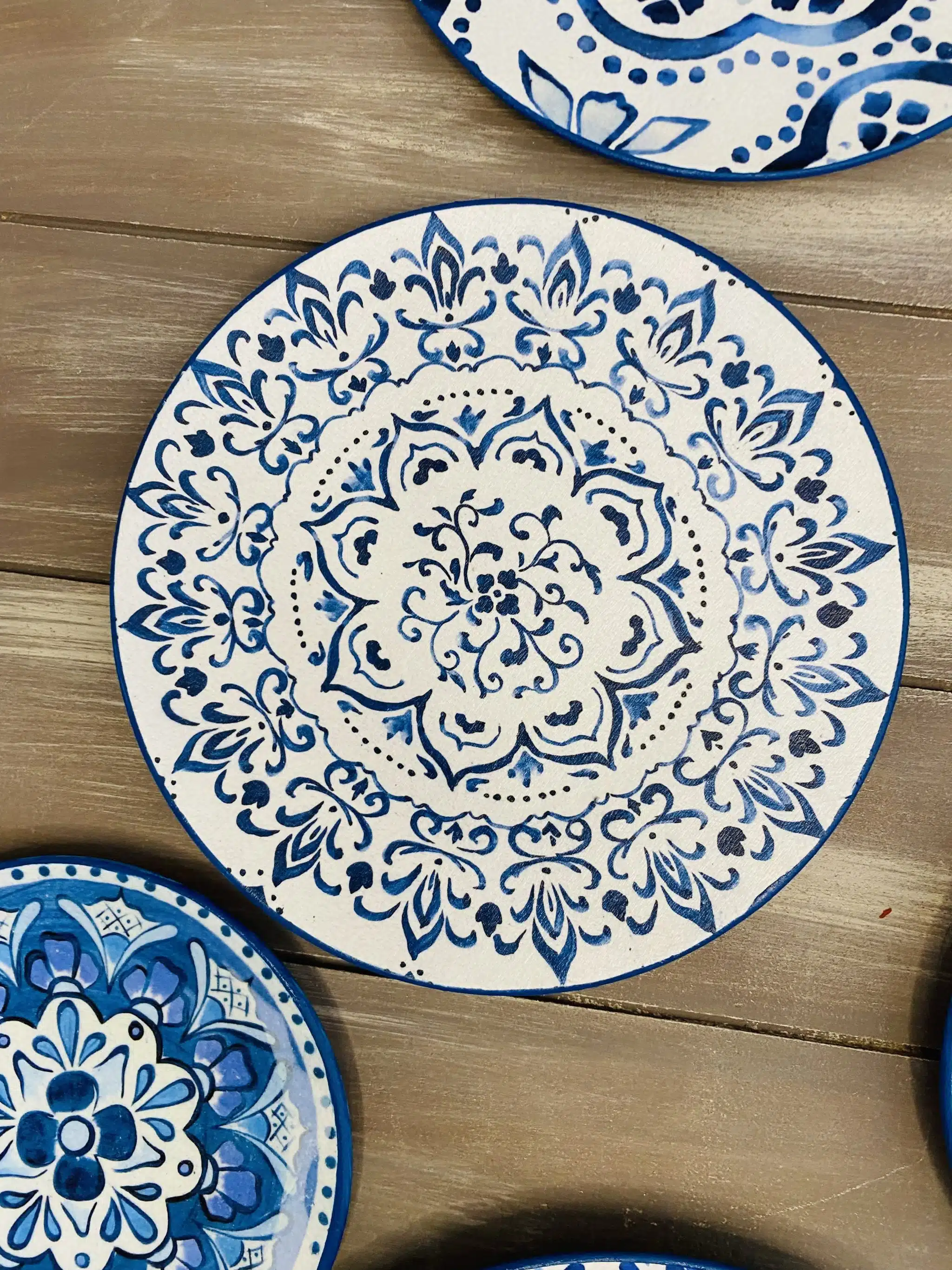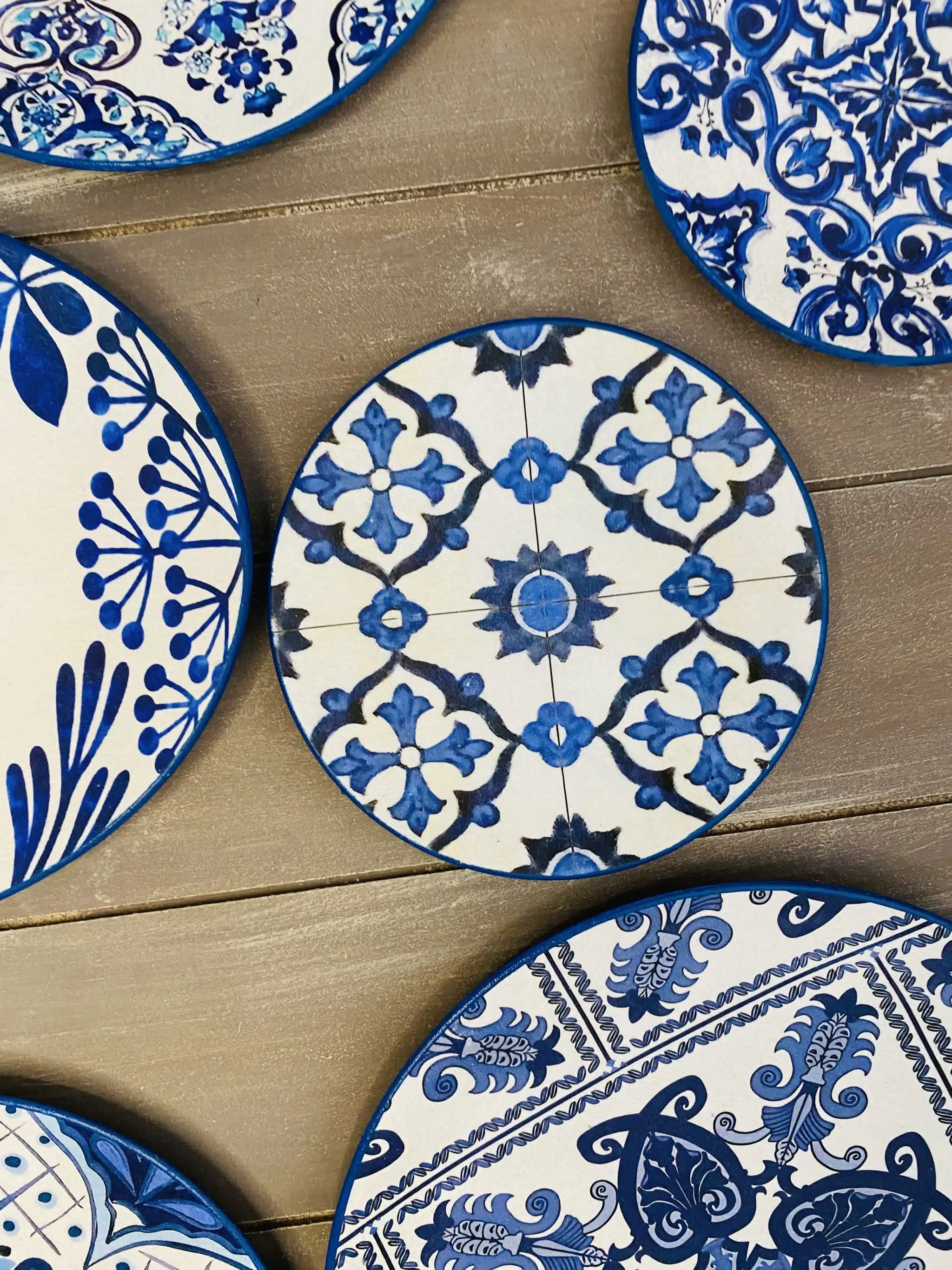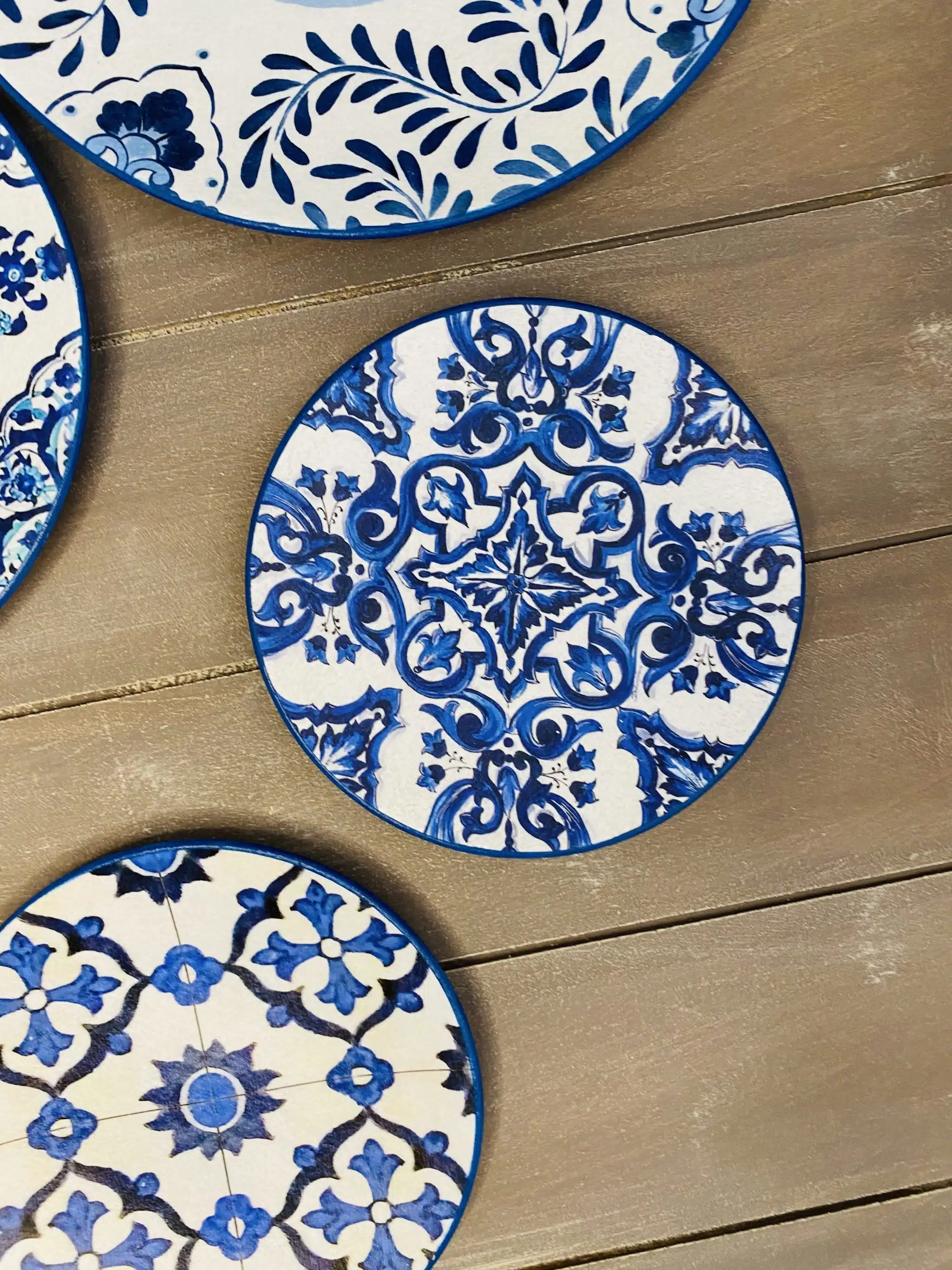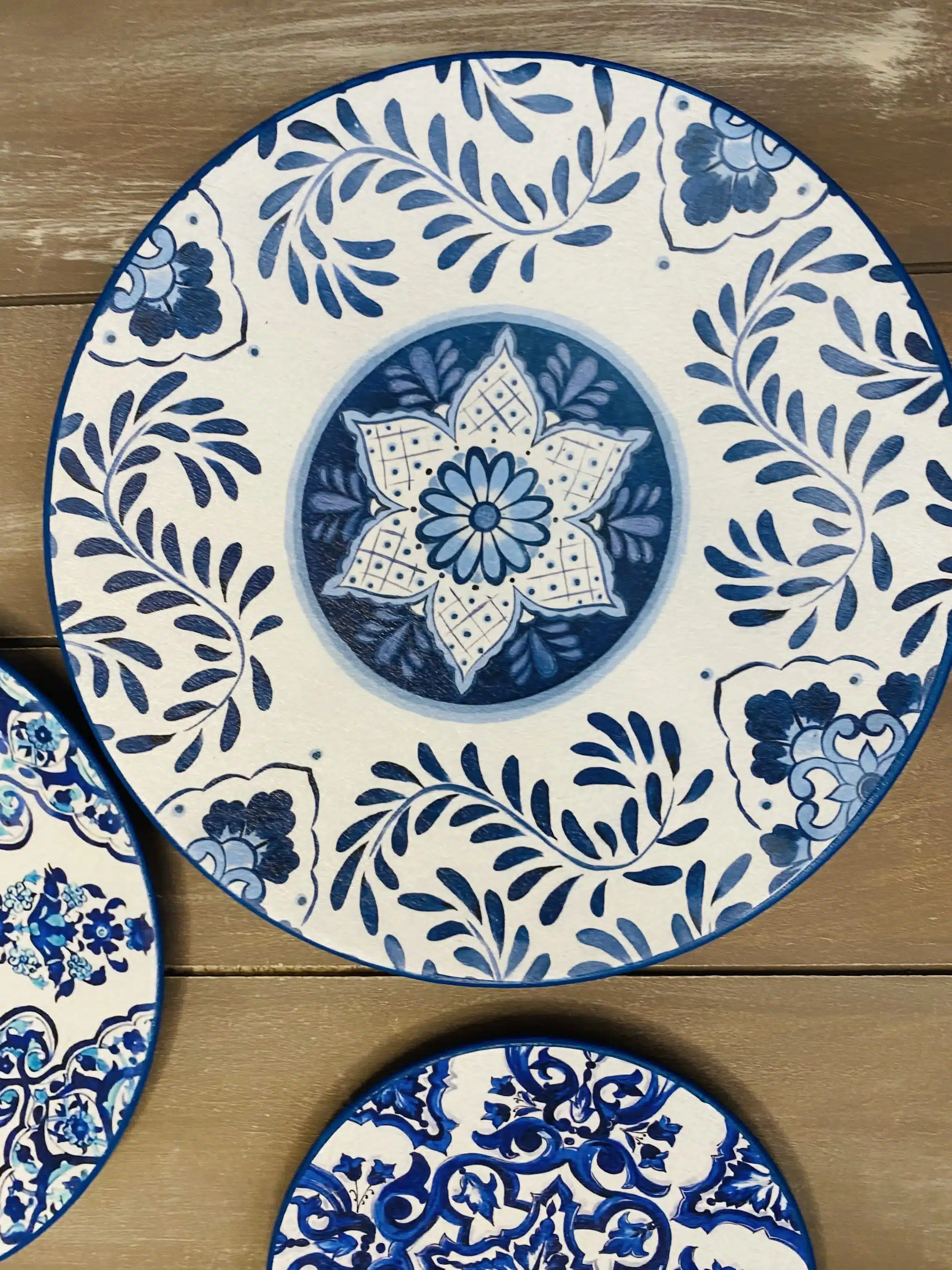 Decoupaged wall plates collection in Home theme and blue blanc design