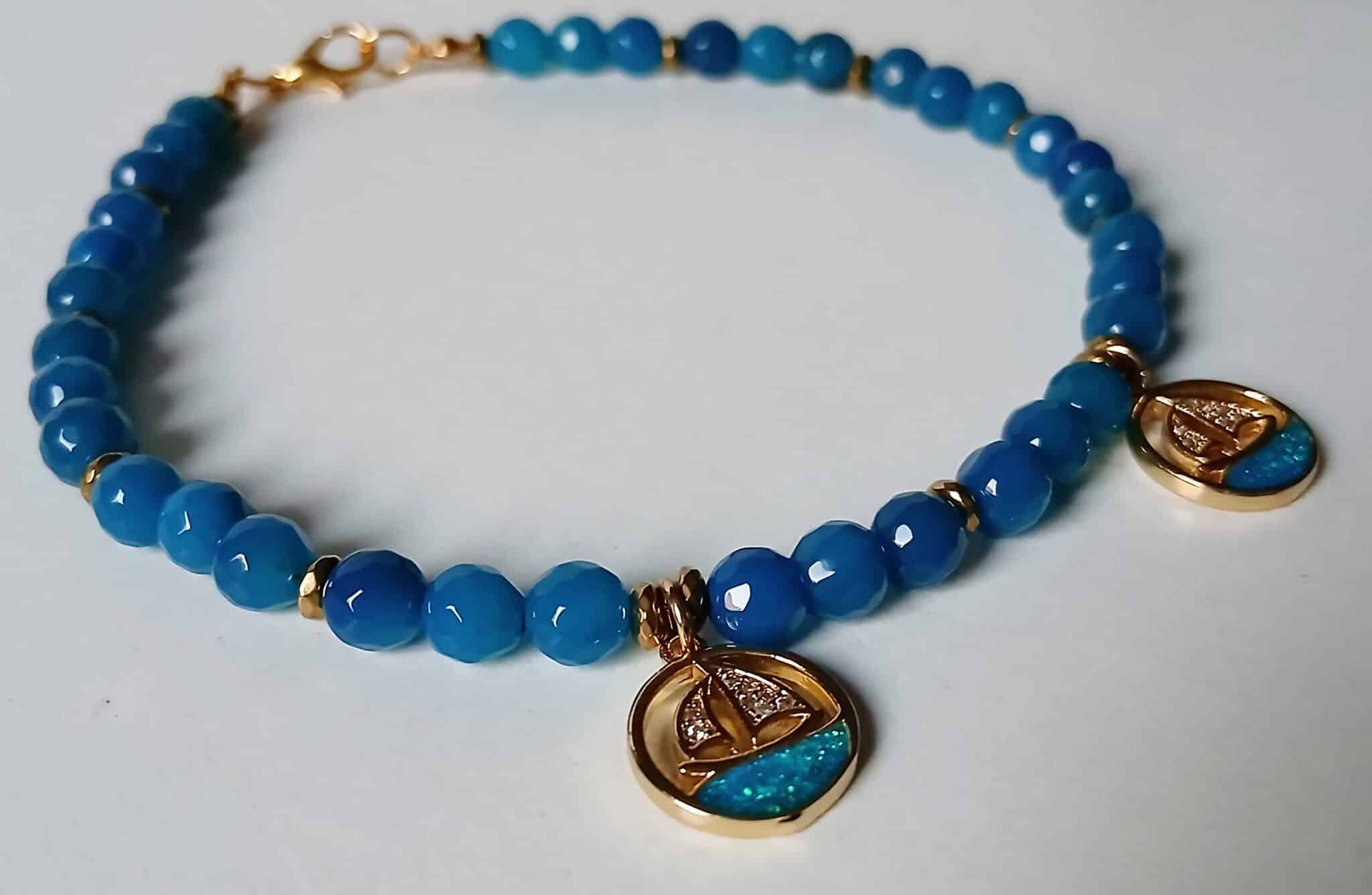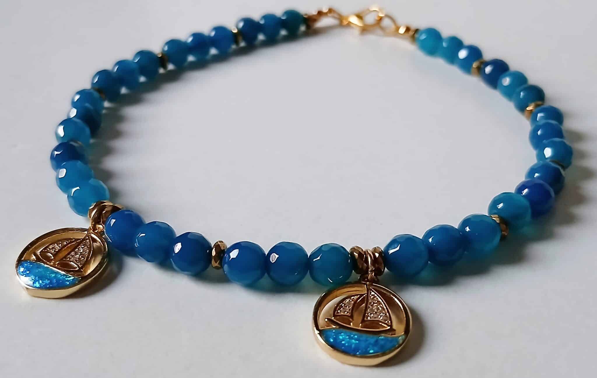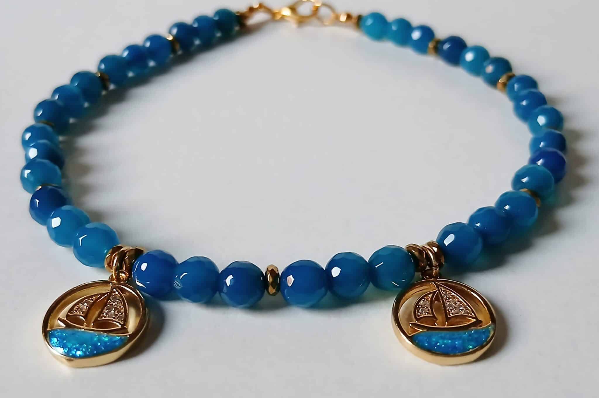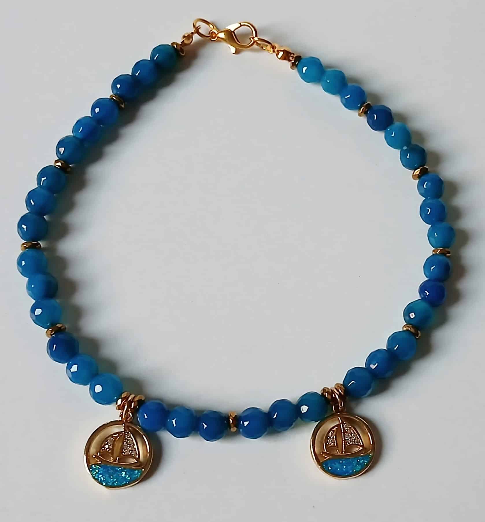Anklet made of blue agate stones with two Chinese gold boat pendants