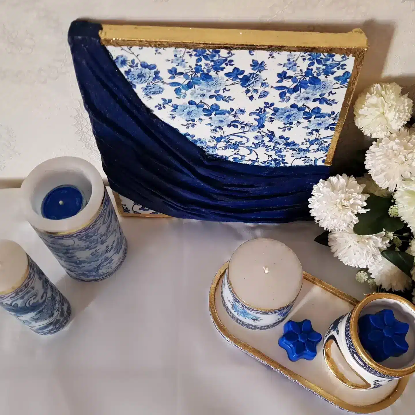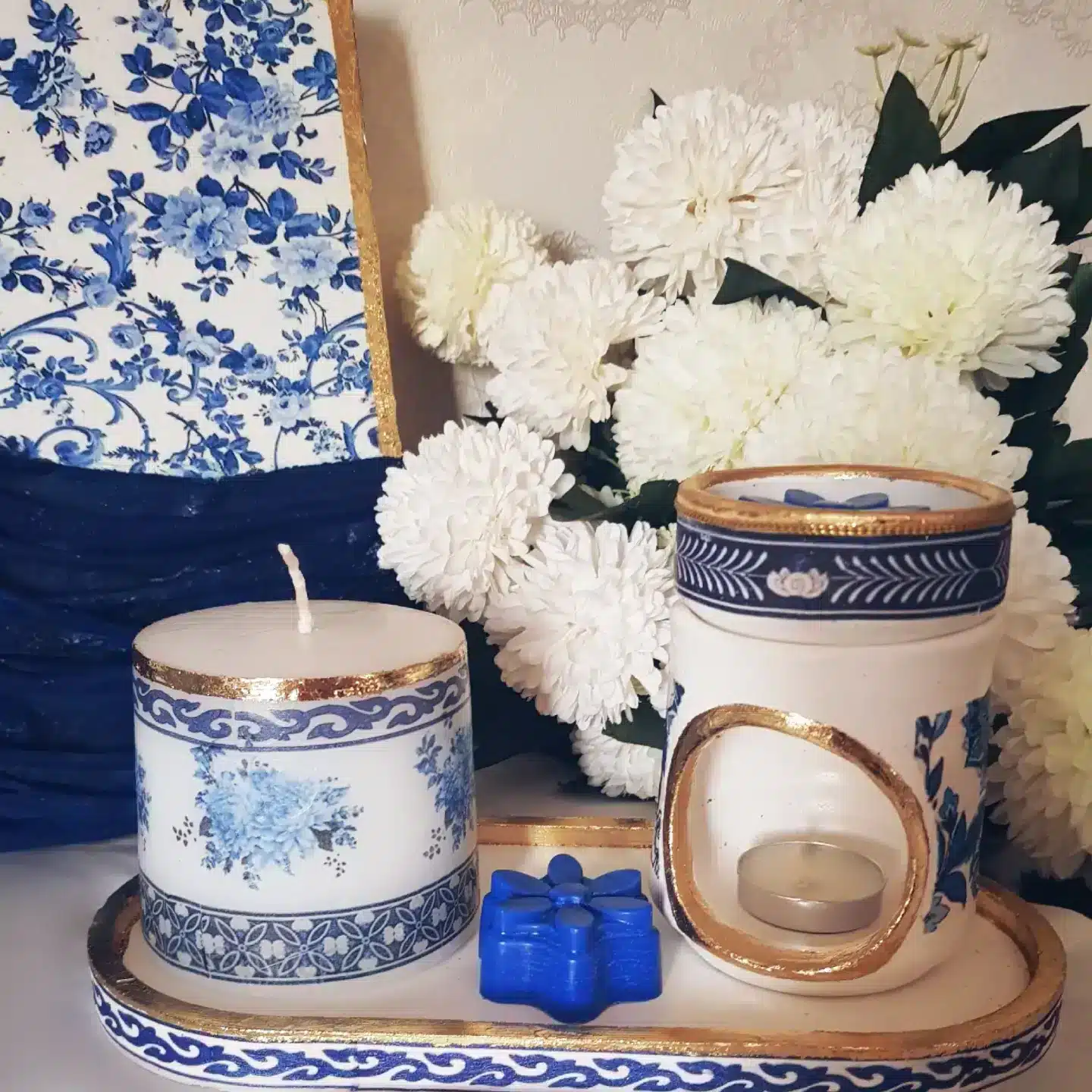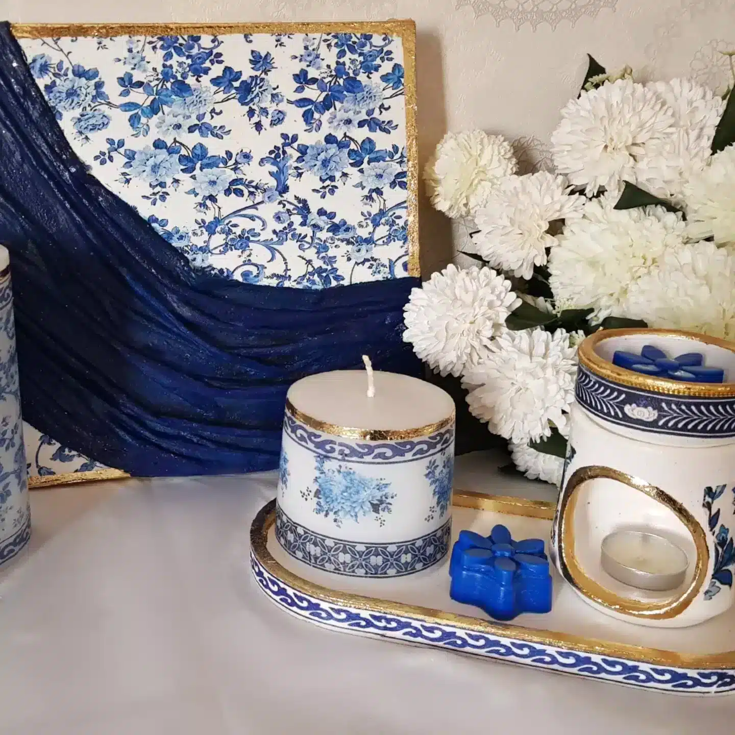 Set of 3 candles, candle diffuser, oval coaster and small painting with blue blanc pattern