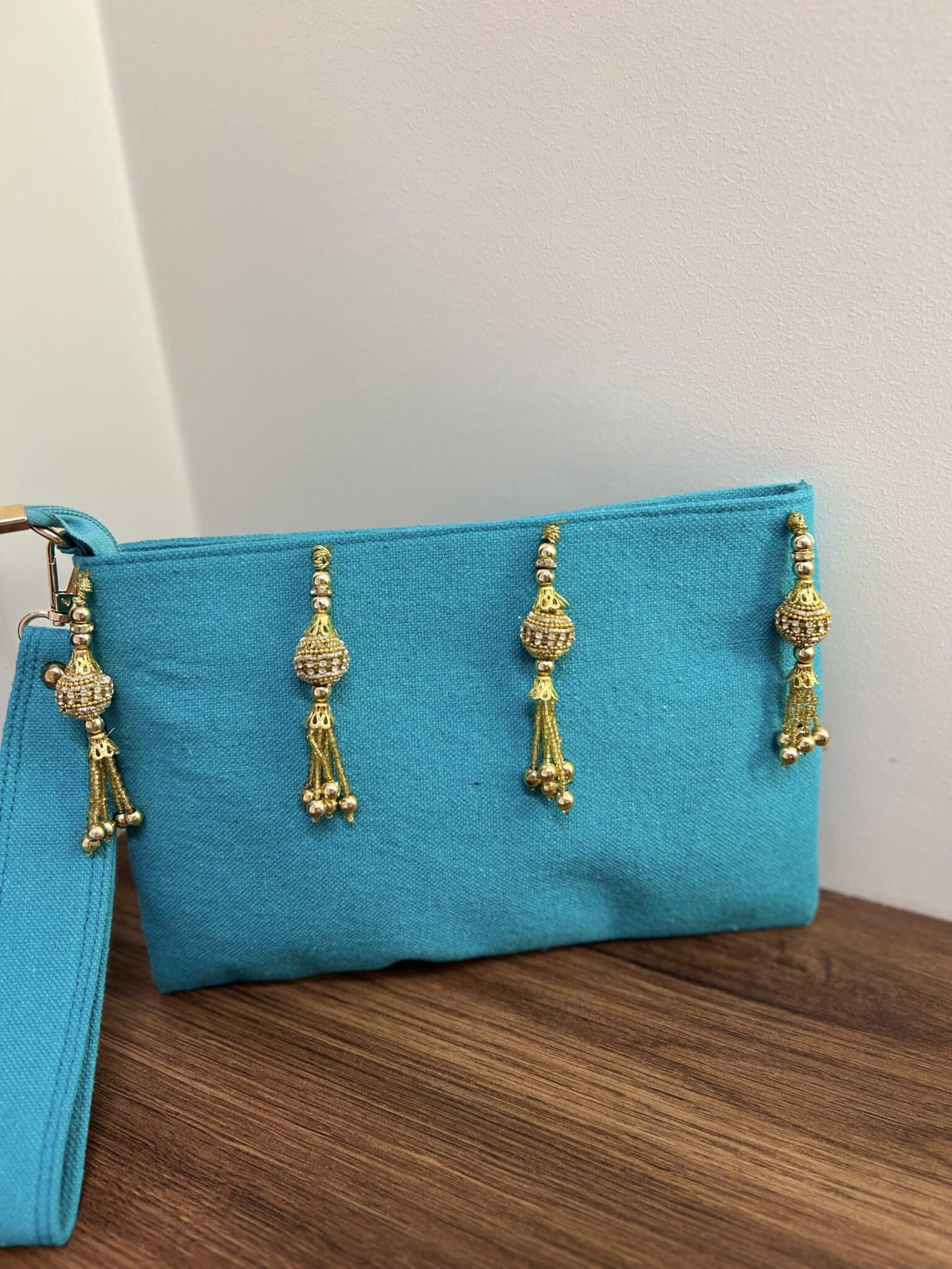 Baby Blue canvas clutch with Indian tassels