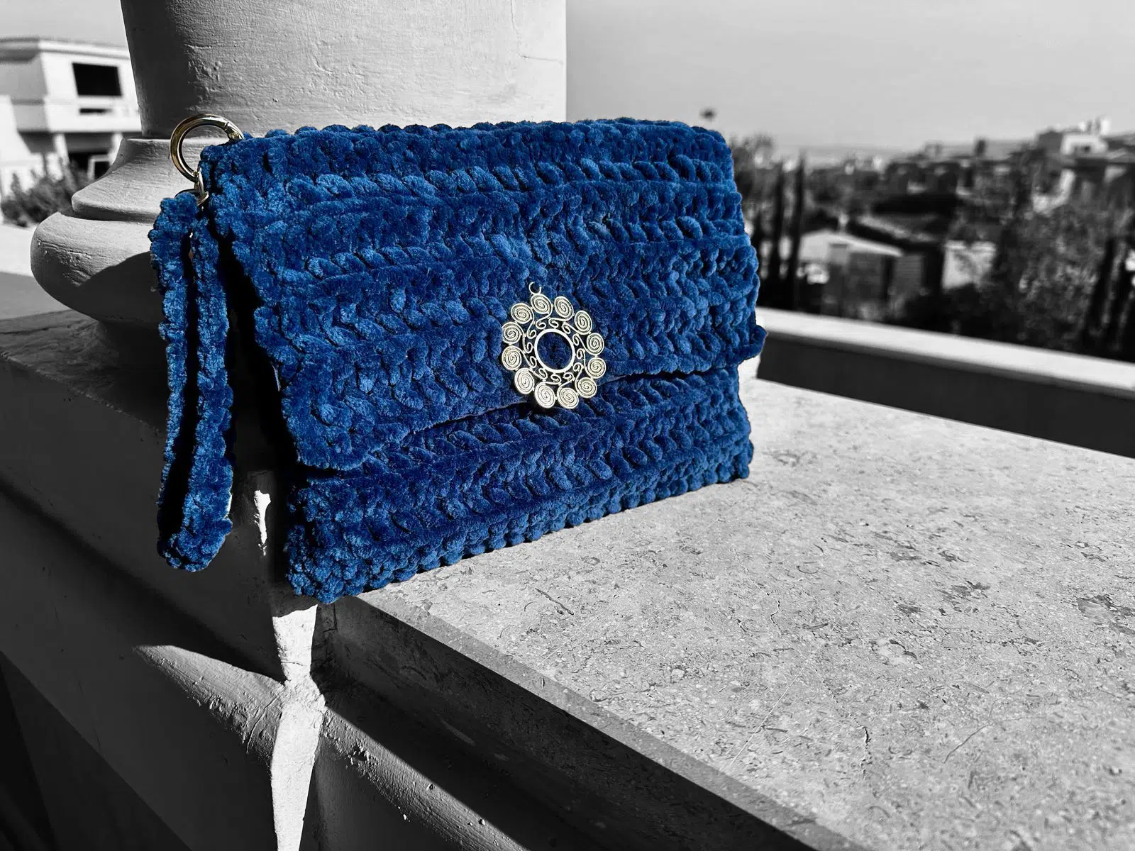 Blue velvet crochet clutch with a catchy metal applique giving it an oriental look.Suitable for ramadan outings.