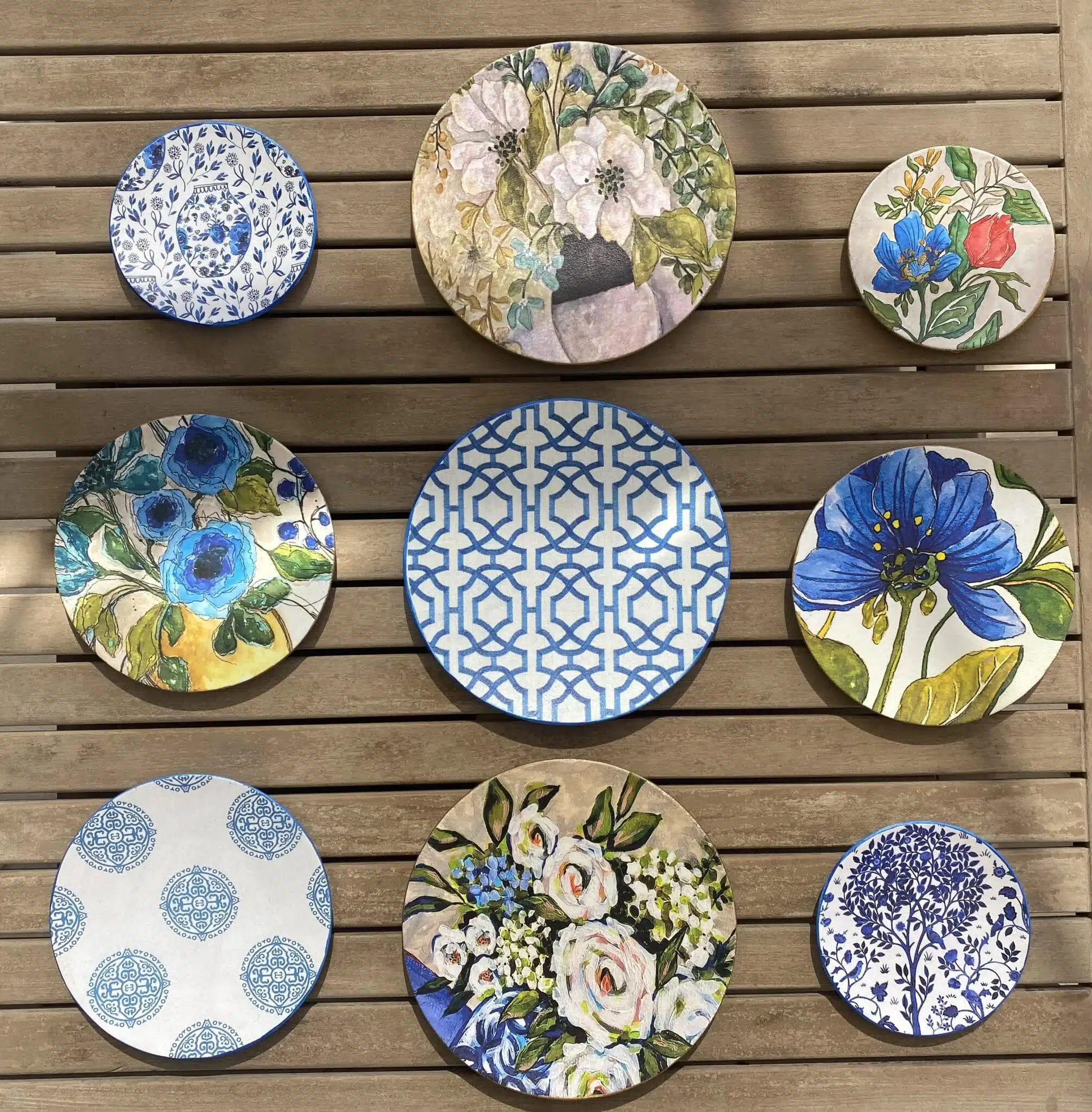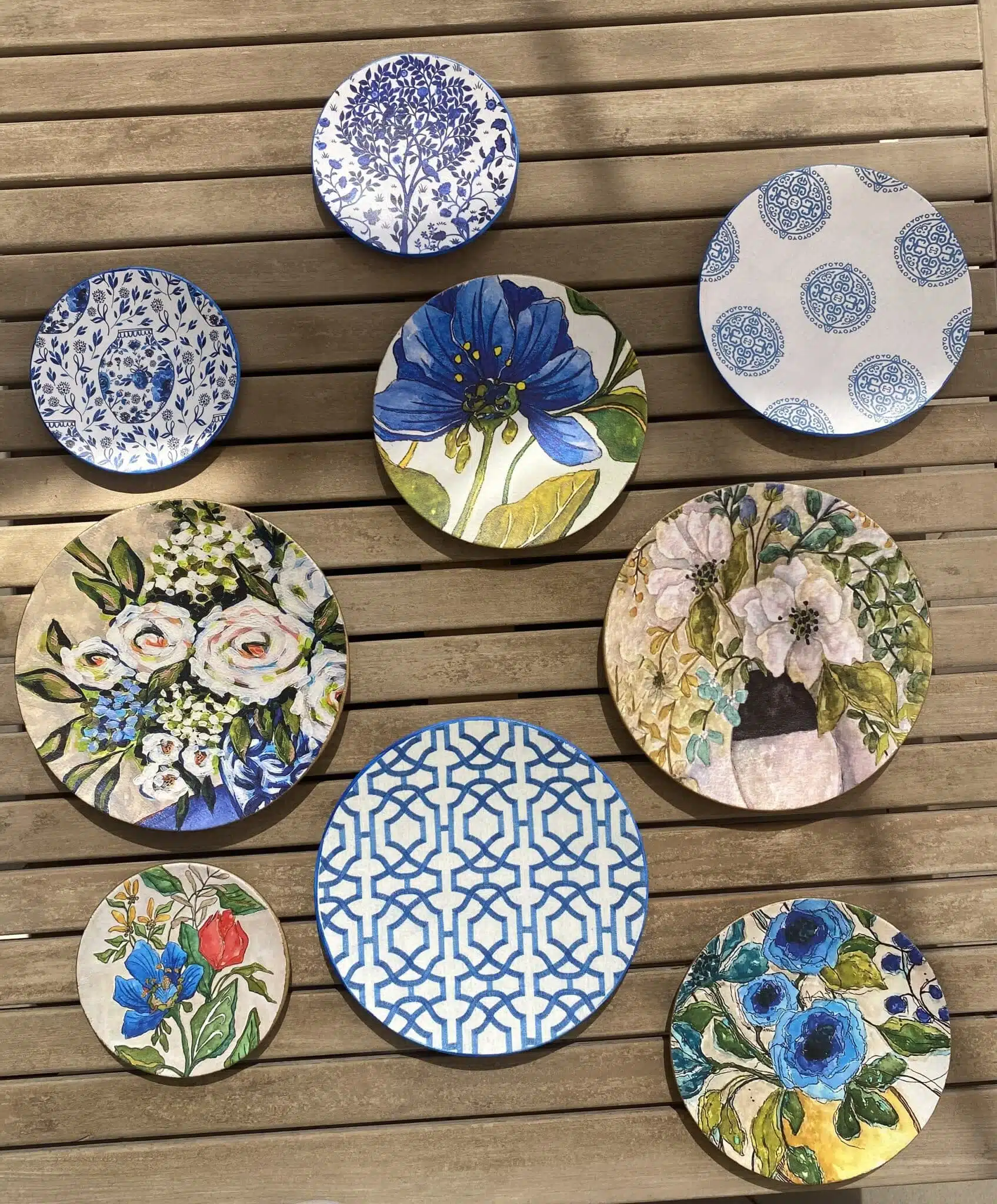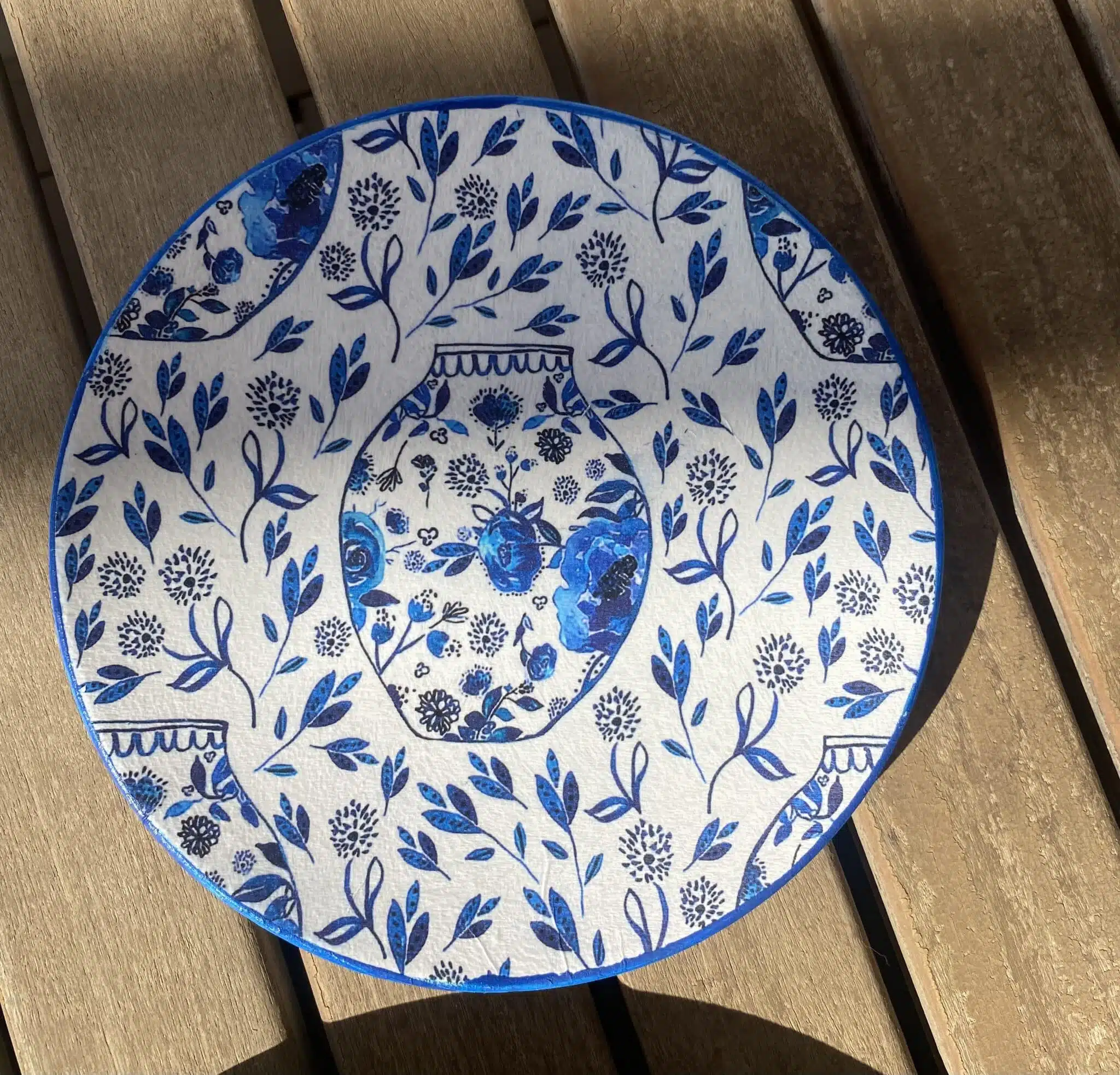 Decoupaged Porcelain plates in blue flowers theme