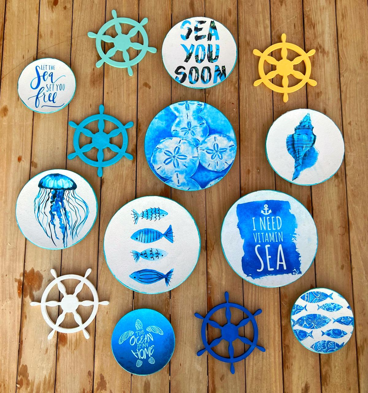Decoupaged porcelain wall plates for summer with the option to be mixed with wooden wheels