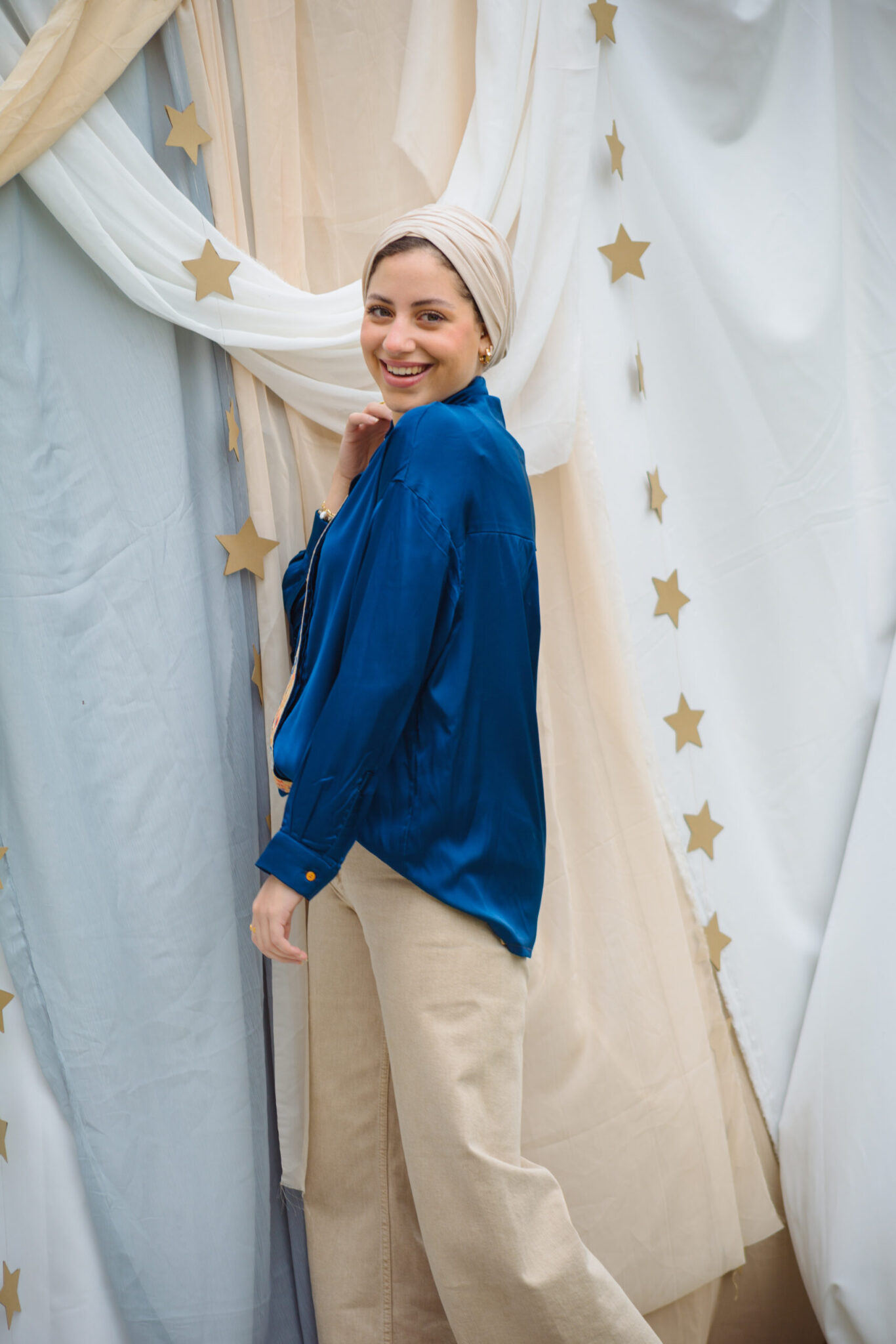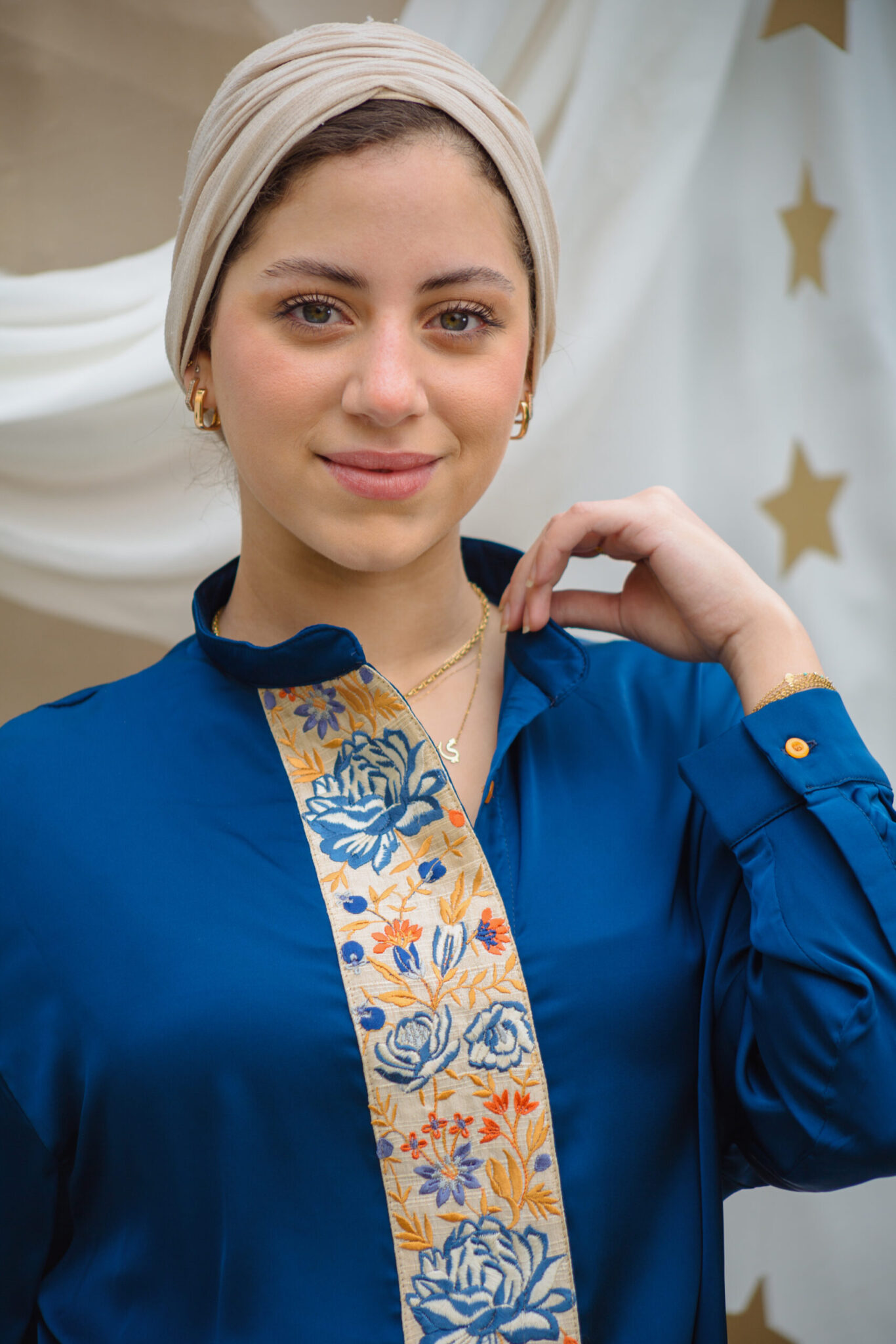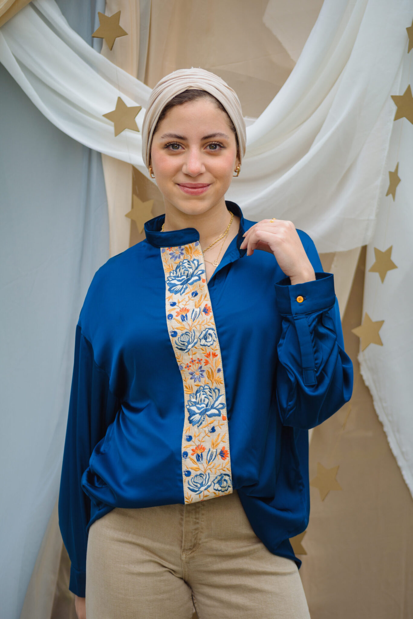 Blue silk satin blouse with blue roses lace