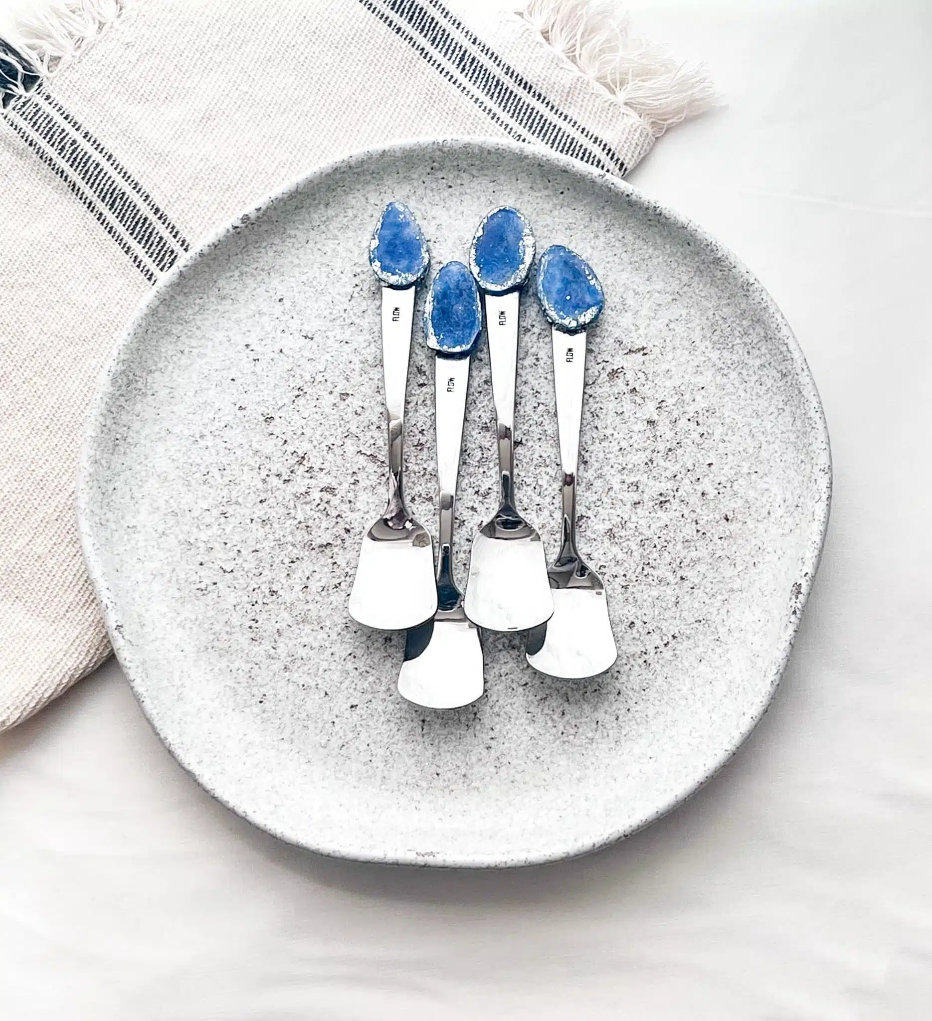 •Stainless-steel ice cream spoons set of 4, with a handmade crystal of epoxy resin & surrounded with silver leaves