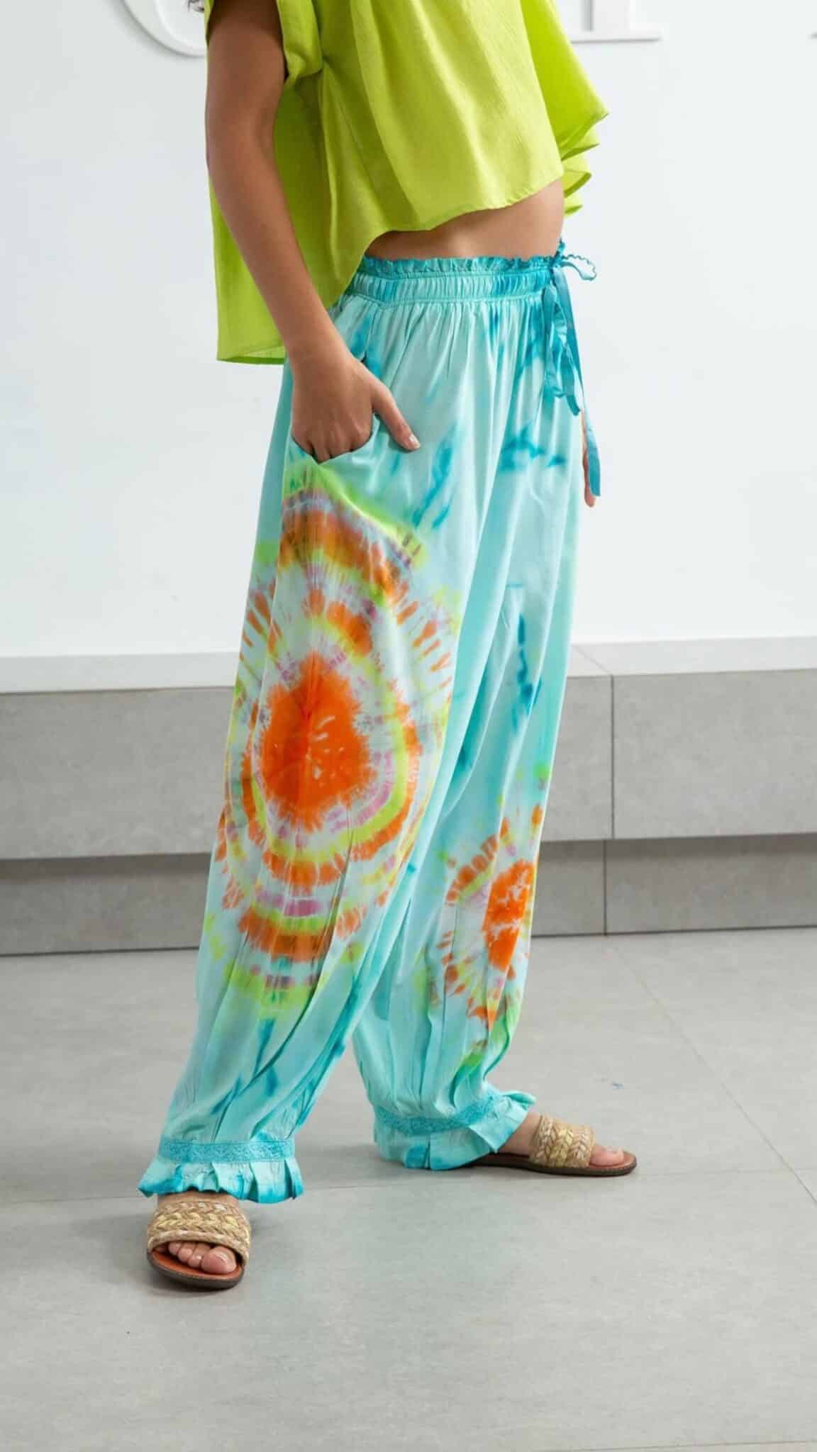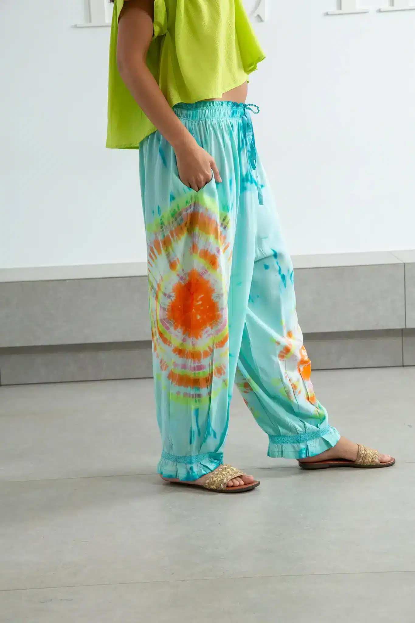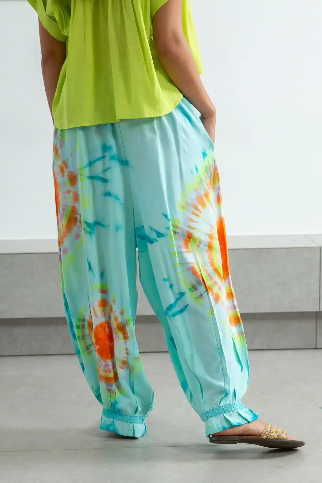 Alladin pants with elastic adjustable waist and ankle accessory, pockets