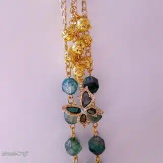 Made of irregular shaped chip gemstone beads in blue turquoise colour mixed with golden stones and Chinese gold chain