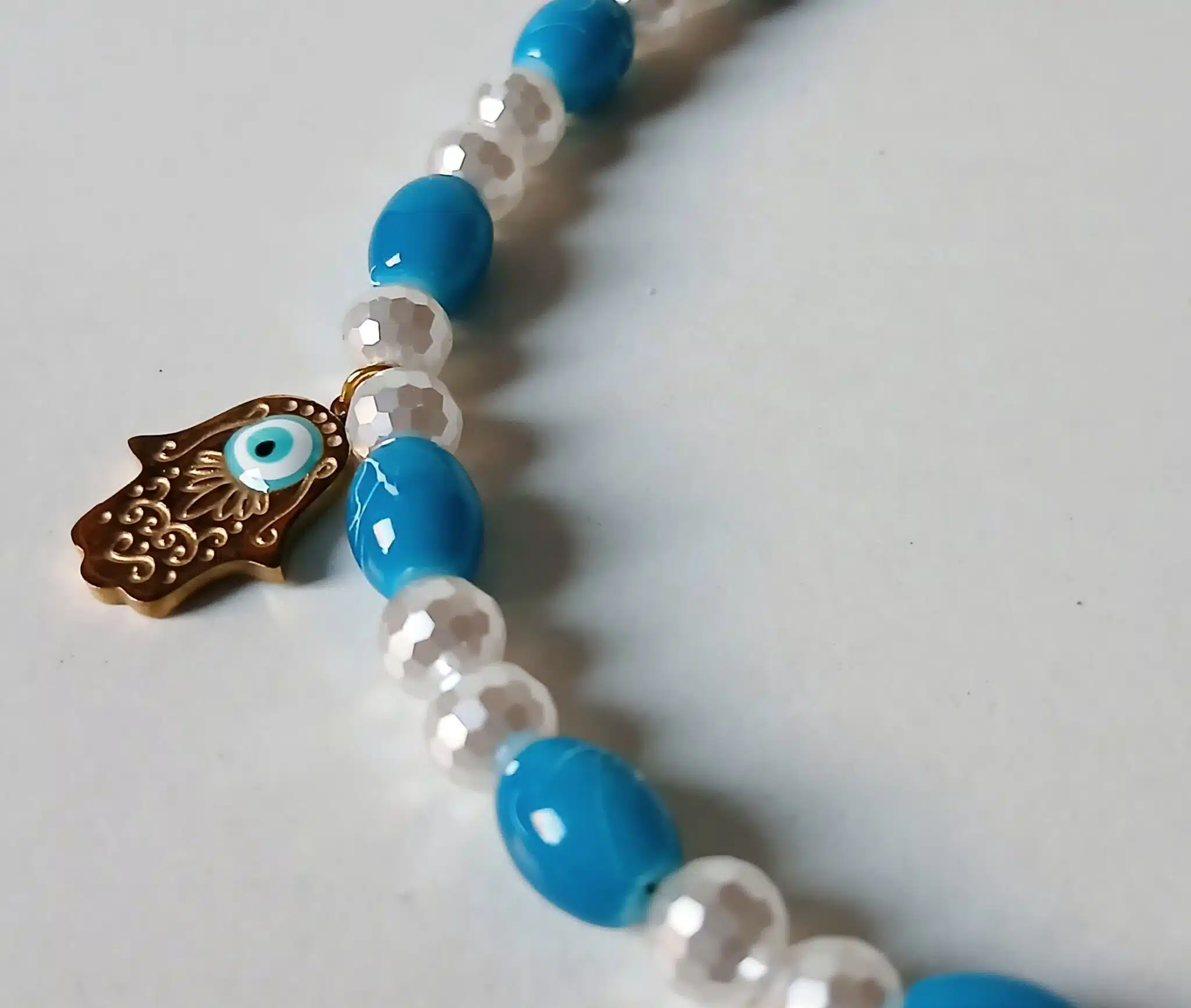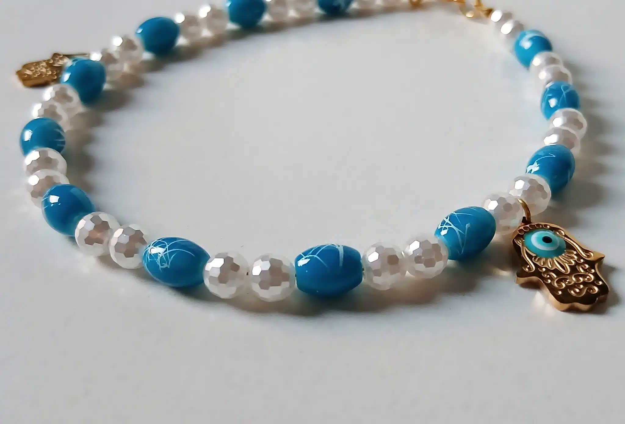 Anklet made of blue/white stones mixed with pearl stones and two hamsa pendants