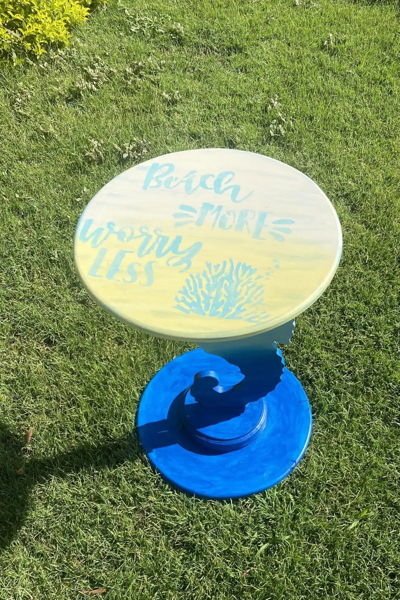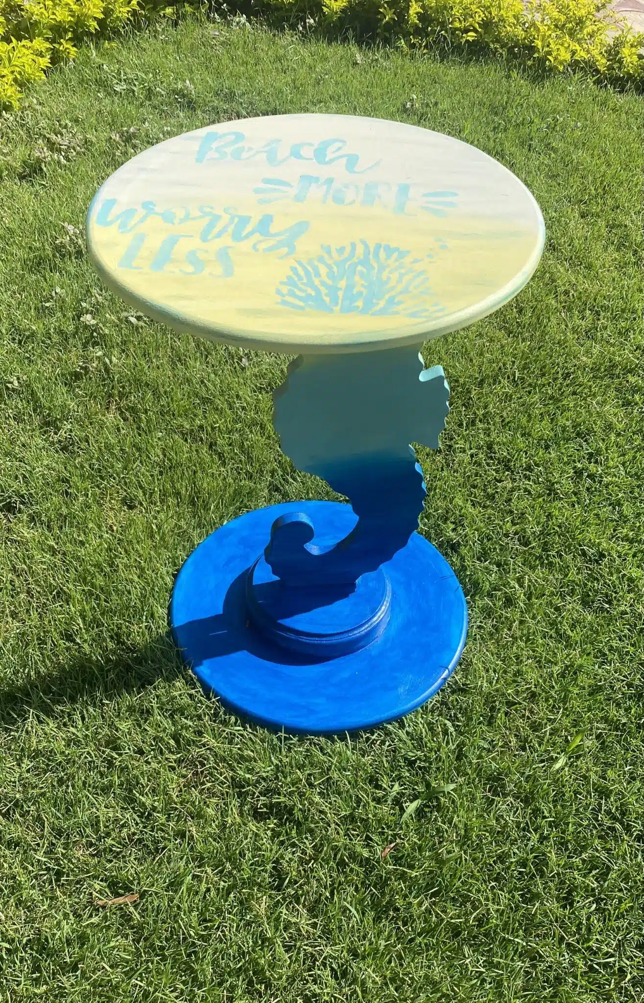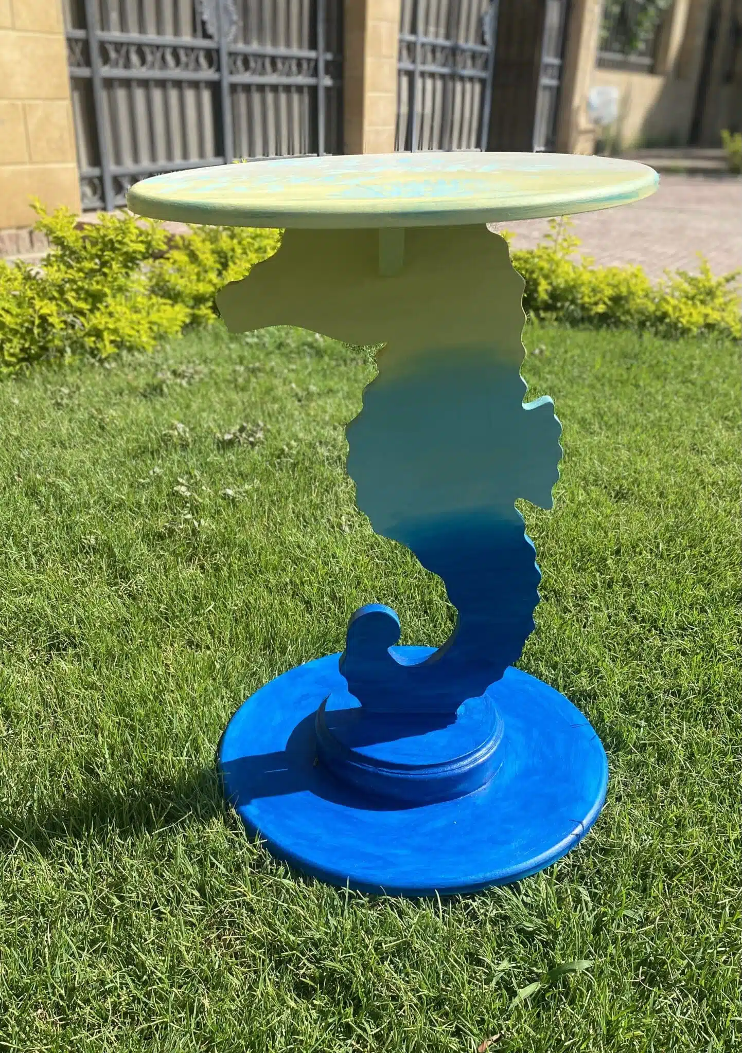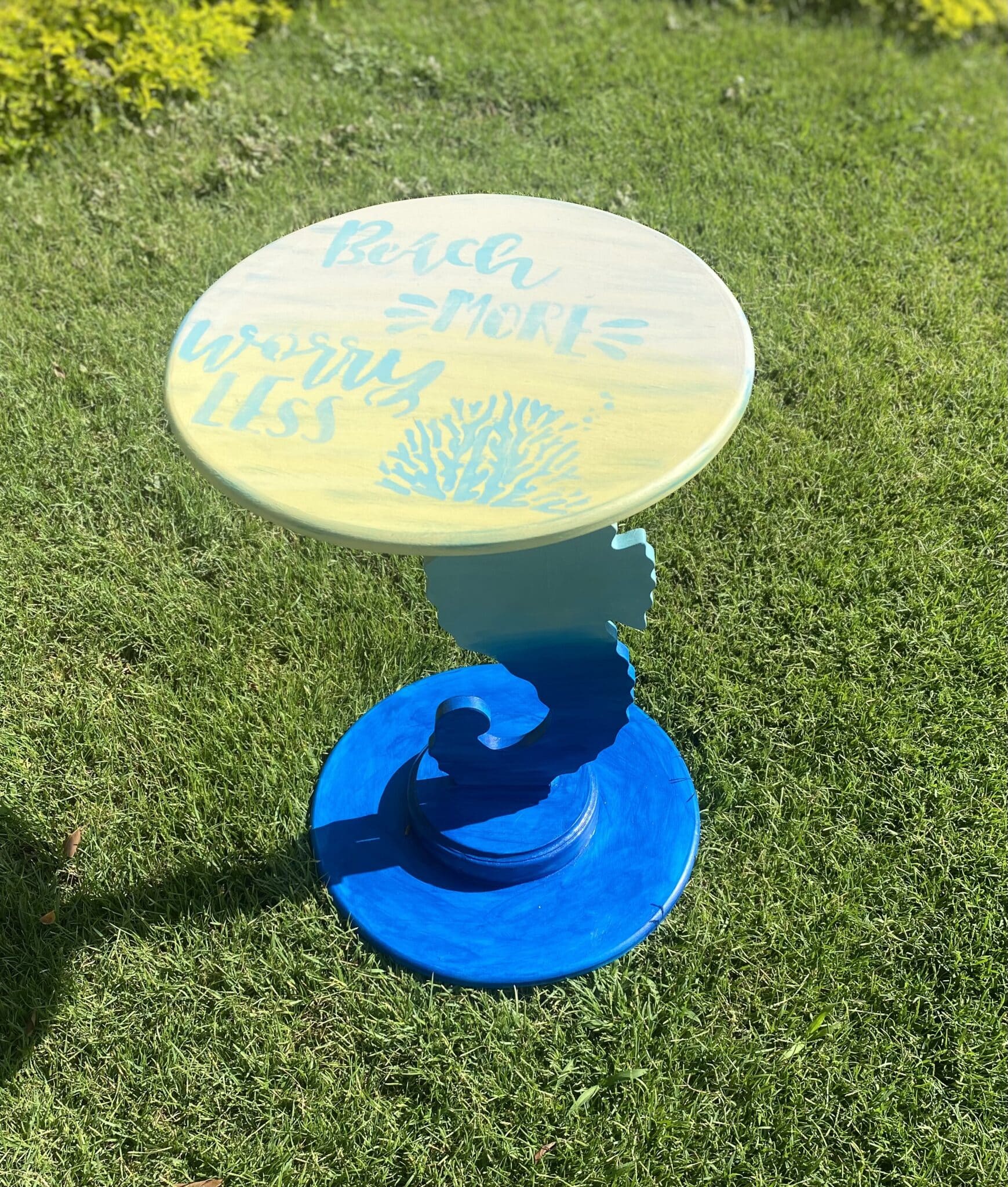 Wooden sea horse side table in summer colors blue x yellow