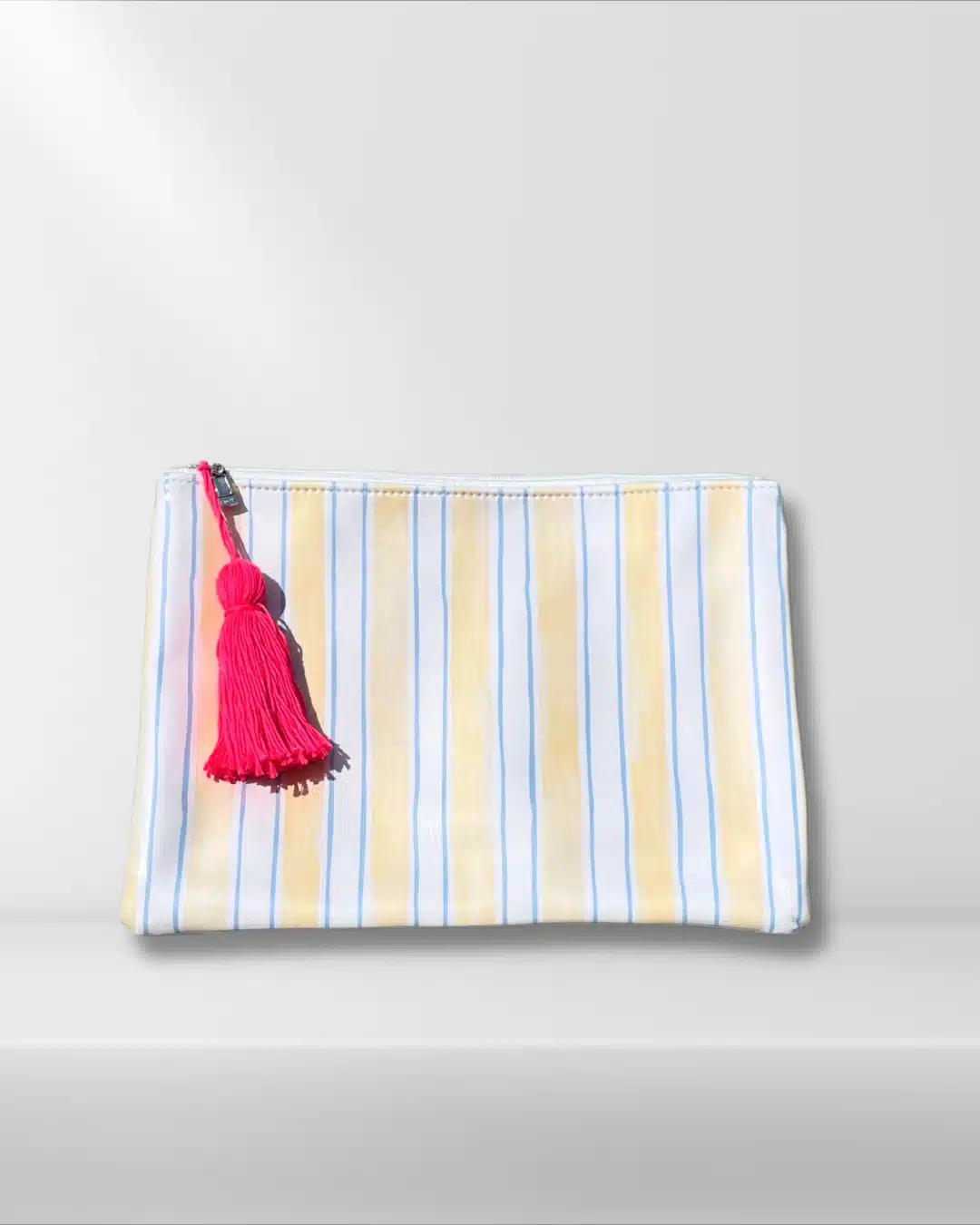 Plastic Wrapped Pouch size 25x35cm , in blue yellow & white striped pattern with fuschia tassel,