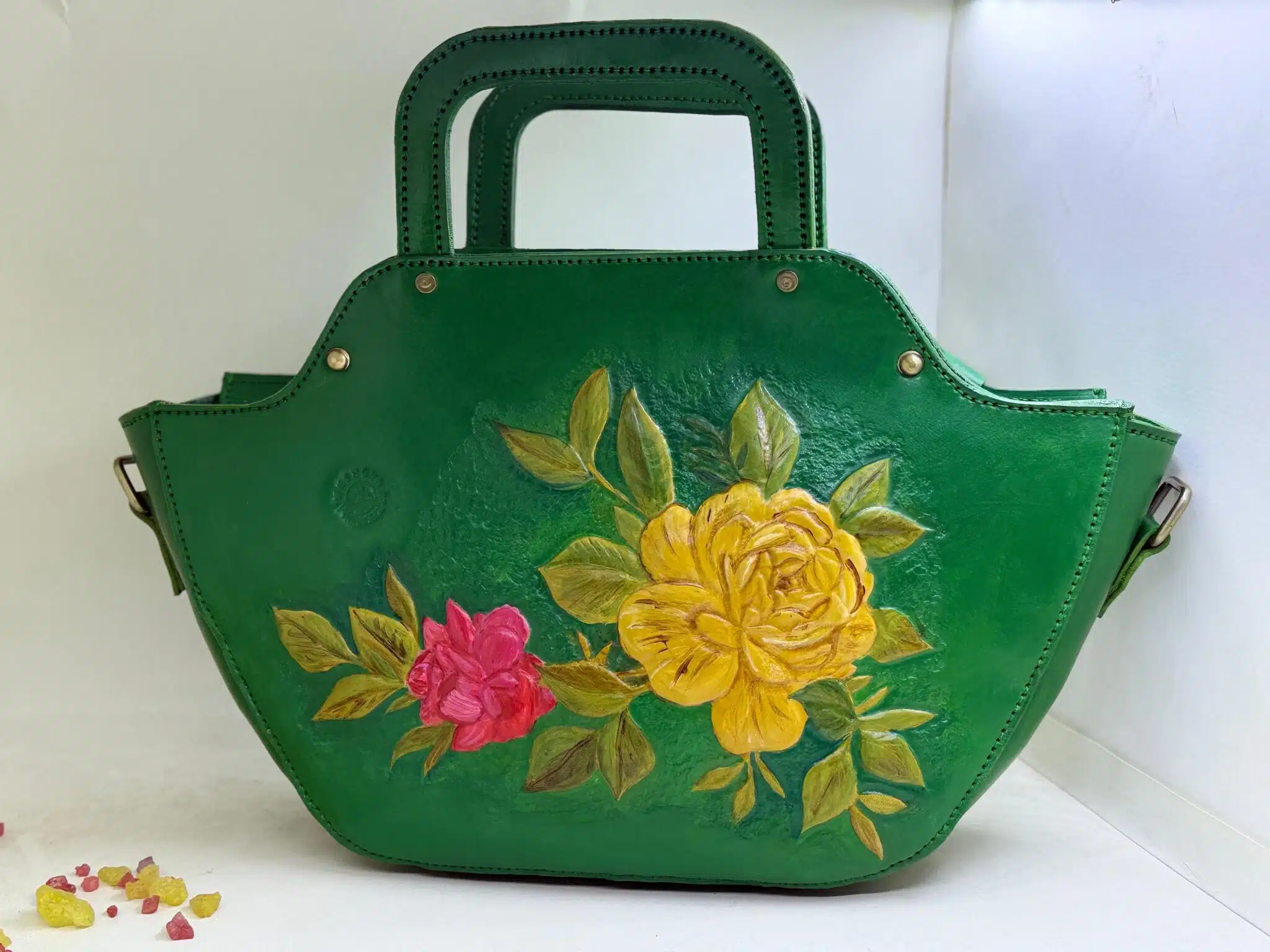 A distinctive genuine leather bag, entirely handcrafted using the embossing and engraving technique, featuring cheerful designs and colors that will lift your mood.