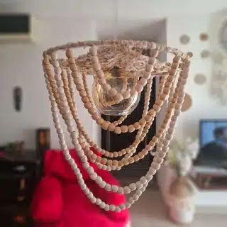 A boho-style hanging lamp with layered fringe. It gives off a soft, cozy light and adds a relaxed, artistic vibe to any space.