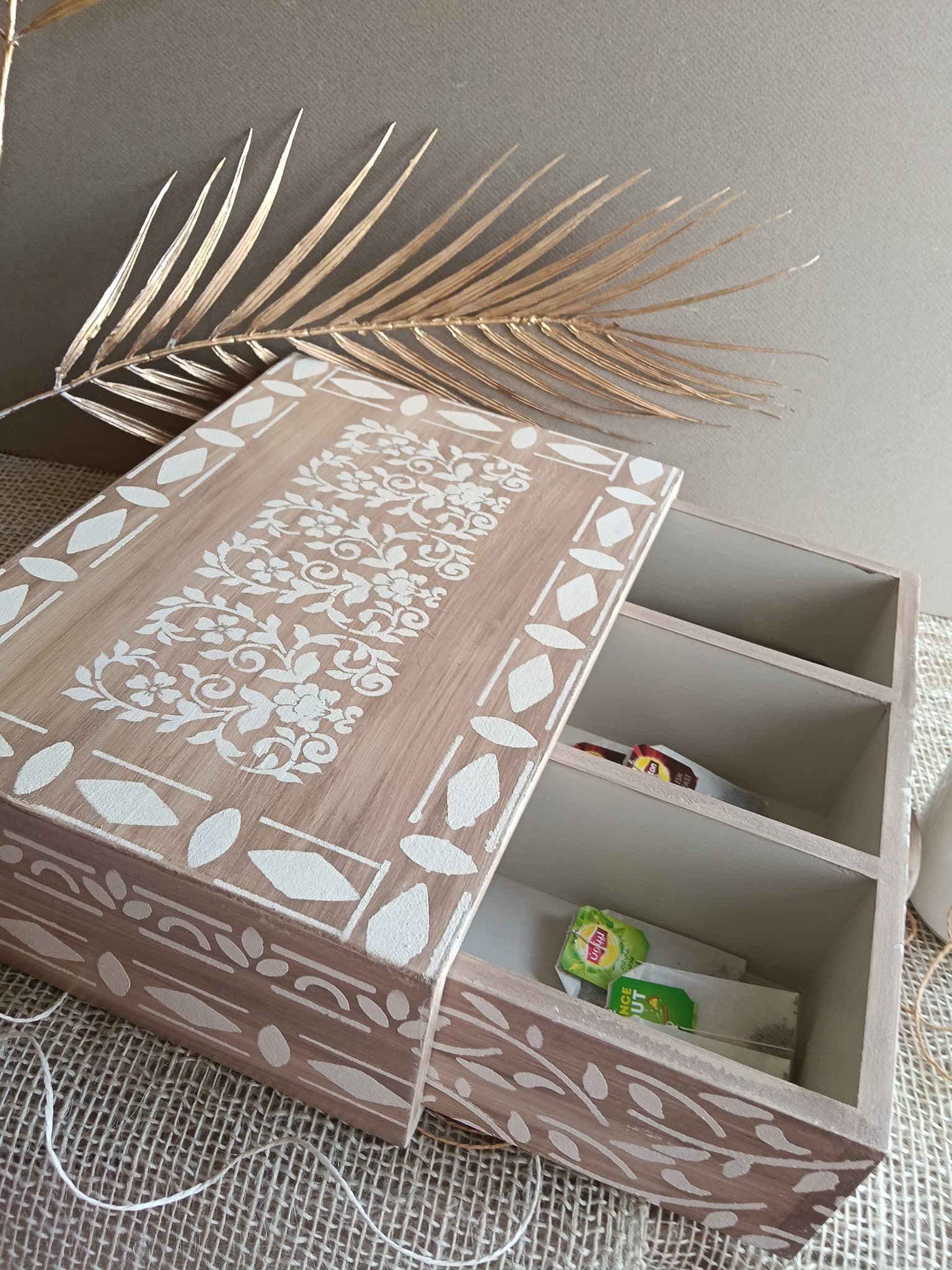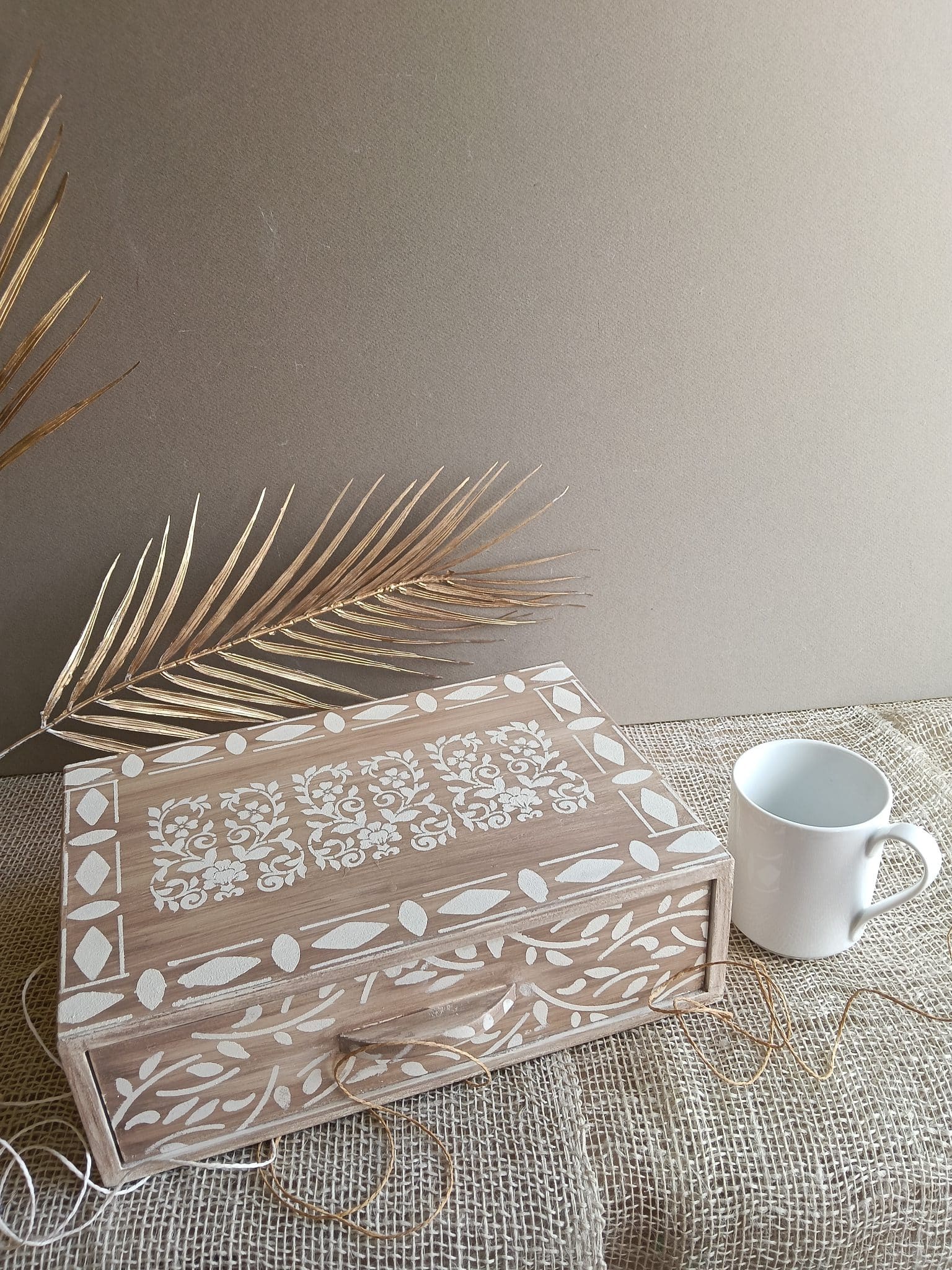 Tea box with a drawer size 30*20 ,the bone inlay patterns give it the boho look