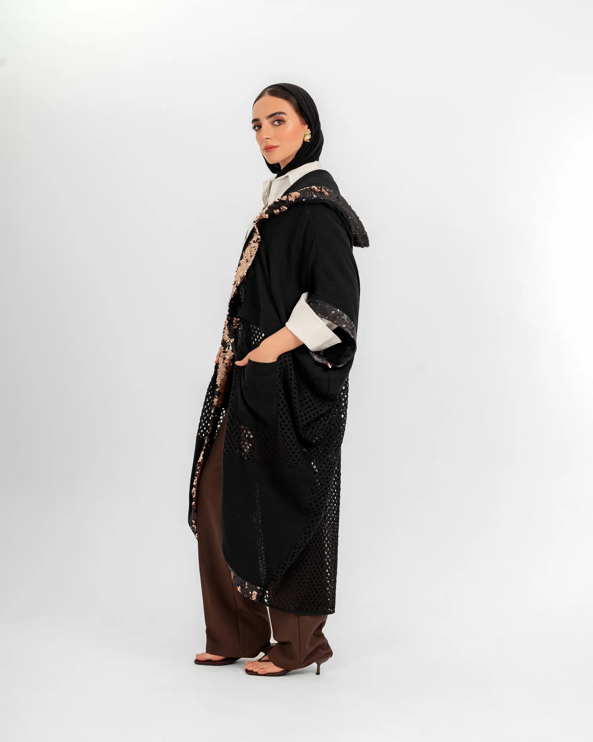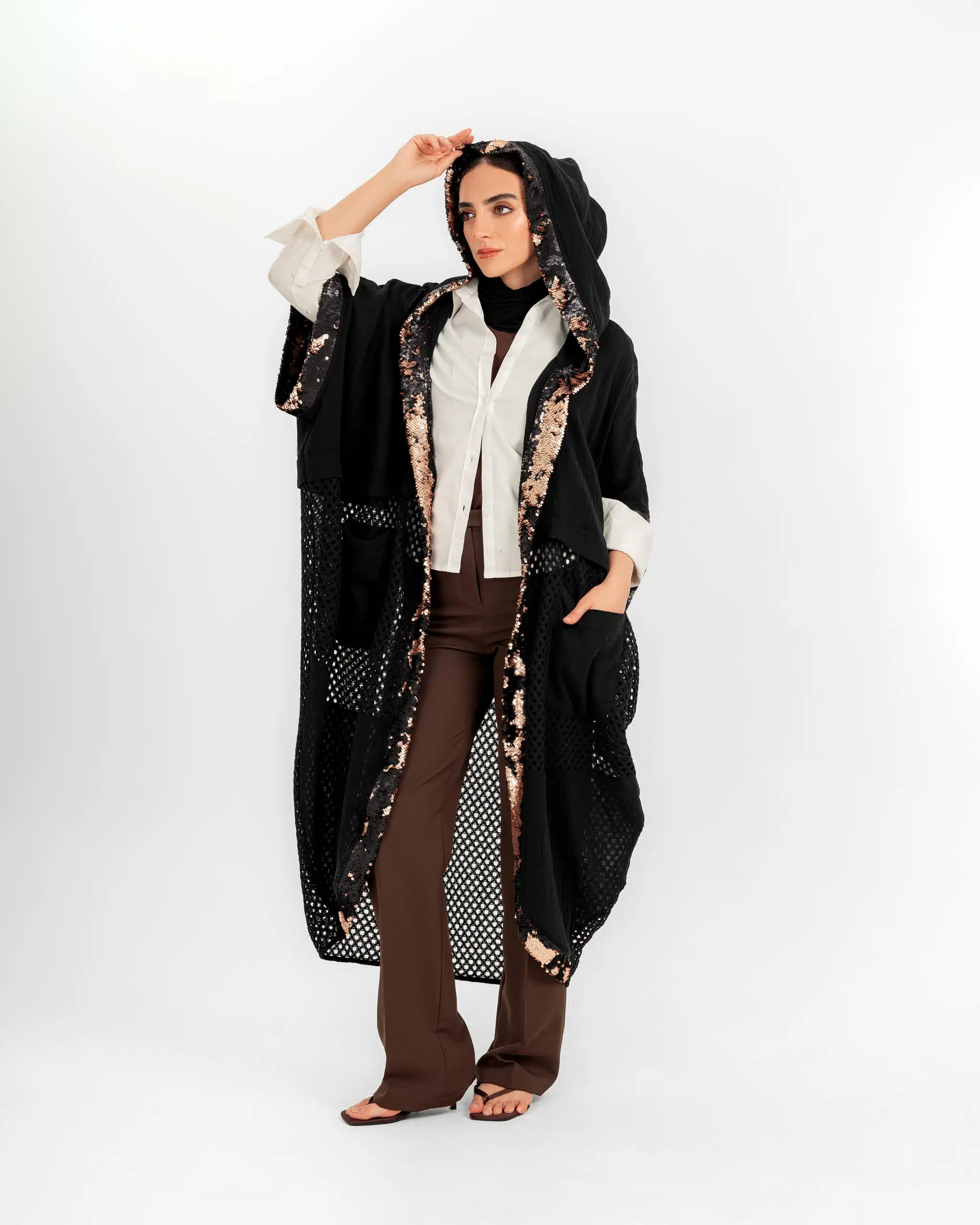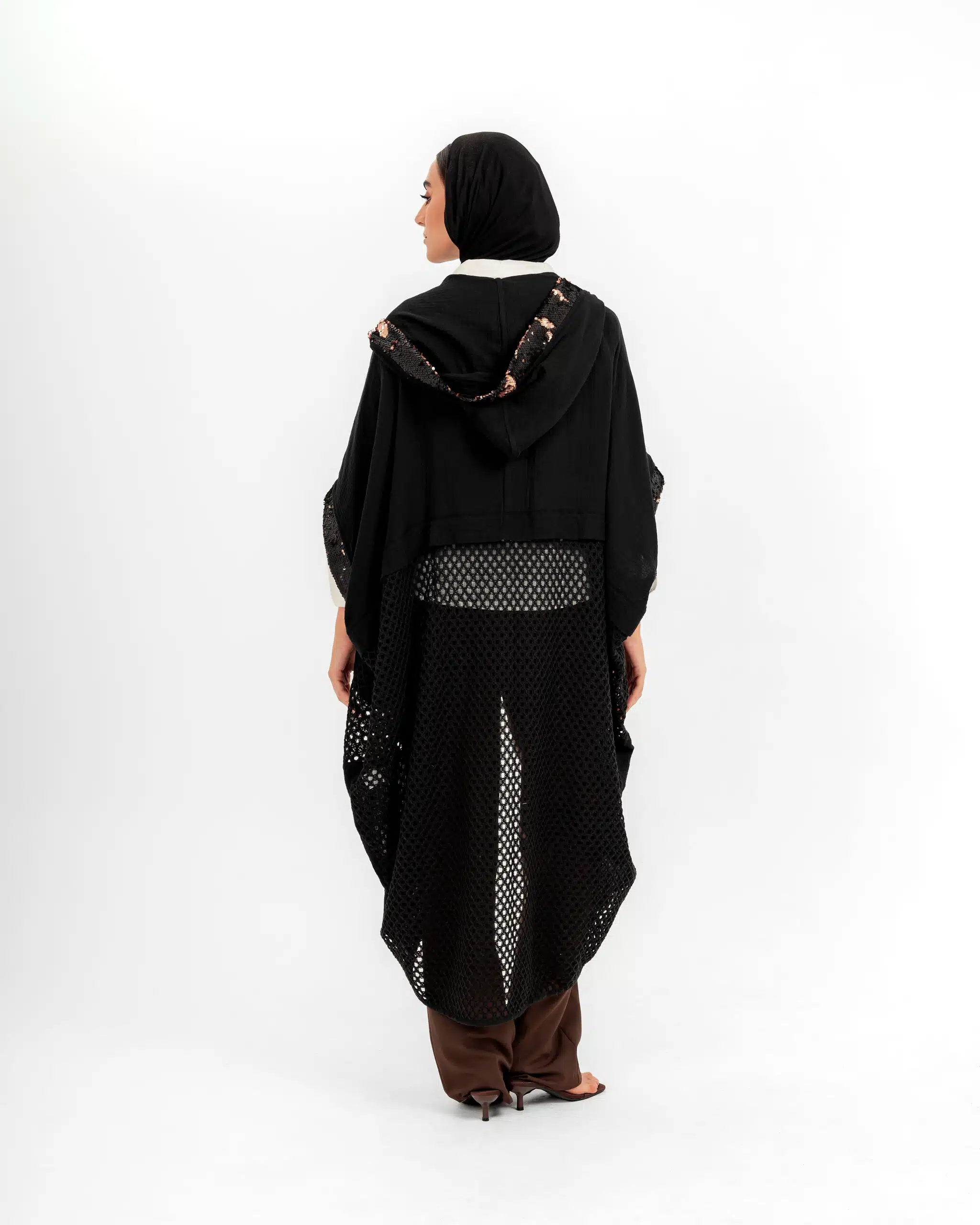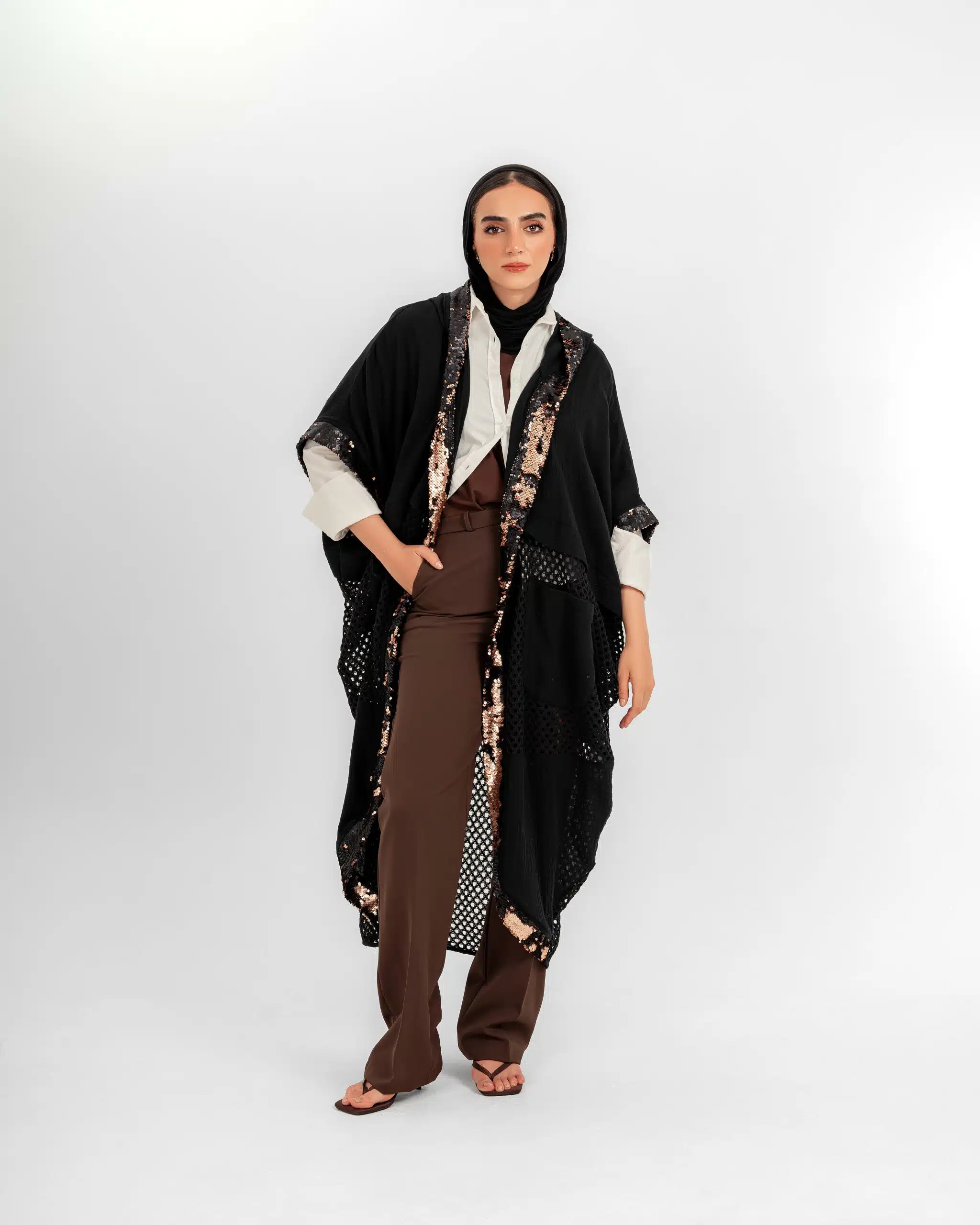 An effortless charm of bohemian charm and timeless elegance. The flowy open-front piece features mesh, subtle shine, and generous drape- perfect for layering with confidence.