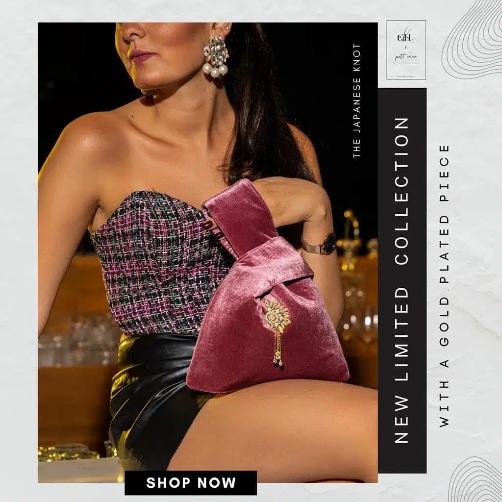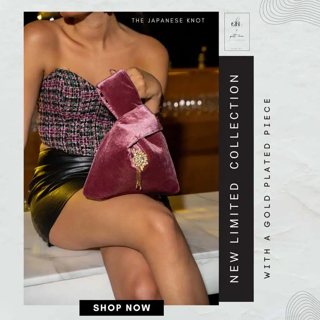 Bois de Rose Japanese Knot Wristbag, in rich Velvet Material , tailored with inside satin lining, and our signature yellow gold-embedded piece with purple stones, by CH by Christine Habib Azer,