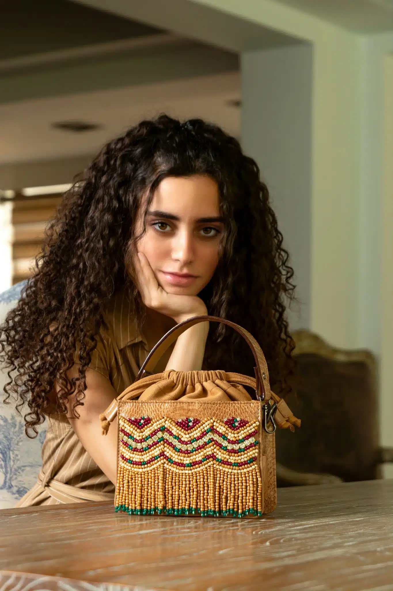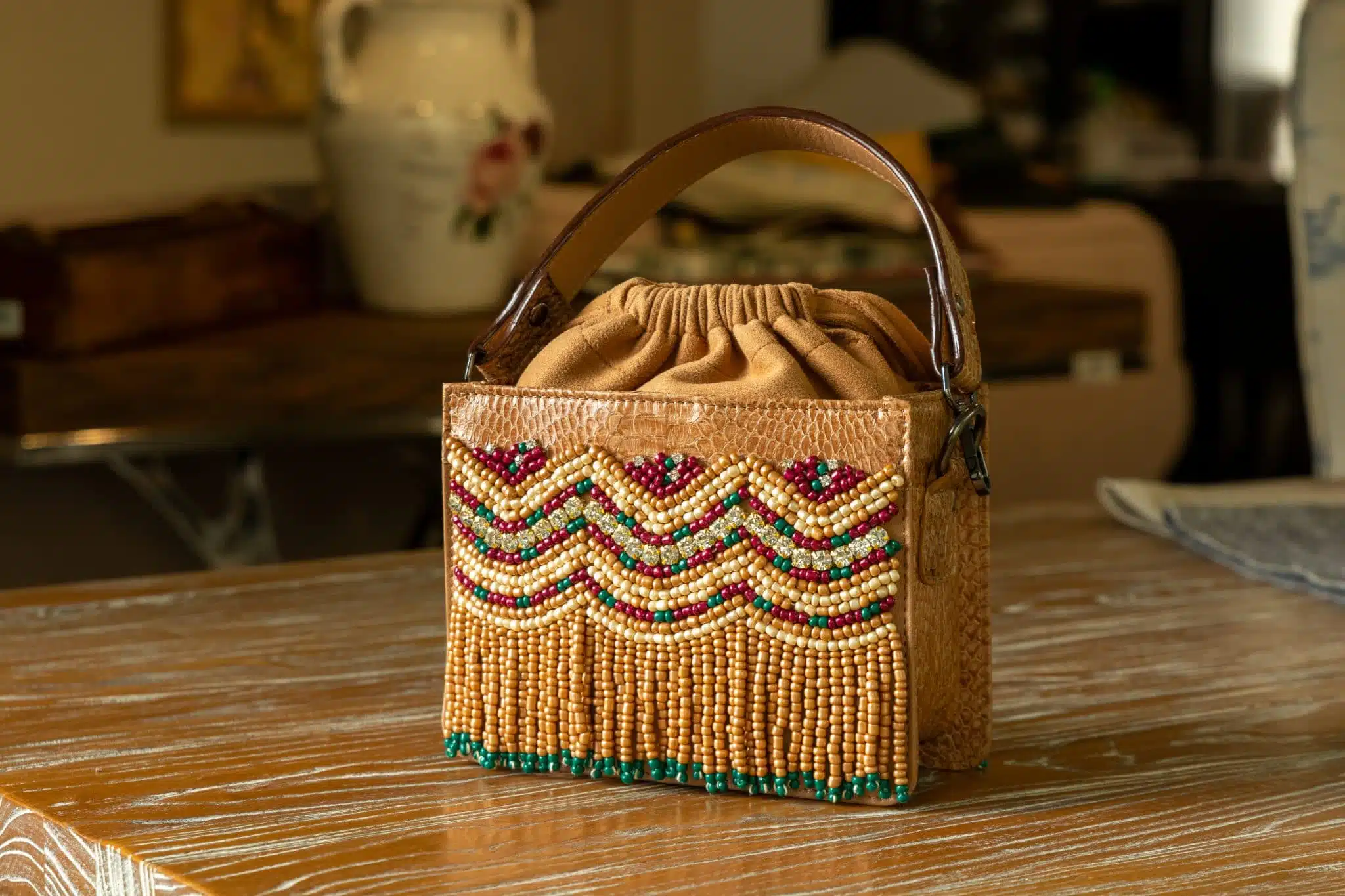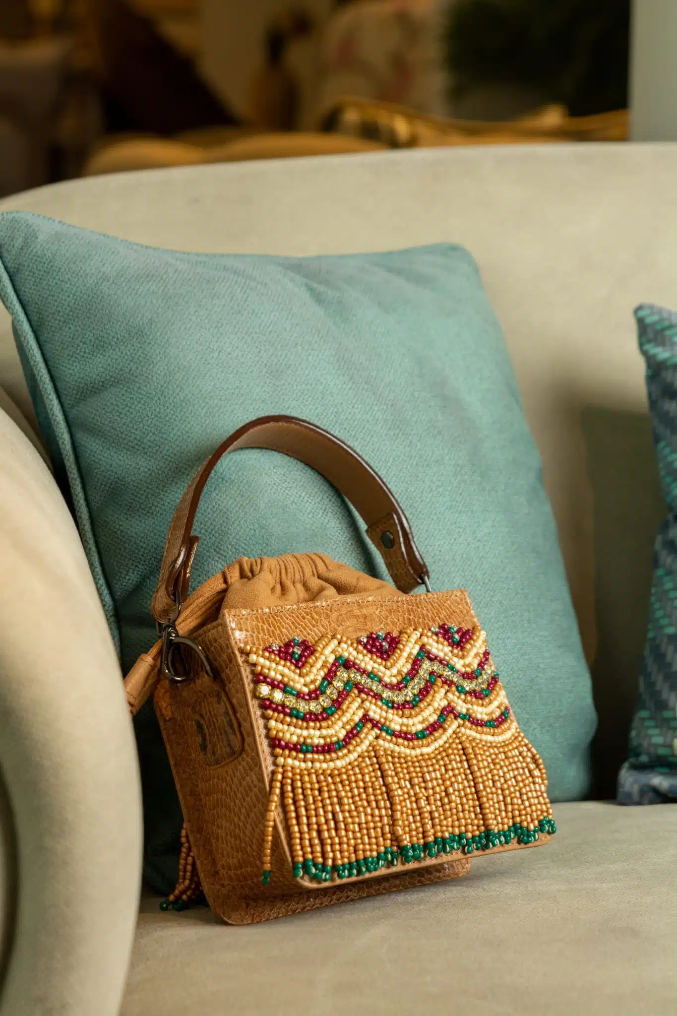 (Bonbon) Bag in beige python skin is hand-embellished by skittles beads & diamonds..so each unique piece may vary slightly from the next.