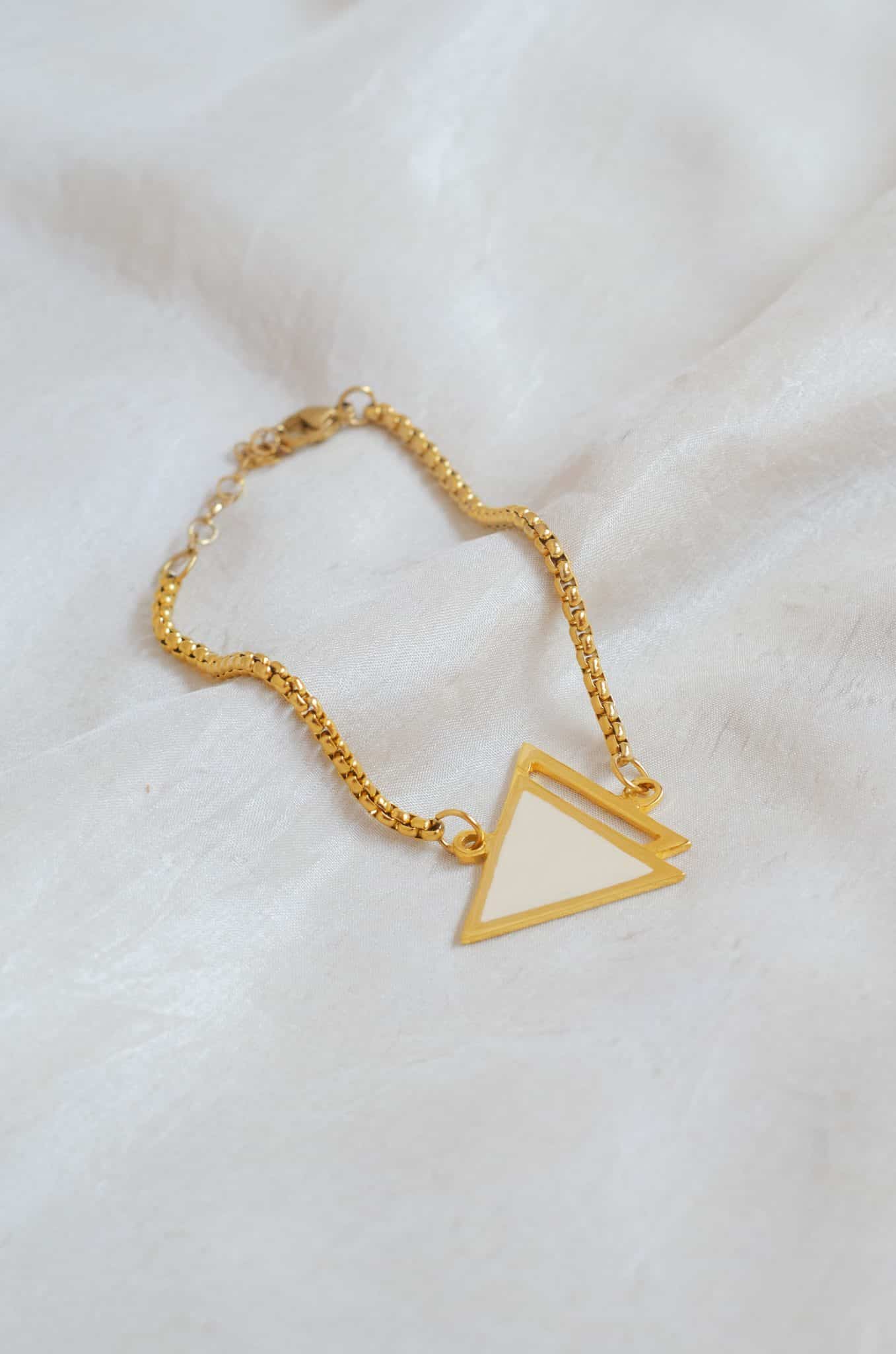 The Pearl Tuya bracelet , Inspired by The Great Egyptian Pyramids by the designer “Toka Nabil”. Material: Brass 21K Gold plated with a very high quality, Pearl Enamel color, hand made. Pre order will Take from 3-10 Days. No REFUND or EXCHANGE.