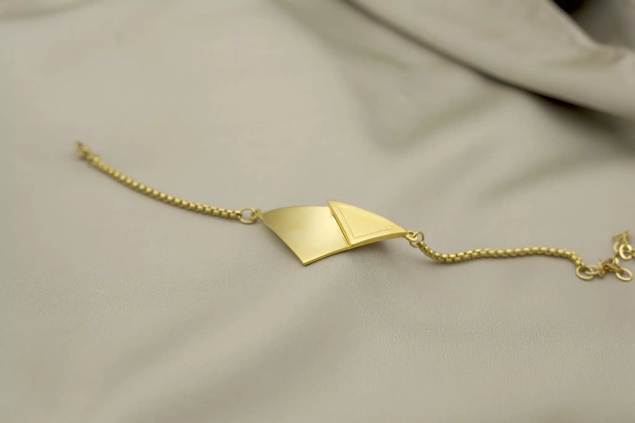 The Dojser bracelet, Inspired by The Egyptian Pyramids, by the designer “Toka Nabil”. Material: Brass 21K Gold plated with a very high quality. hand made. Pre order will Take from 3-10 Days. No REFUND or EXCHANGE.