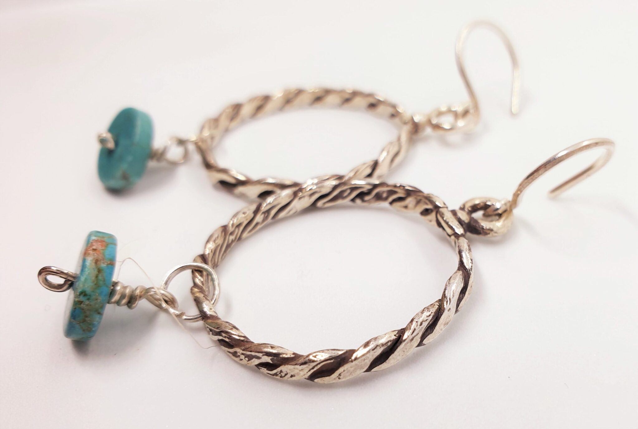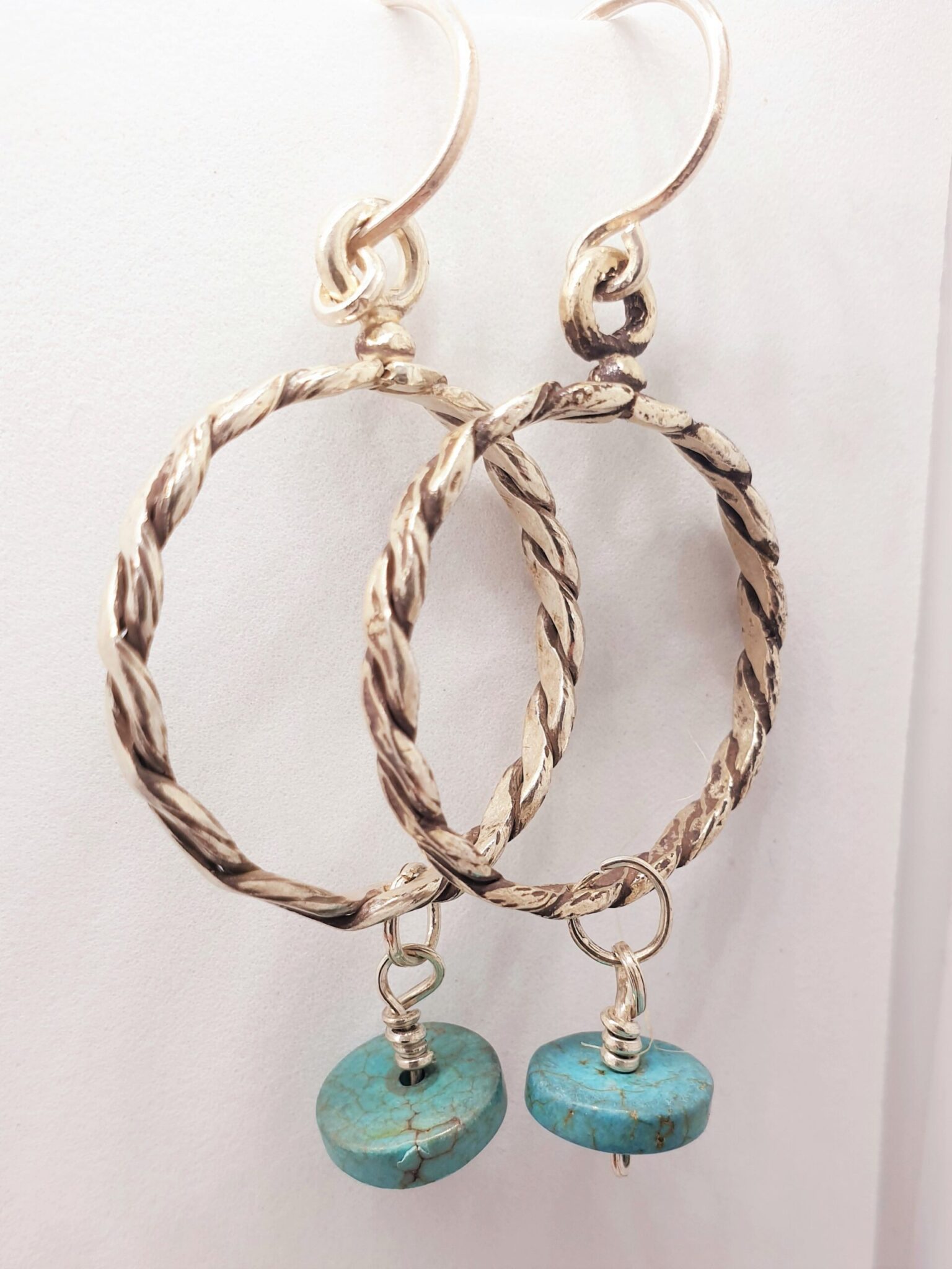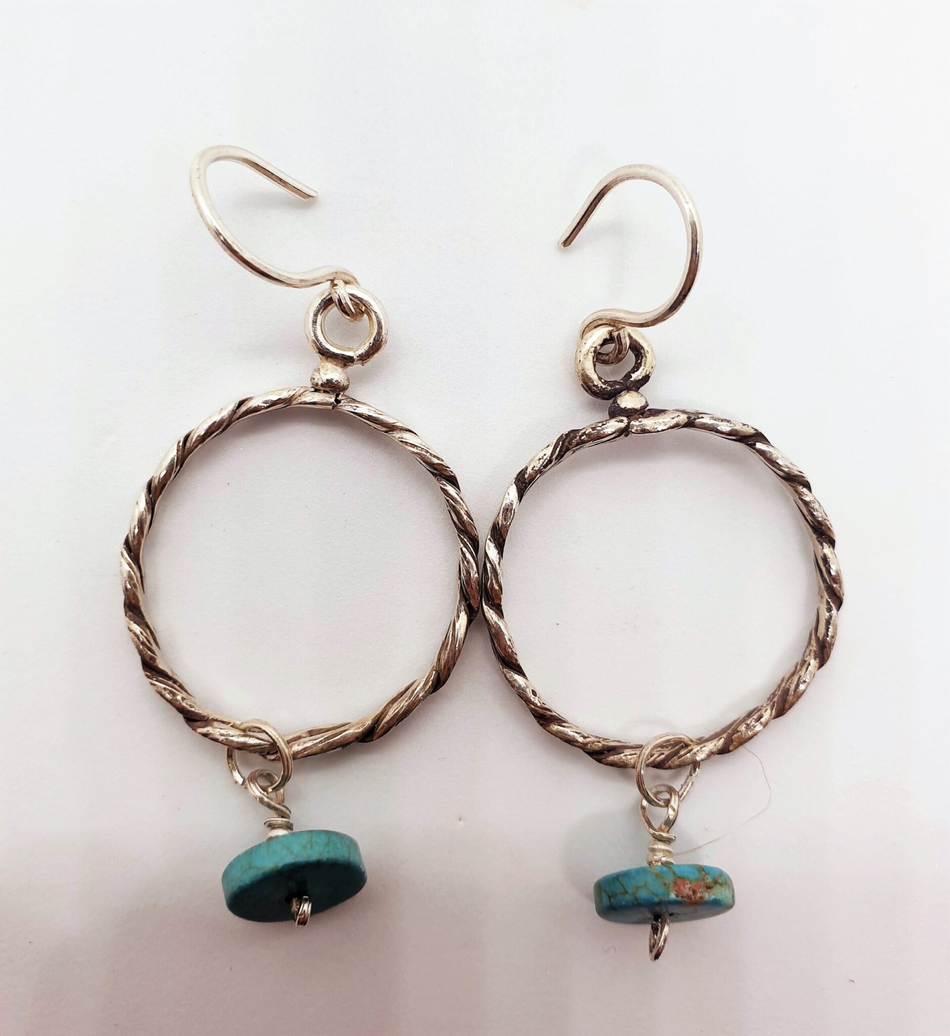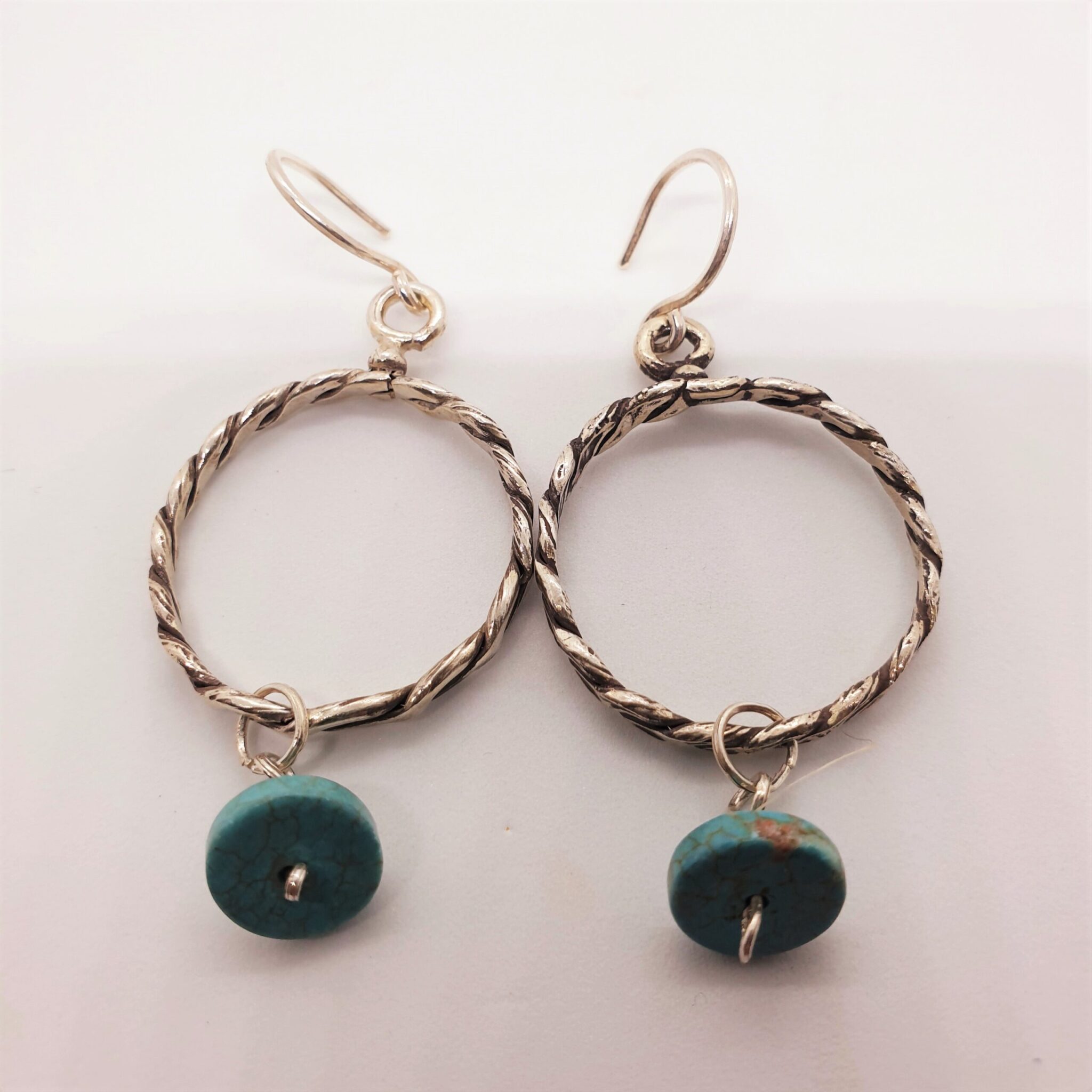 Braided sterling silver (925) earring with dangling flat turquoise stone.